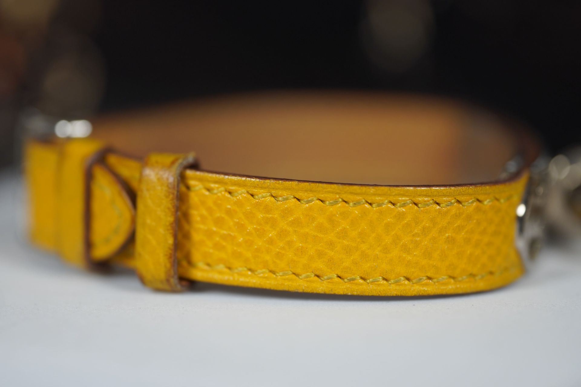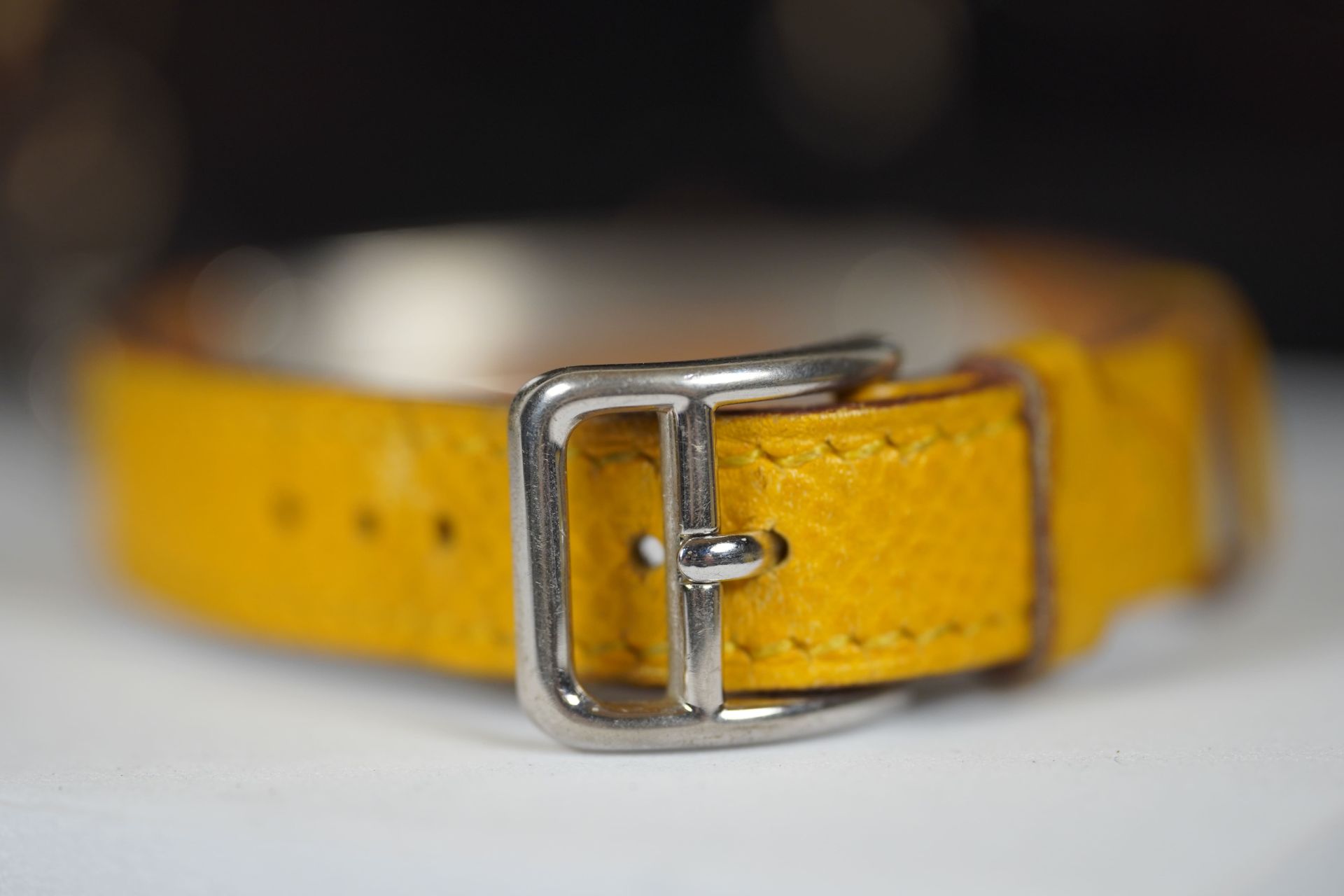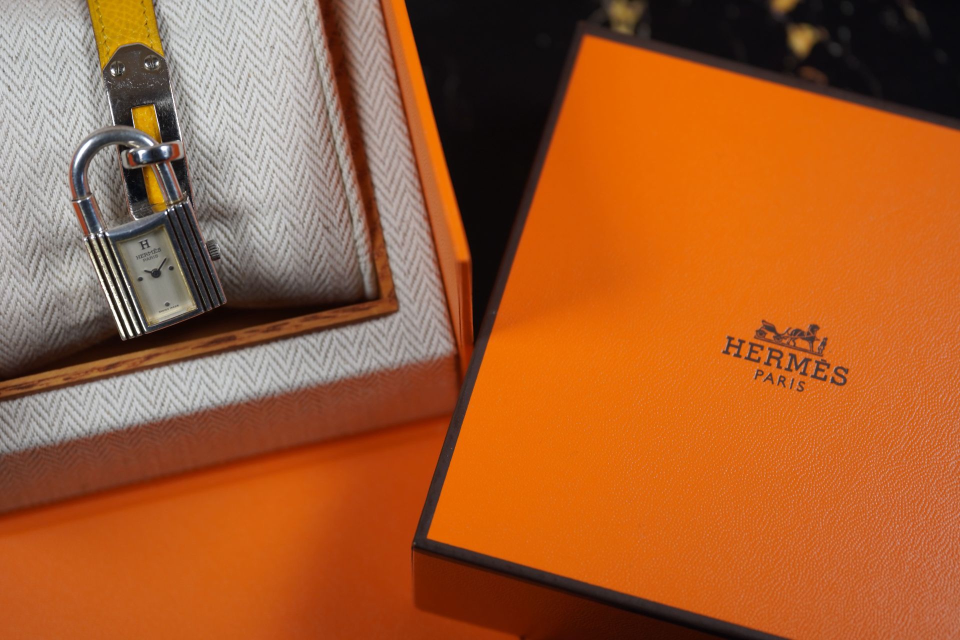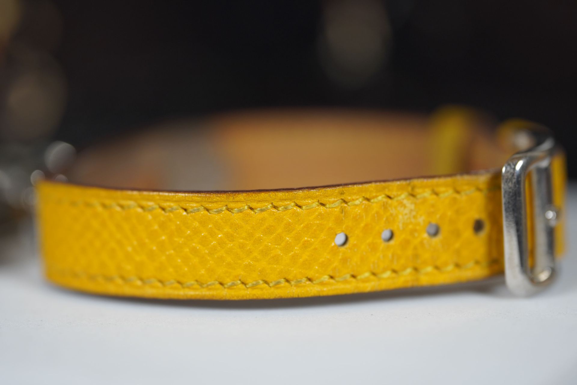Découvrez l’élégance audacieuse avec la montre Hermès Kelly, référence commerciale KE1.210. Cette pièce horlogère féminine iconique, dotée d’un mouvement à quartz précis, est présentée dans un boîtier en acier de 20 mm de diamètre et 8.6 mm d’épaisseur. Son bracelet original en cuir jaune éclatant, associé à sa boucle ardillon originale, renforce son caractère distinctif. Livrée avec son coffret, cette montre en bon état est une expression raffinée du style Hermès, offrant une allure incomparable au poignet. Nous offrons une garantie de 12 mois pour cette pièce d’exception.