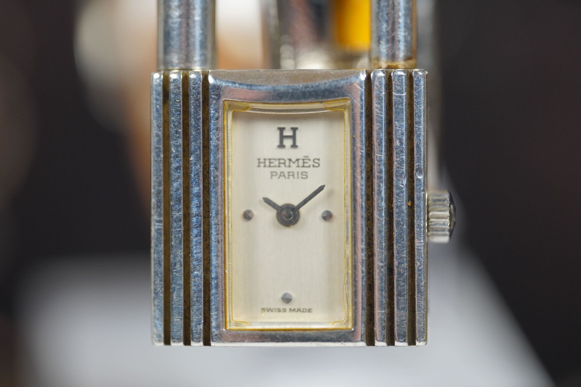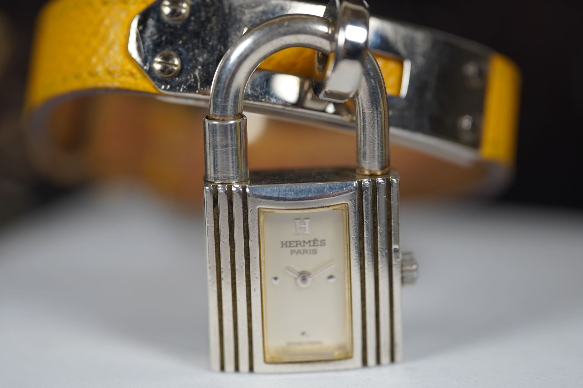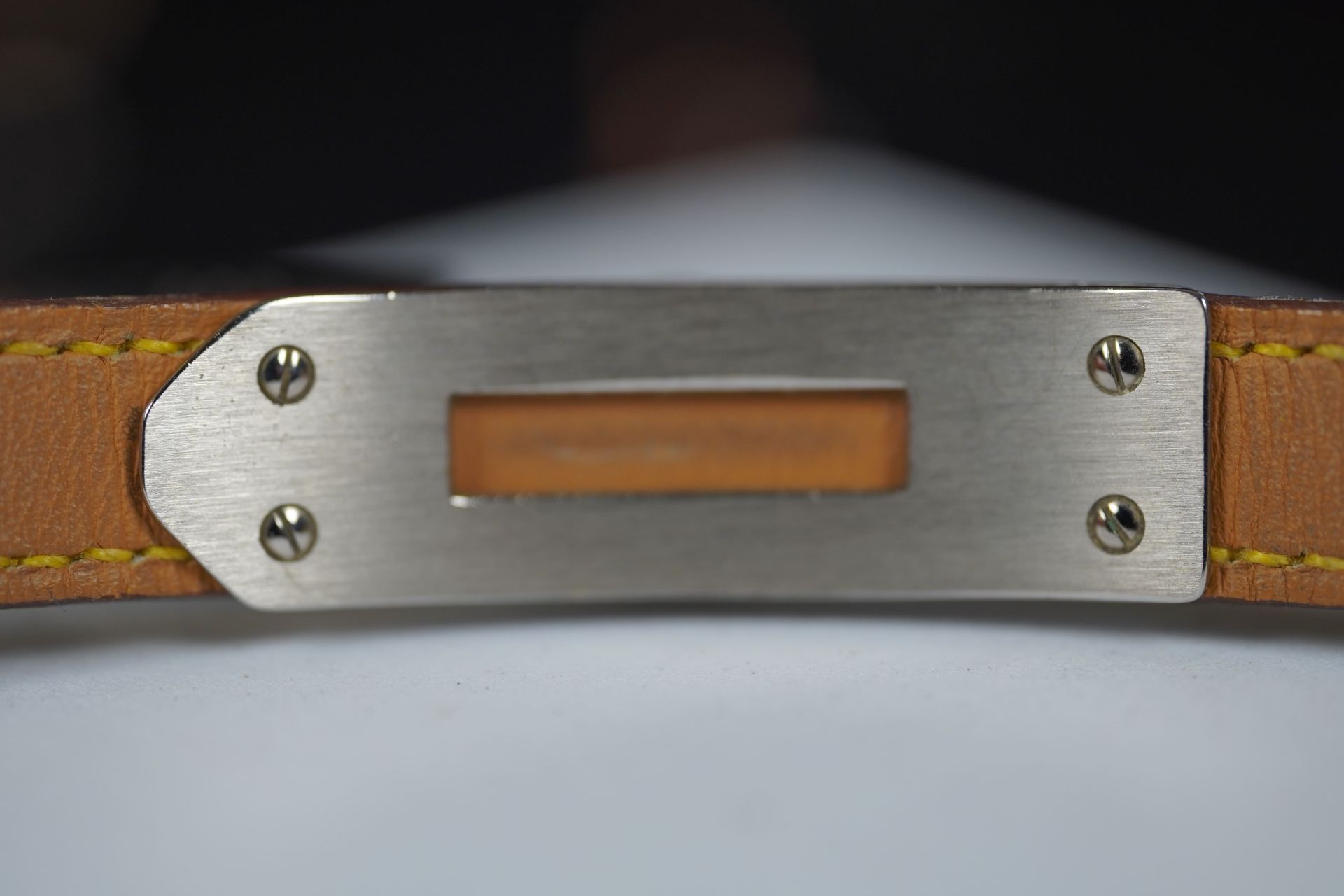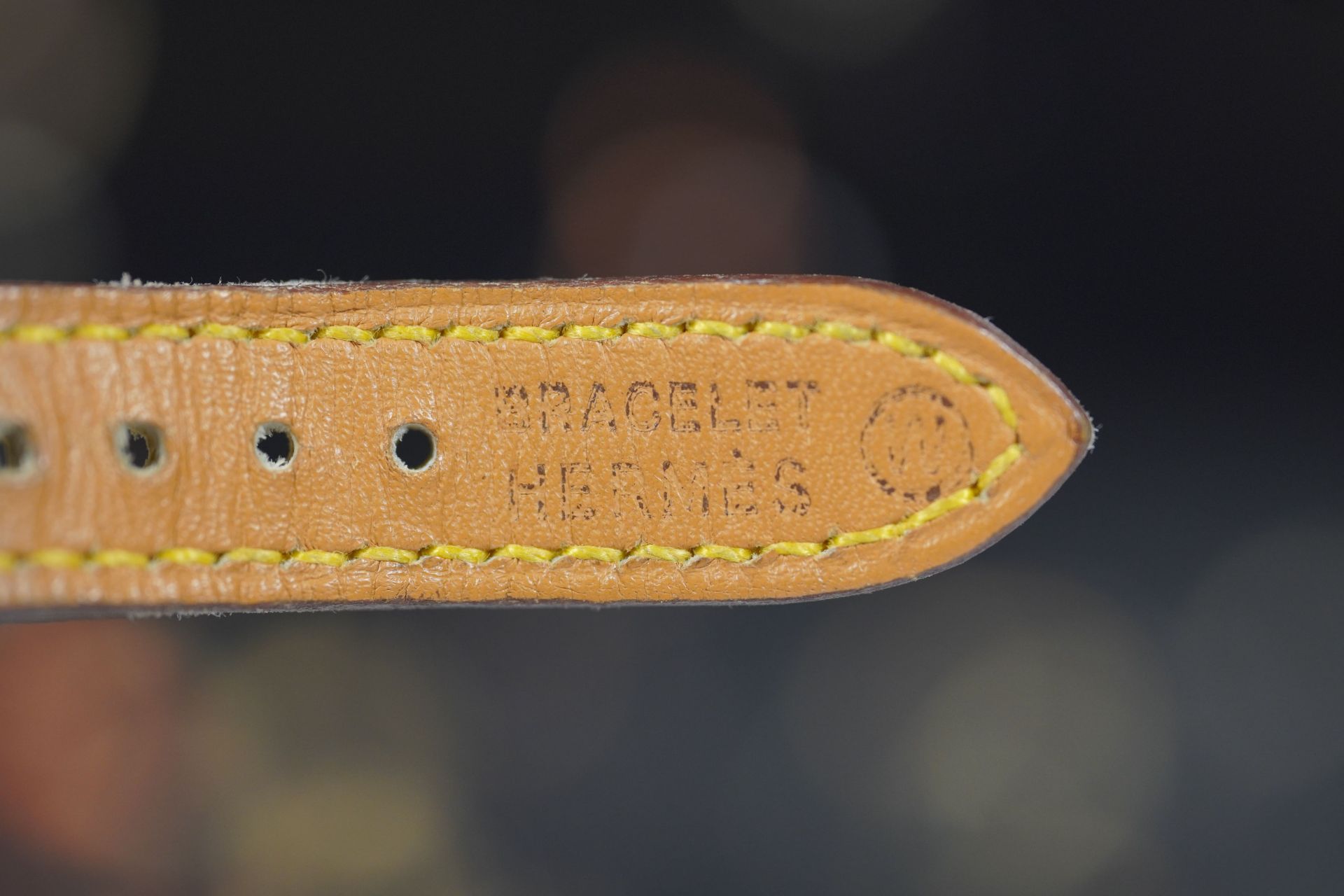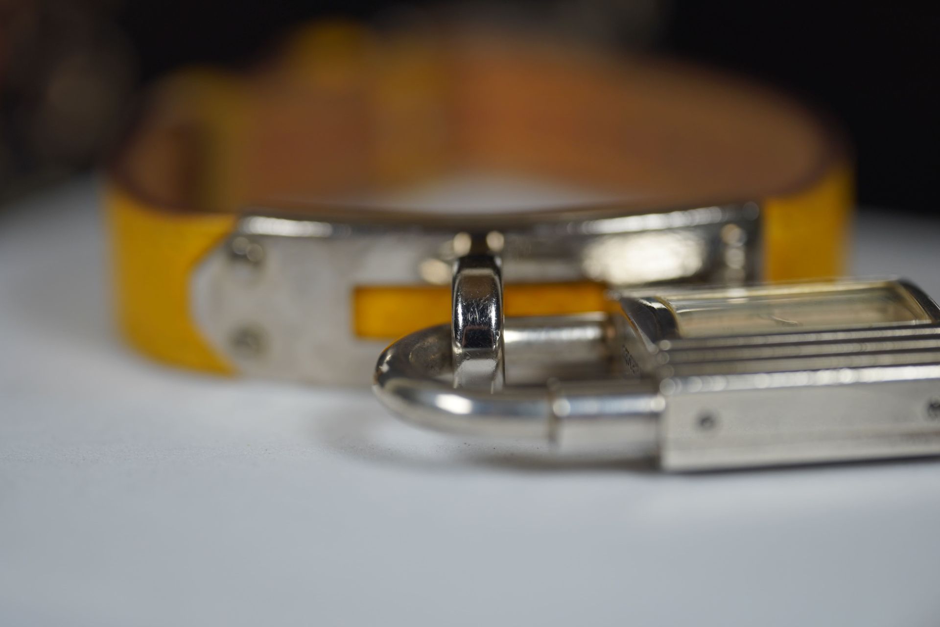 Découvrez l’élégance audacieuse avec la montre Hermès Kelly, référence commerciale KE1.210. Cette pièce horlogère féminine iconique, dotée d’un mouvement à quartz précis, est présentée dans un boîtier en acier de 20 mm de diamètre et 8.6 mm d’épaisseur. Son bracelet original en cuir jaune éclatant, associé à sa boucle ardillon originale, renforce son caractère distinctif. Livrée avec son coffret, cette montre en bon état est une expression raffinée du style Hermès, offrant une allure incomparable au poignet. Nous offrons une garantie de 12 mois pour cette pièce d’exception.
