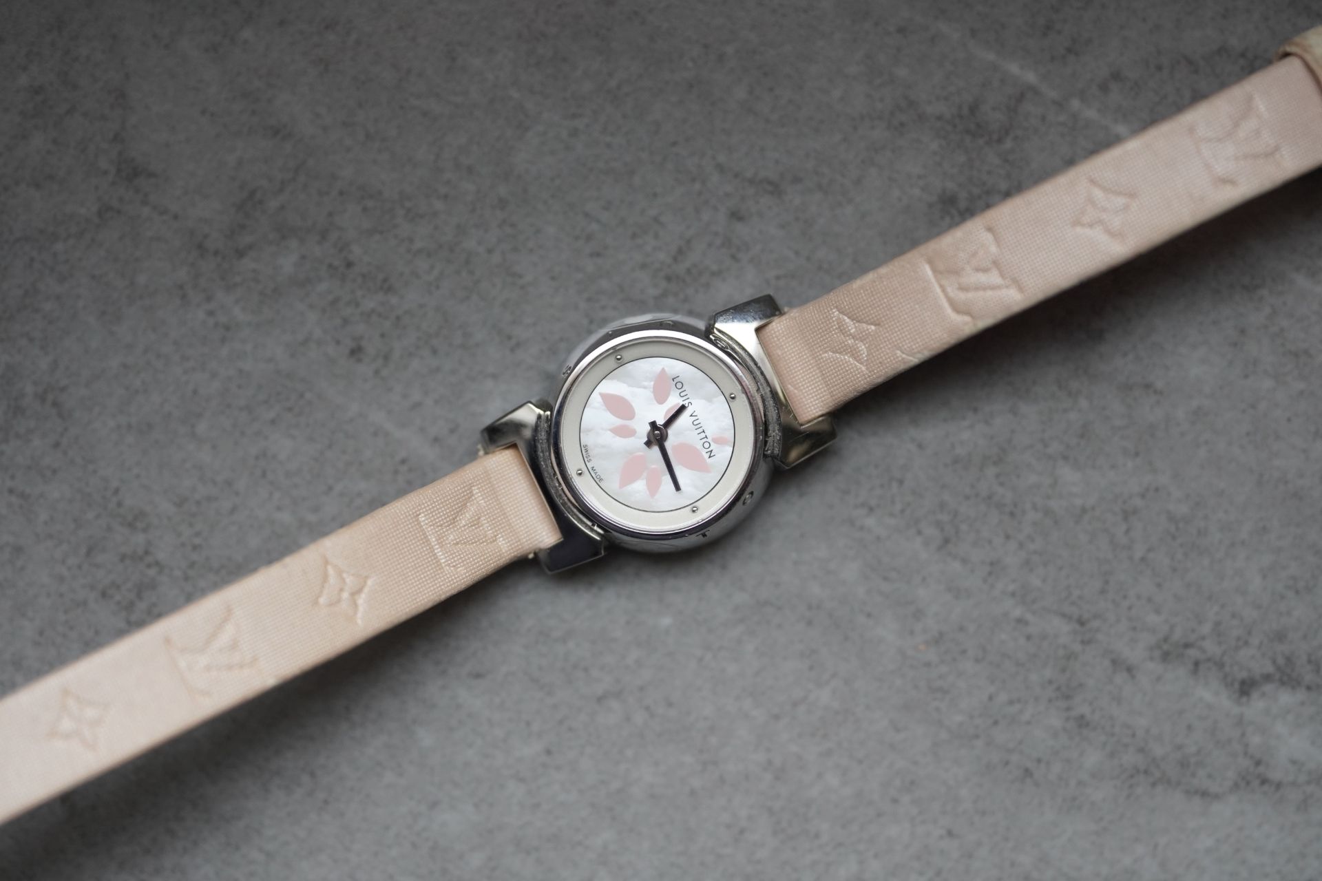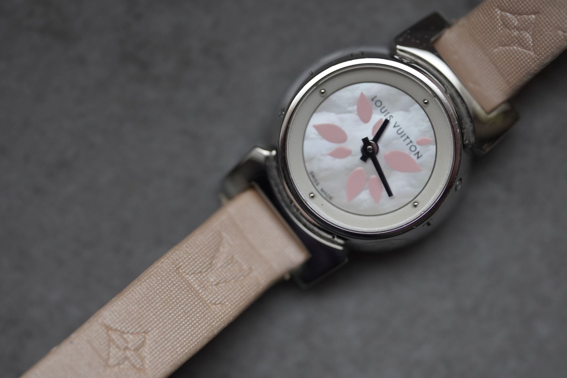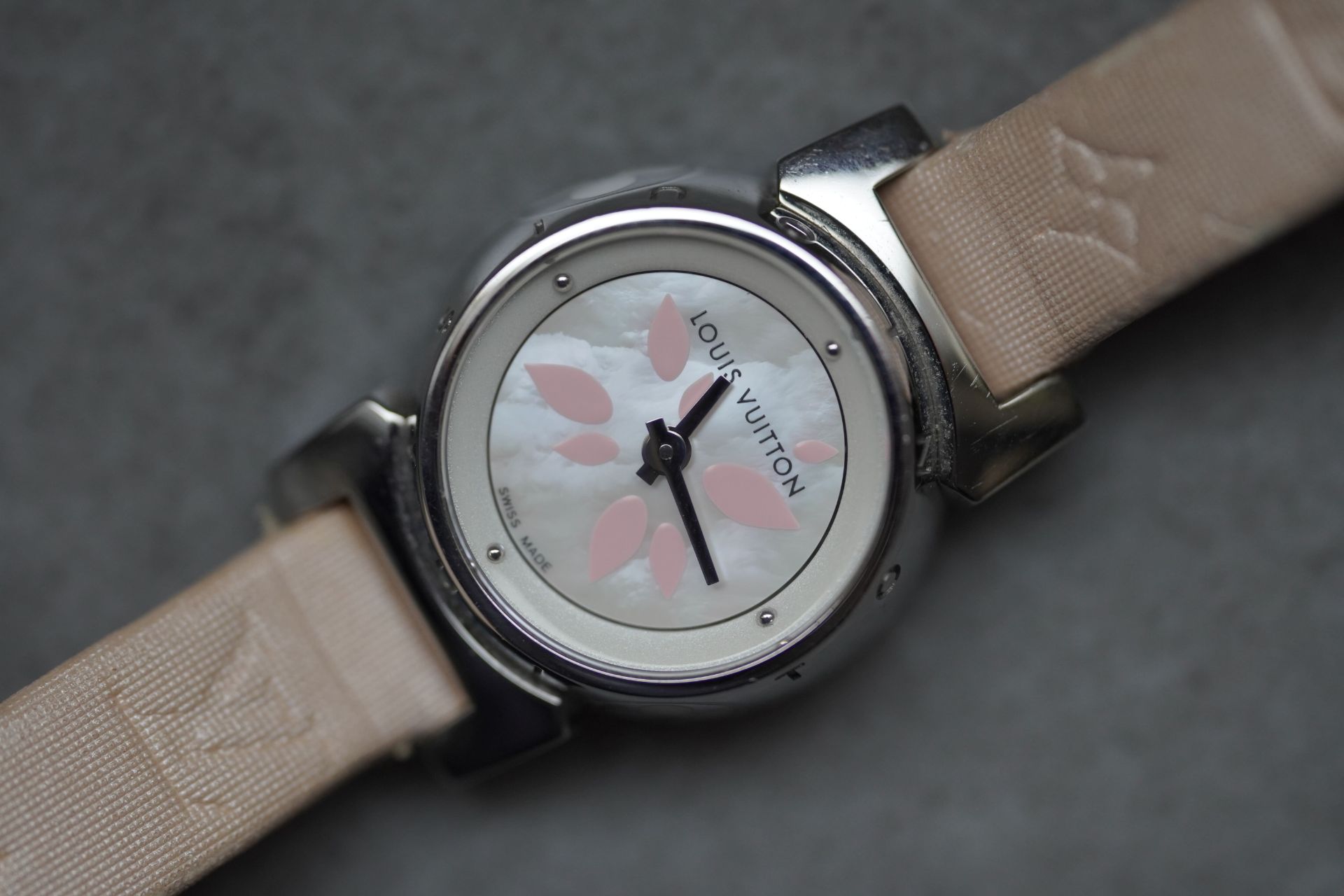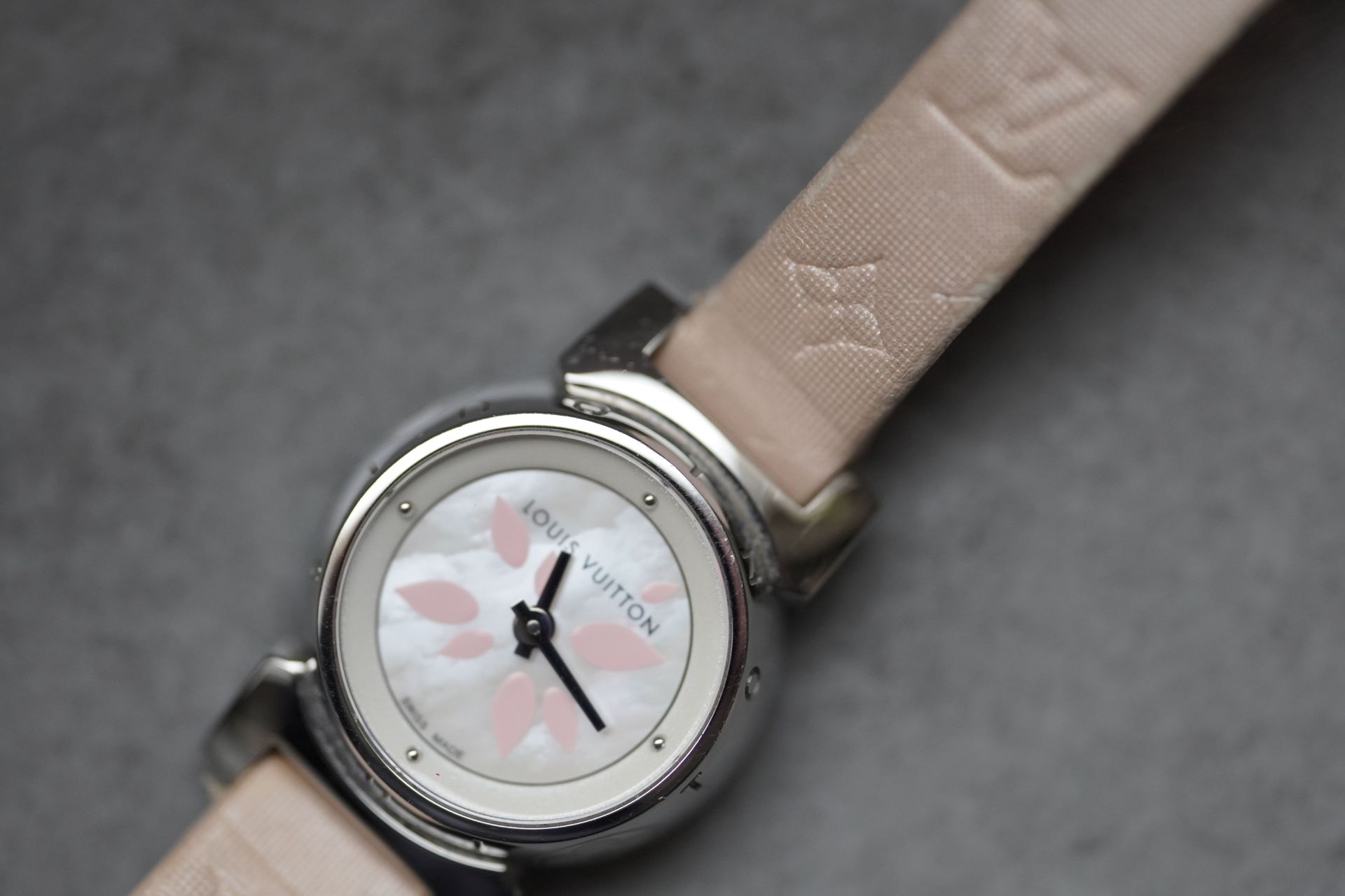 Découvrez l’élégance discrète avec la Louis Vuitton Tambour Petal, Référence Commerciale Q1512. Cette montre pour femme, référence TOT-10365, allie subtilement le raffinement horloger à l’esthétique distinctive de la Maison. Son boîtier en acier de 18 mm de diamètre et 7.7 mm d’épaisseur abrite un mouvement à quartz d’une fiabilité éprouvée. Le bracelet original en cuir rose, accompagné d’une boucle ardillon originale, souligne une féminité délicate. D’une étanchéité de 3 ATM, cette pièce en bon état de 2011 est proposée avec son contenu complet et bénéficie d’une garantie de 12 mois.