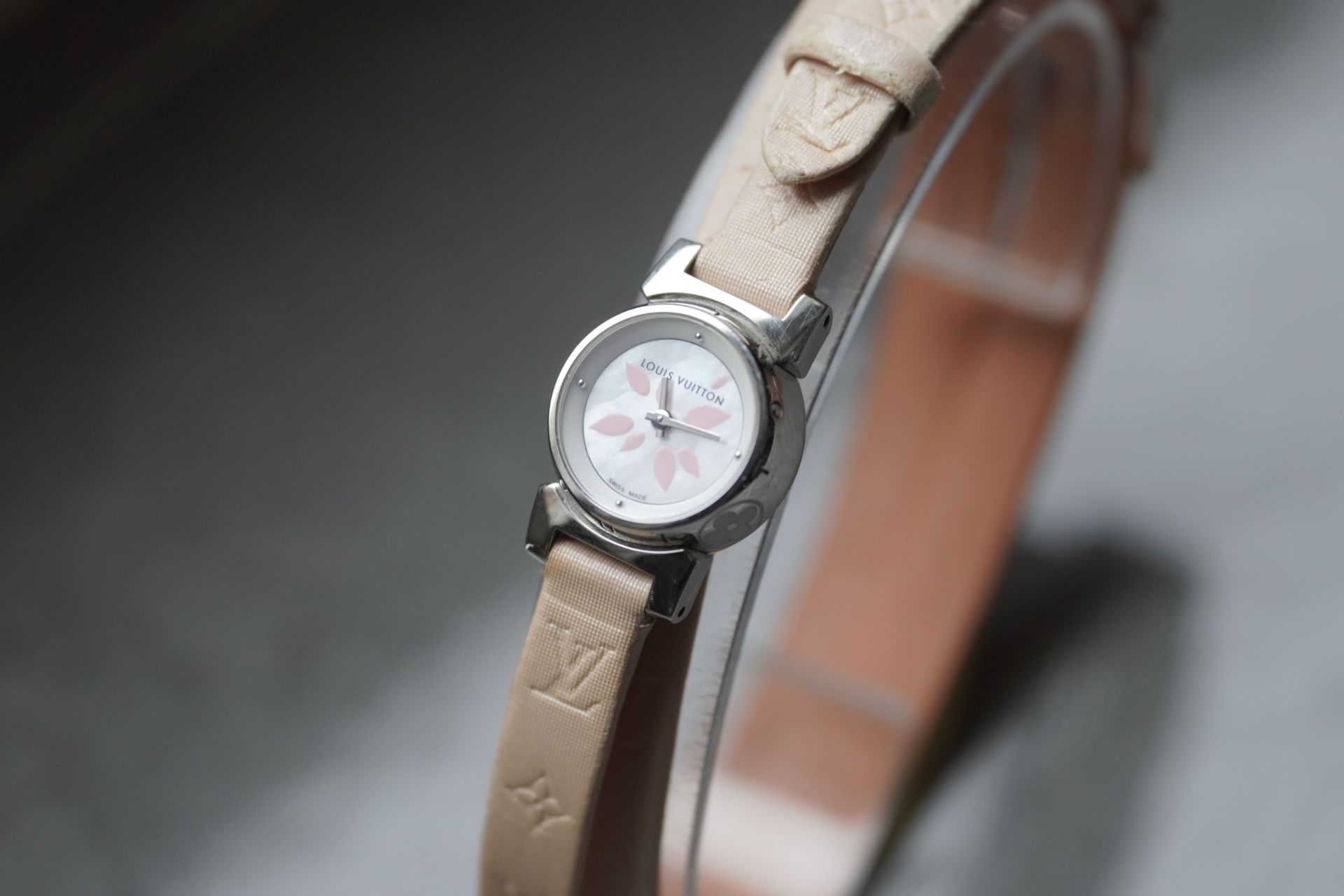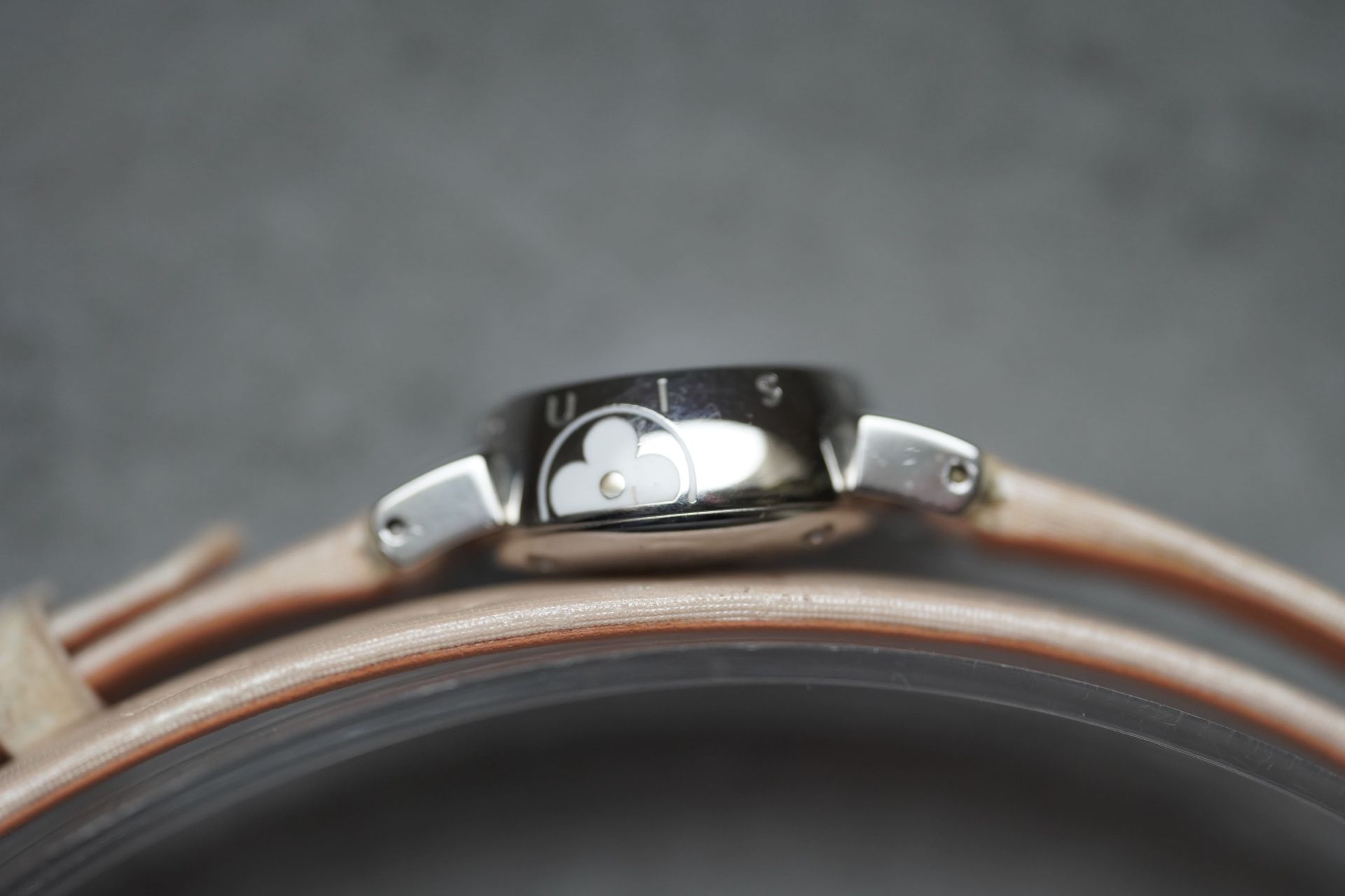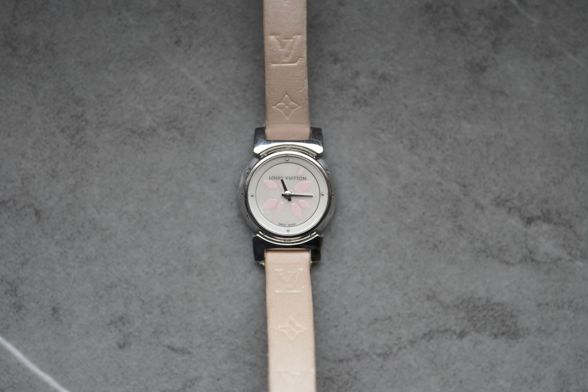 Découvrez l’élégance discrète avec la Louis Vuitton Tambour Petal, Référence Commerciale Q1512. Cette montre pour femme, référence TOT-10365, allie subtilement le raffinement horloger à l’esthétique distinctive de la Maison. Son boîtier en acier de 18 mm de diamètre et 7.7 mm d’épaisseur abrite un mouvement à quartz d’une fiabilité éprouvée. Le bracelet original en cuir rose, accompagné d’une boucle ardillon originale, souligne une féminité délicate. D’une étanchéité de 3 ATM, cette pièce en bon état de 2011 est proposée avec son contenu complet et bénéficie d’une garantie de 12 mois.