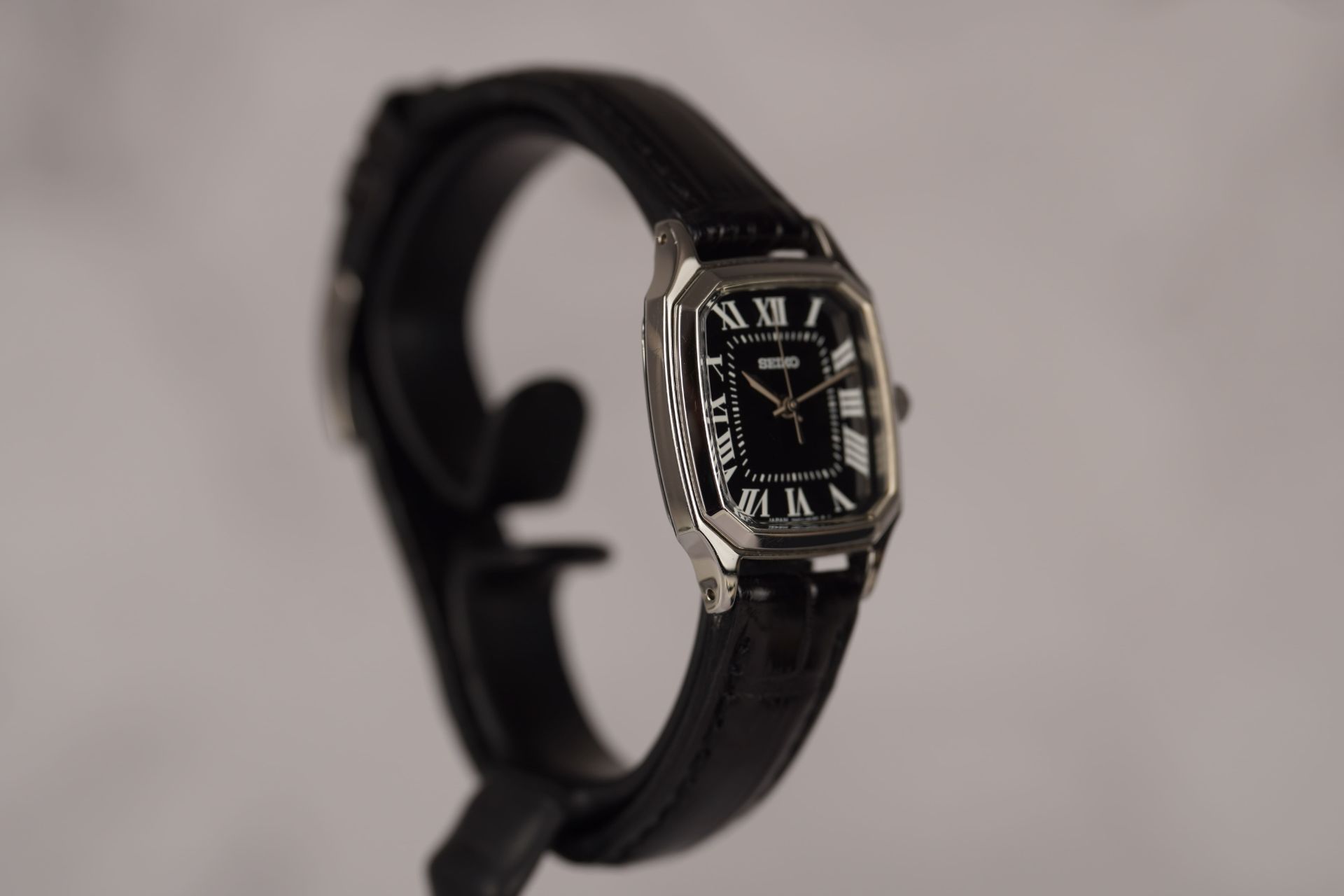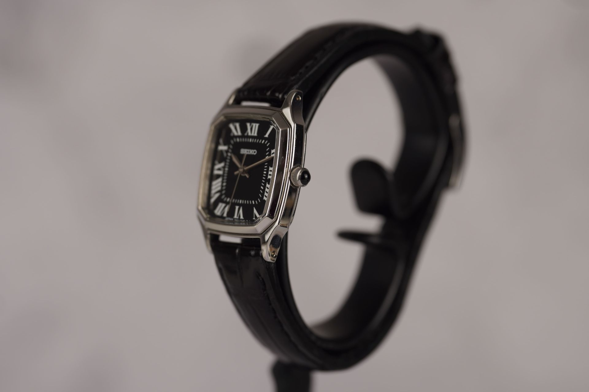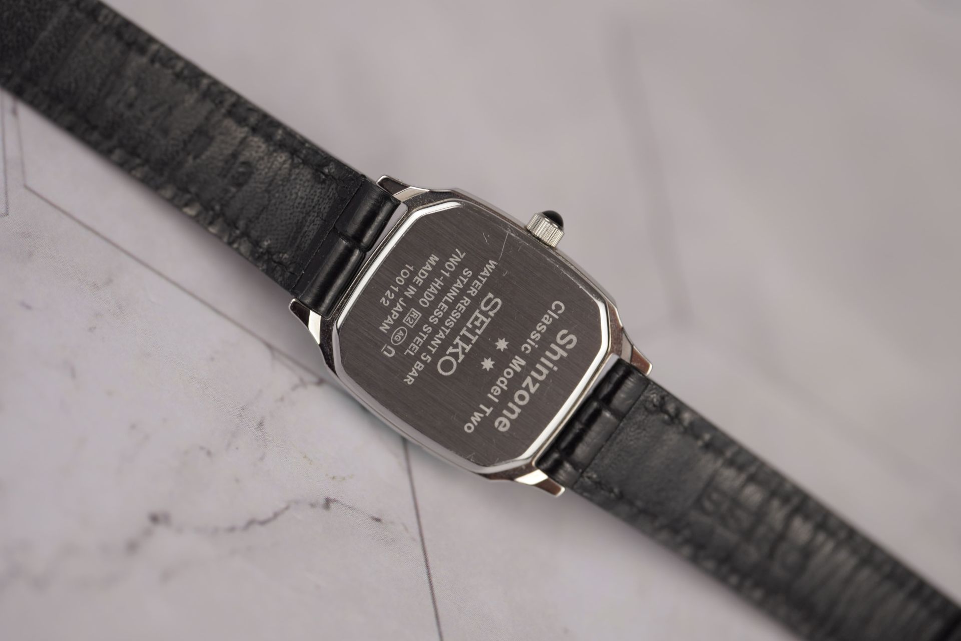 Découvrez l’élégance discrète avec cette montre Seiko Shinzone Quartz pour femme, référence commerciale 7N01-HAD0. Son boîtier raffiné en acier de 23.2mm de diamètre et d’une épaisseur de 6.2mm abrite un mouvement à quartz précis. Le bracelet en cuir noir, d’origine, assure un confort optimal, tandis que l’étanchéité de 3 ATM la protège des éclaboussures. Cette pièce est livrée seule. Bien que sa boucle ardillon ait été remplacée, son bon état général et sa garantie de 12 mois témoignent de sa qualité intemporelle.