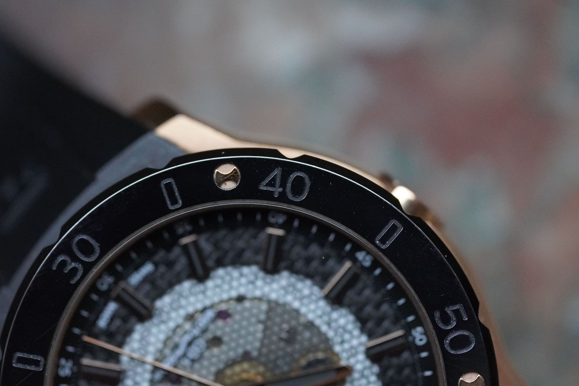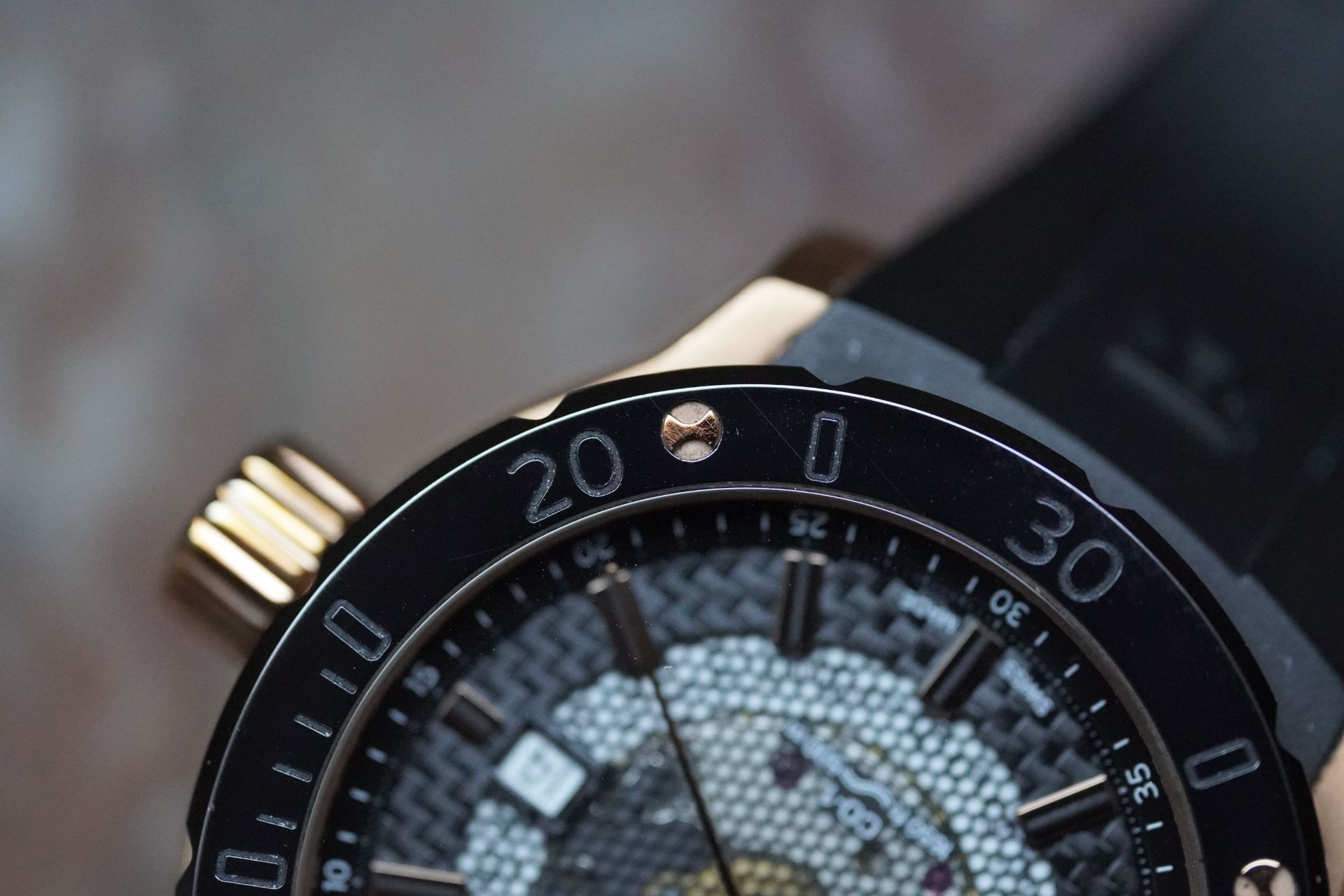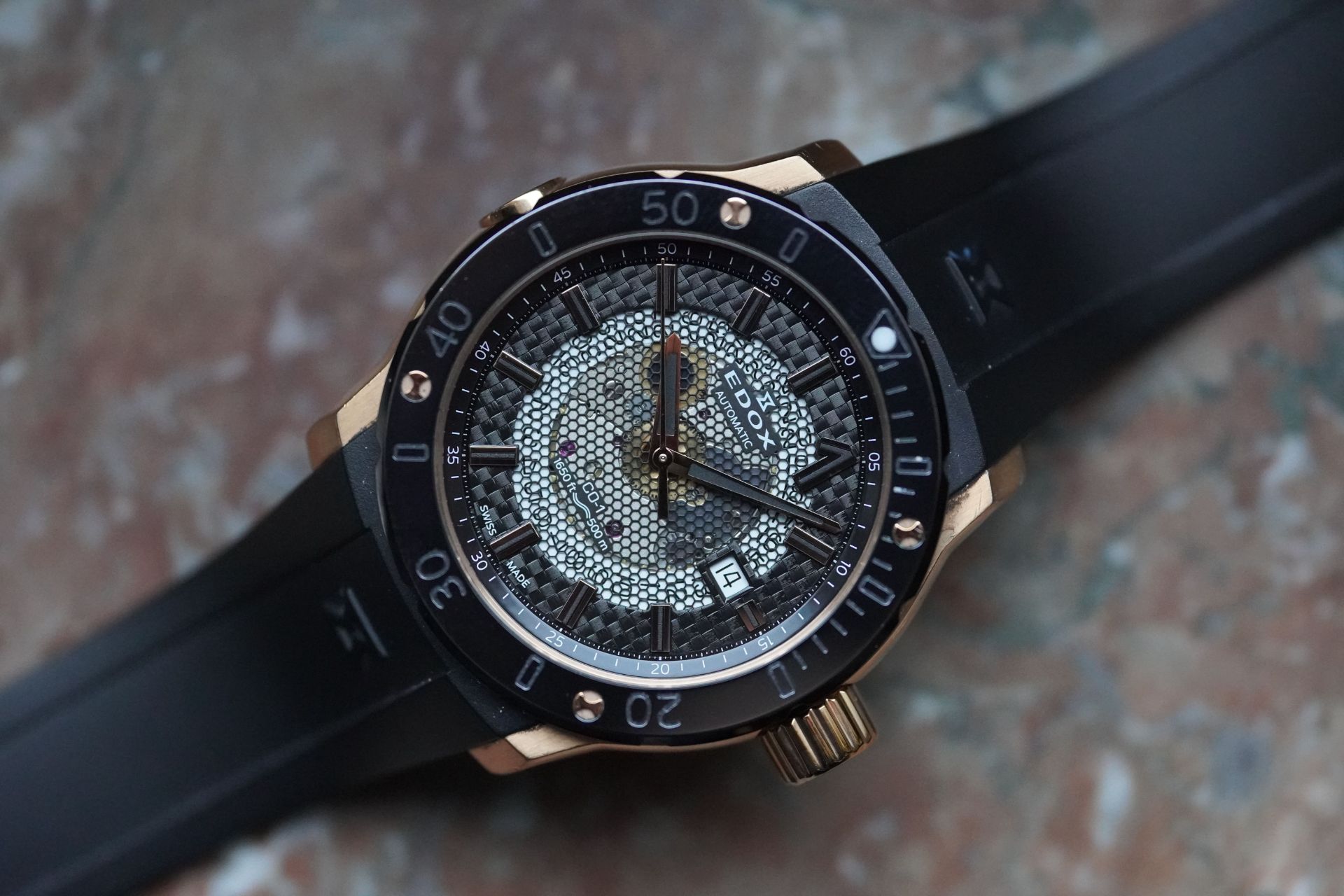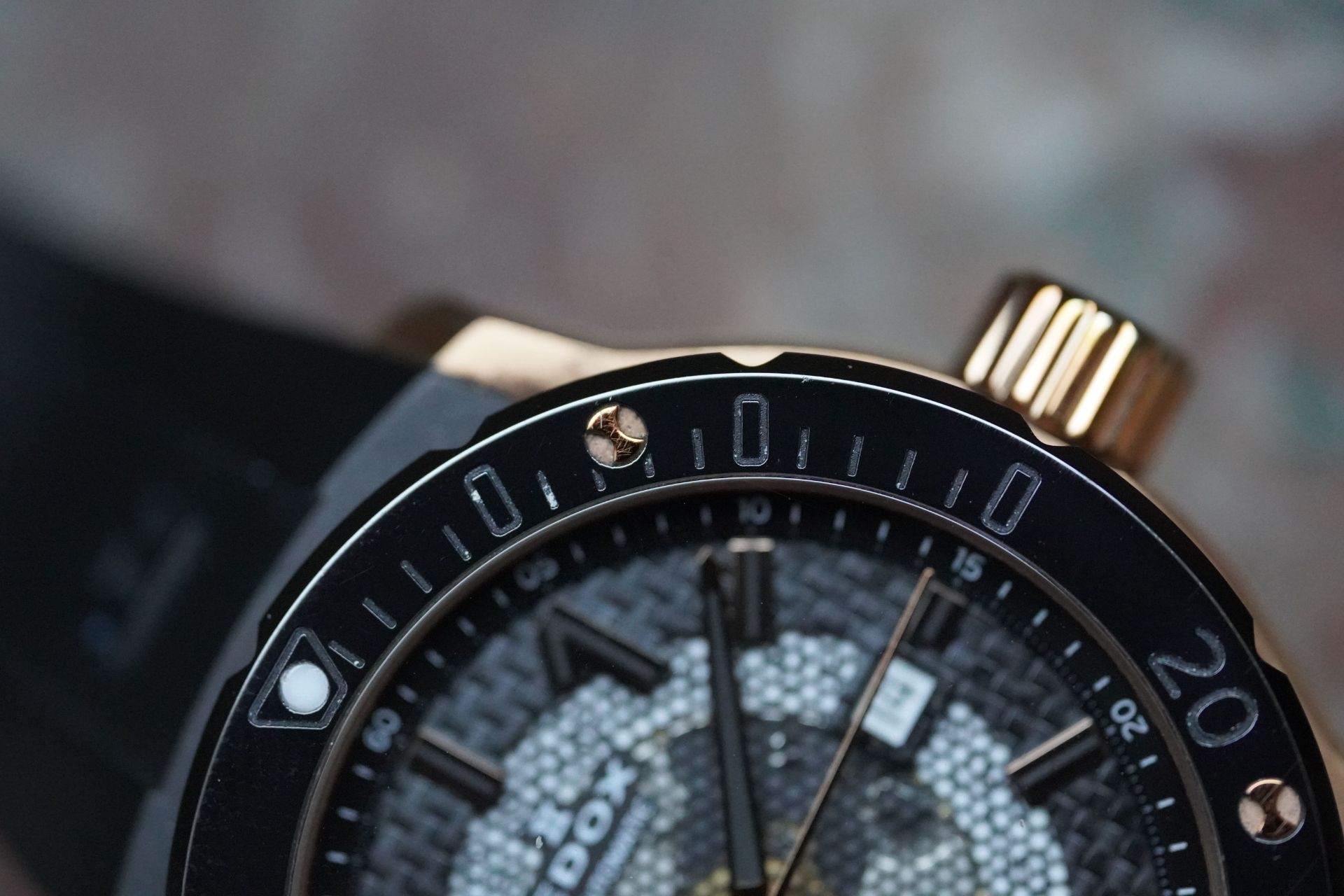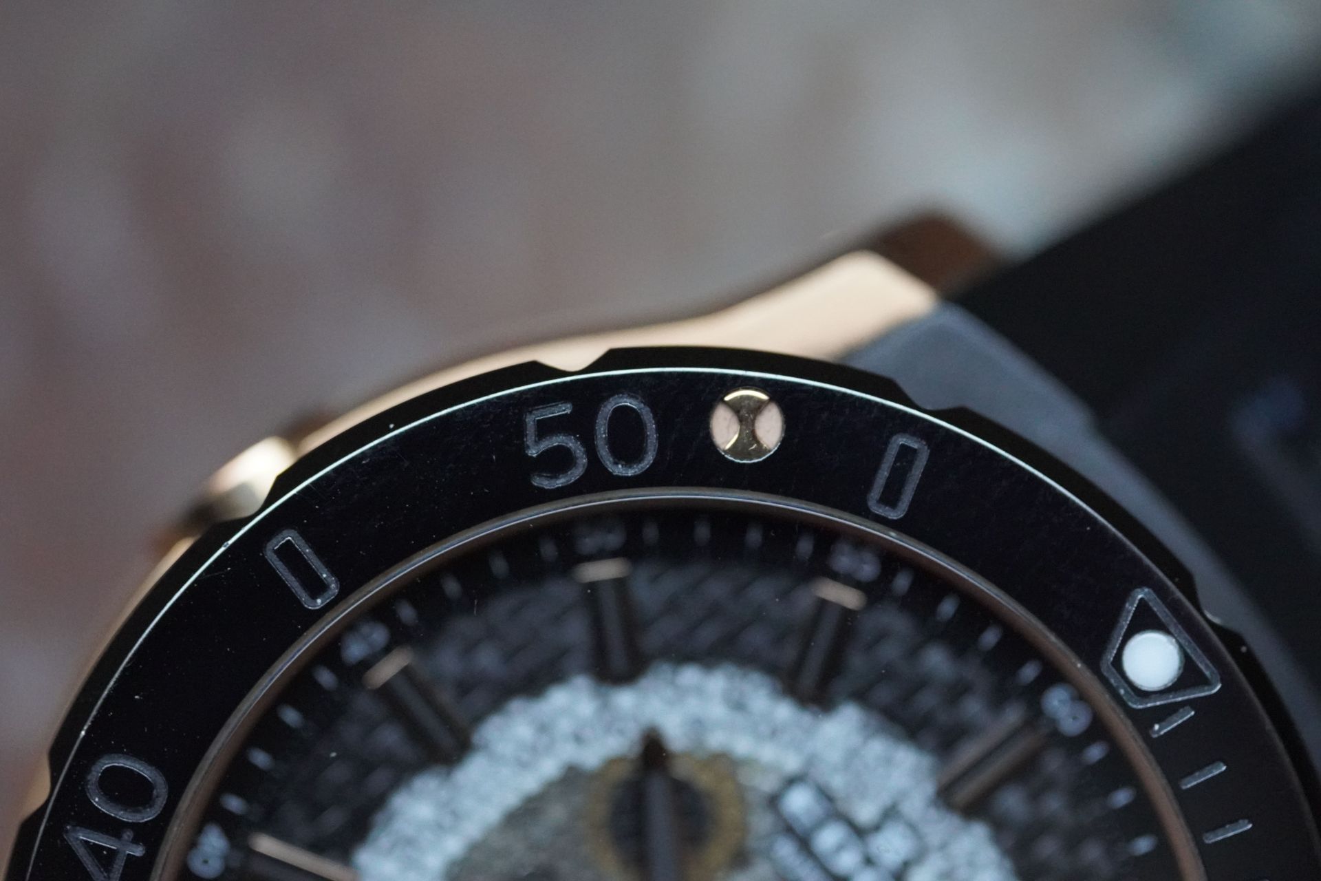 | Autres | Aiguilles luminescentes, Index luminescents, Lunette tournante, Couronne vissée, Mouvement squelette |