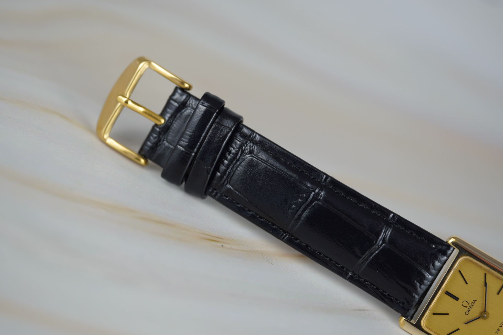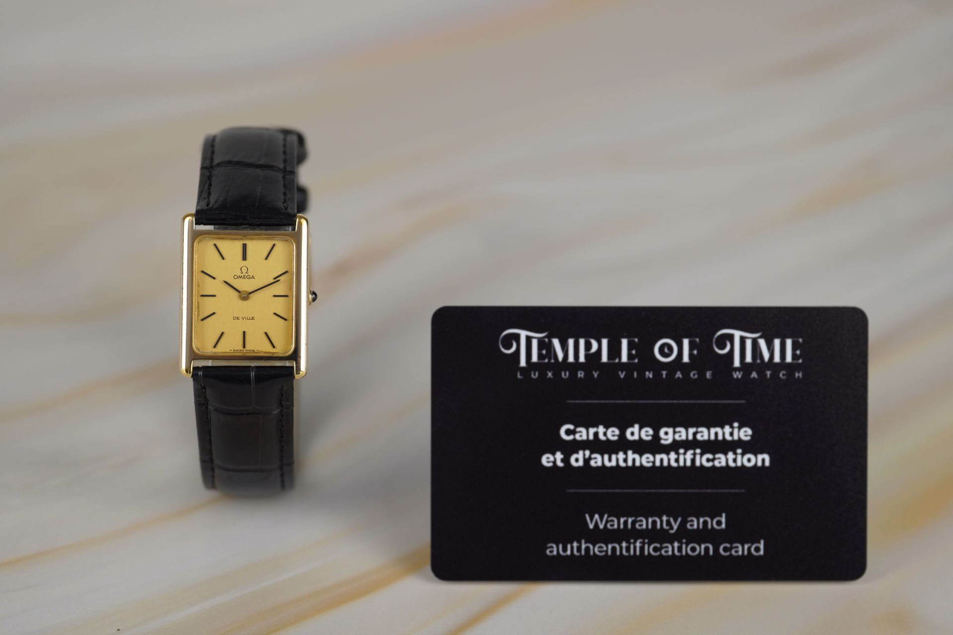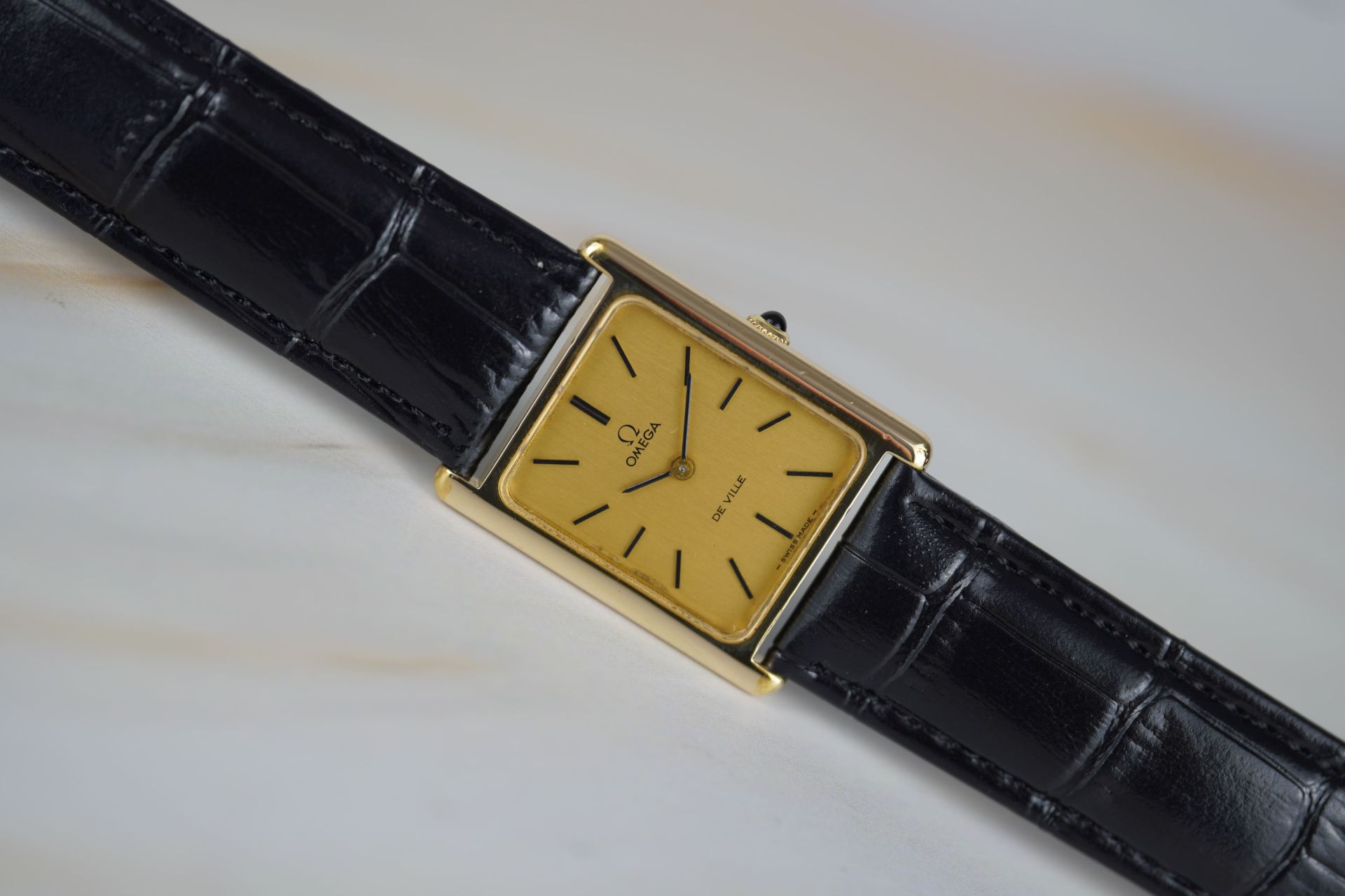 Découvrez l’élégance intemporelle avec cette montre unisexe Omega De Ville « Tank », référence commerciale 511 040. Son boîtier plaqué or de 24.5mm de diamètre et de seulement 6.3mm d’épaisseur abrite un mouvement à remontage manuel, témoignage de la finesse horlogère de 1997. Le cadran est sublimé par un bracelet en cuir noir et une boucle ardillon, non d’origine, apportant une touche de modernité tout en respectant l’esthétique classique de cette pièce en très bon état. Cette Omega De Ville est livrée seule. Elle bénéficie d’une garantie de 12 mois.