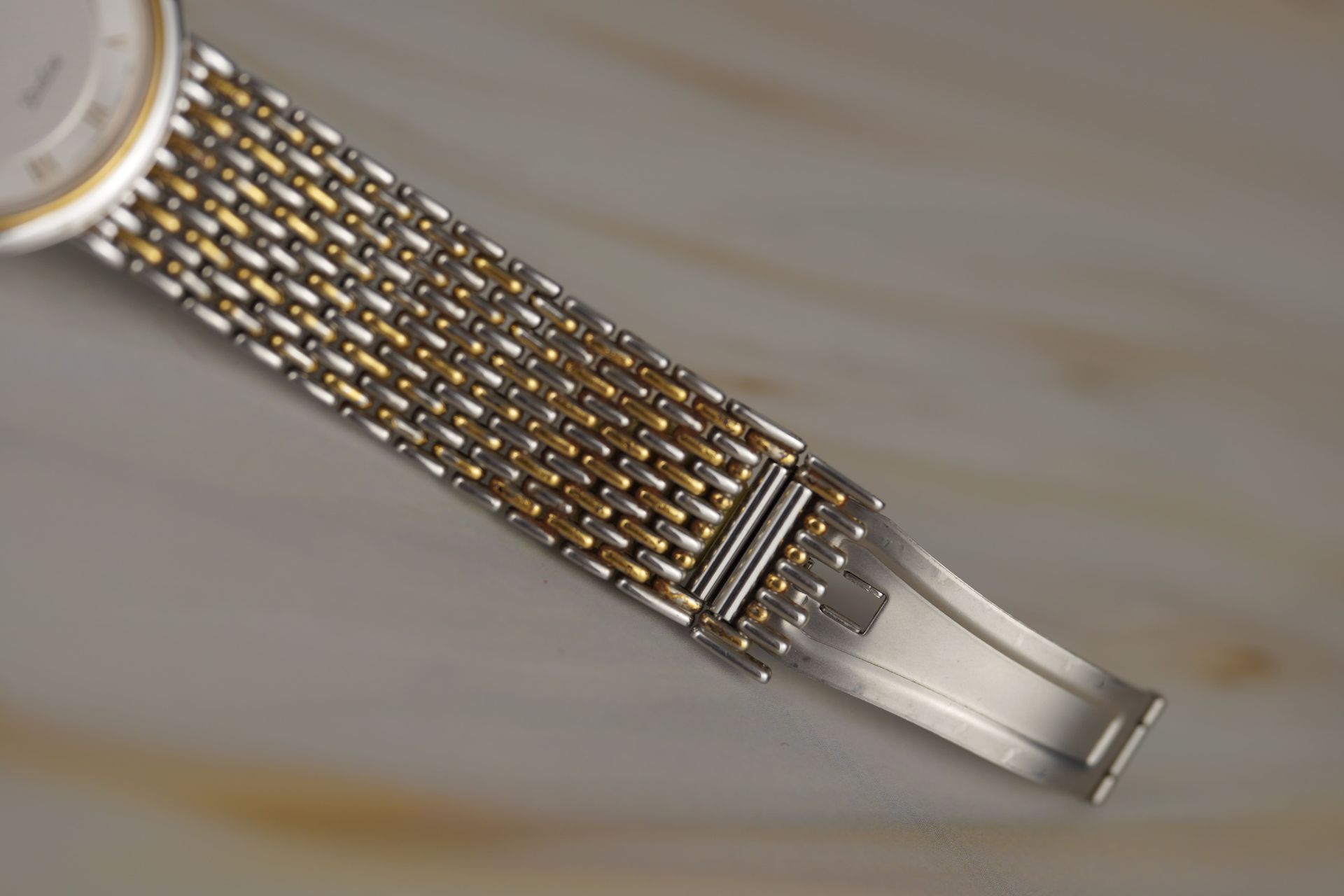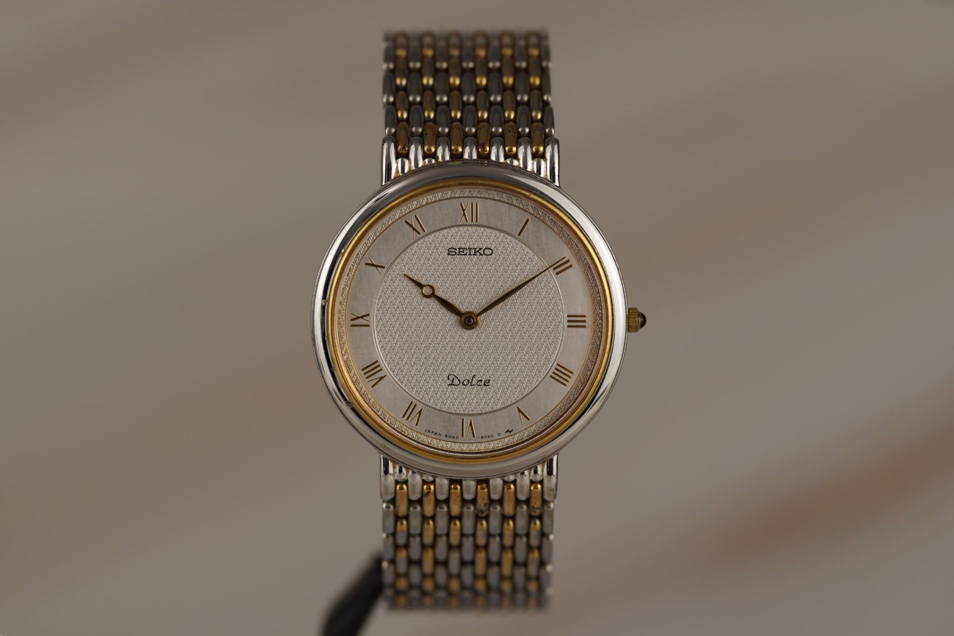 Découvrez la Seiko Dolce Référence 8N40-6030, une montre homme raffinée qui allie élégance et précision. Son mouvement Quartz assure une fiabilité irréprochable, logé dans un boîtier en acier de 37.8mm de diamètre et d’une finesse remarquable de 5.9mm. Le bracelet original en acier bicolore, mêlant l’or et l’acier, est sublimé par une boucle à plis également originale. Datant de 1998, cette pièce en bon état bénéficie d’une étanchéité de 3 ATM.