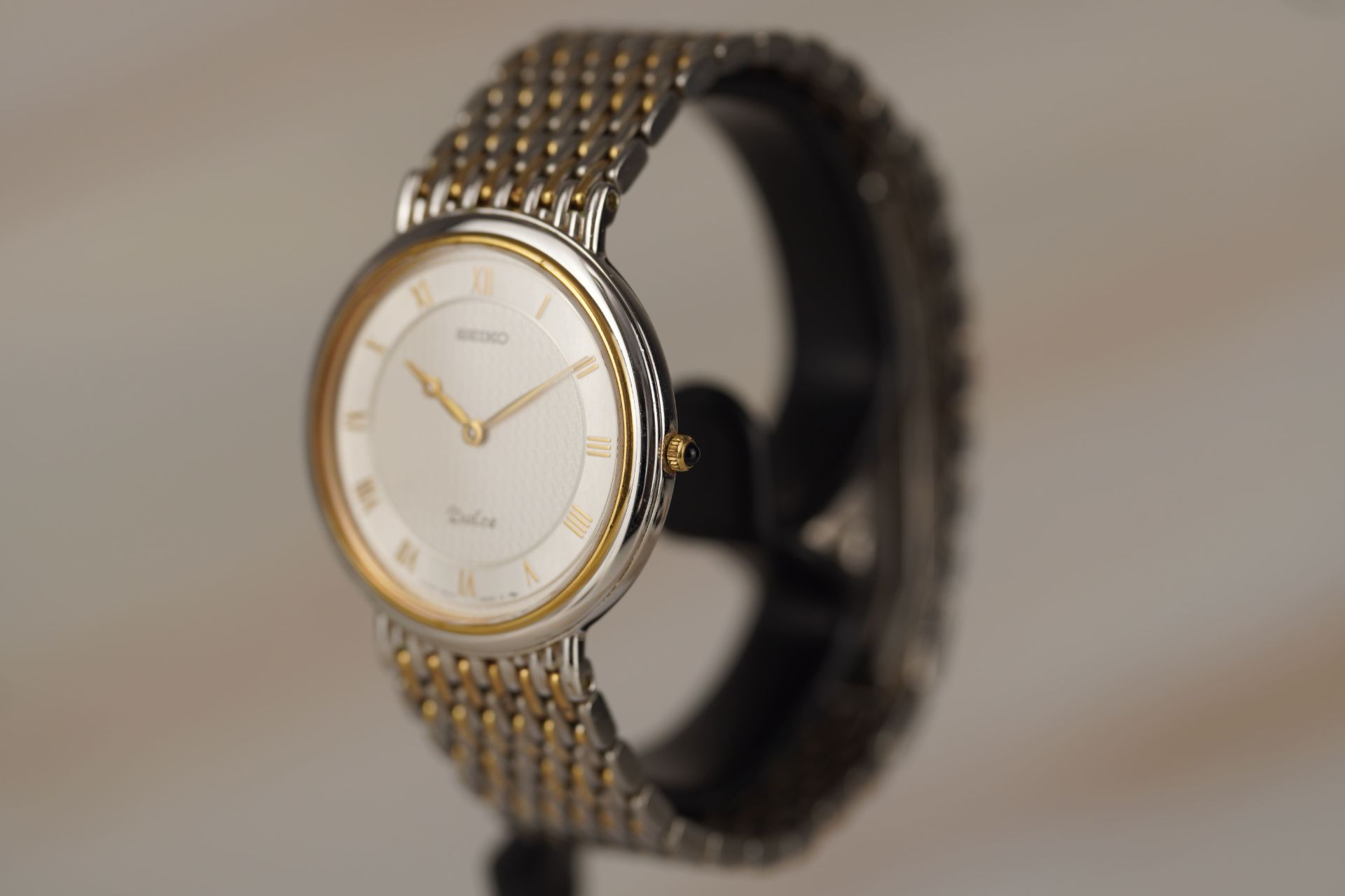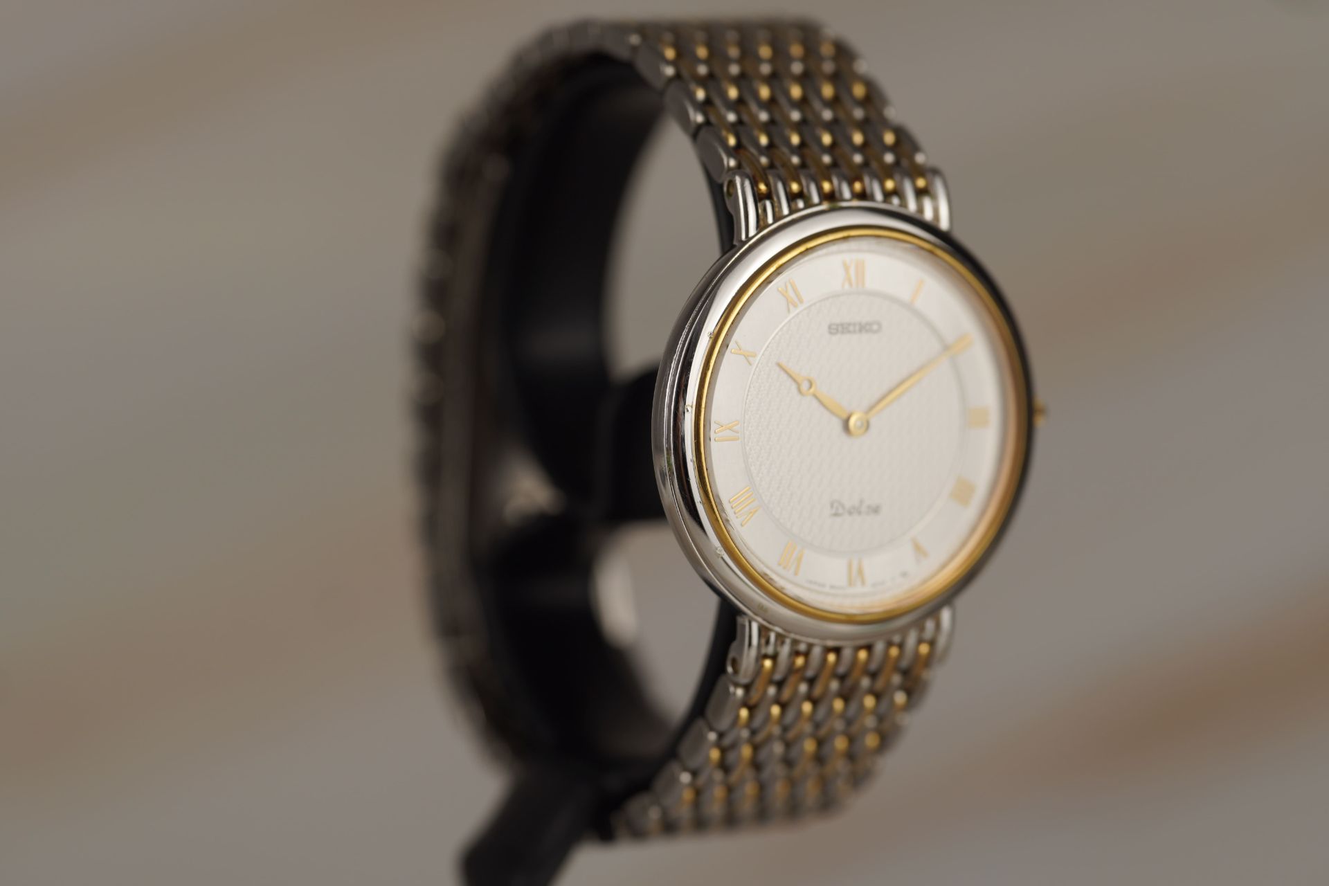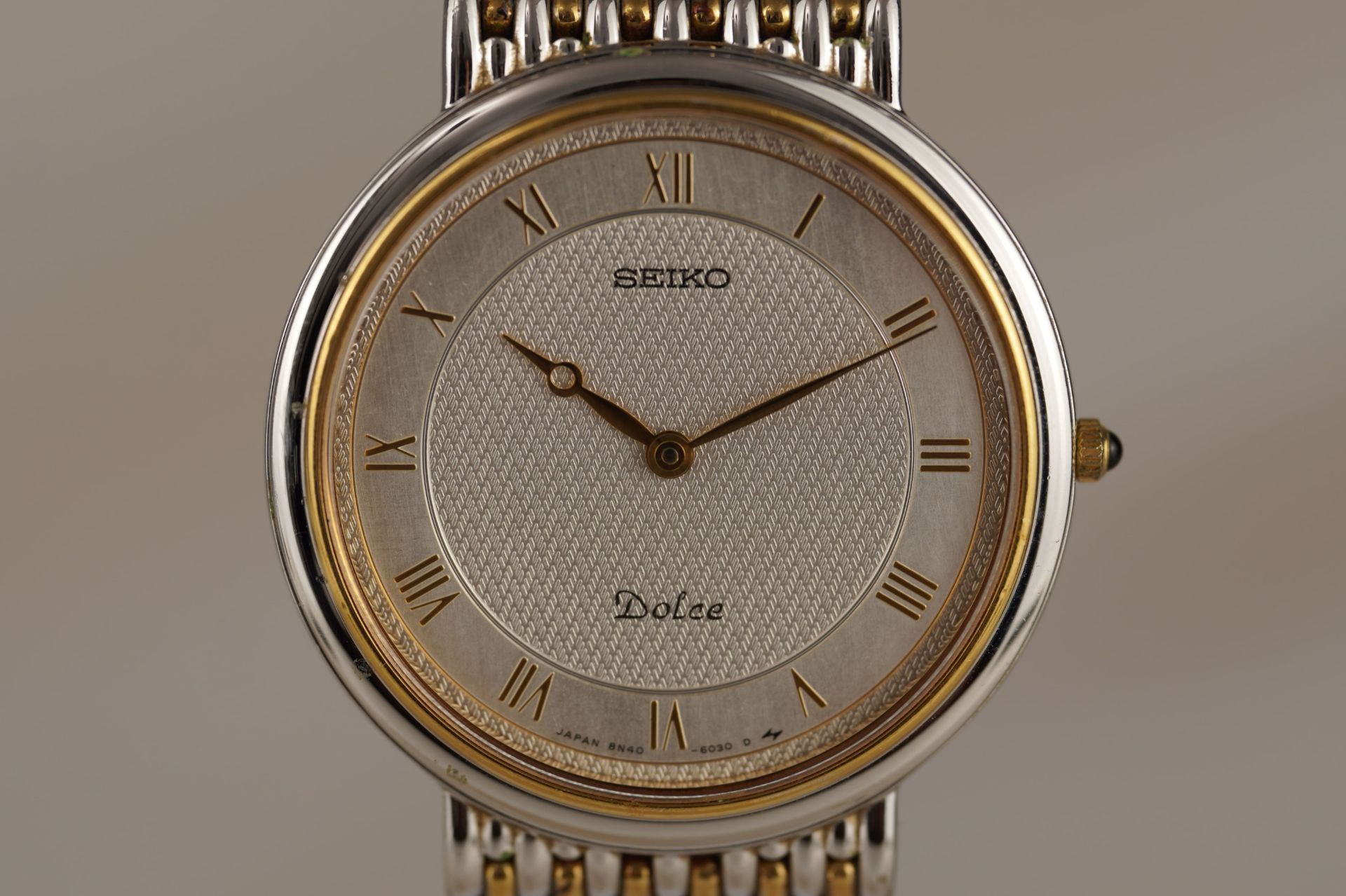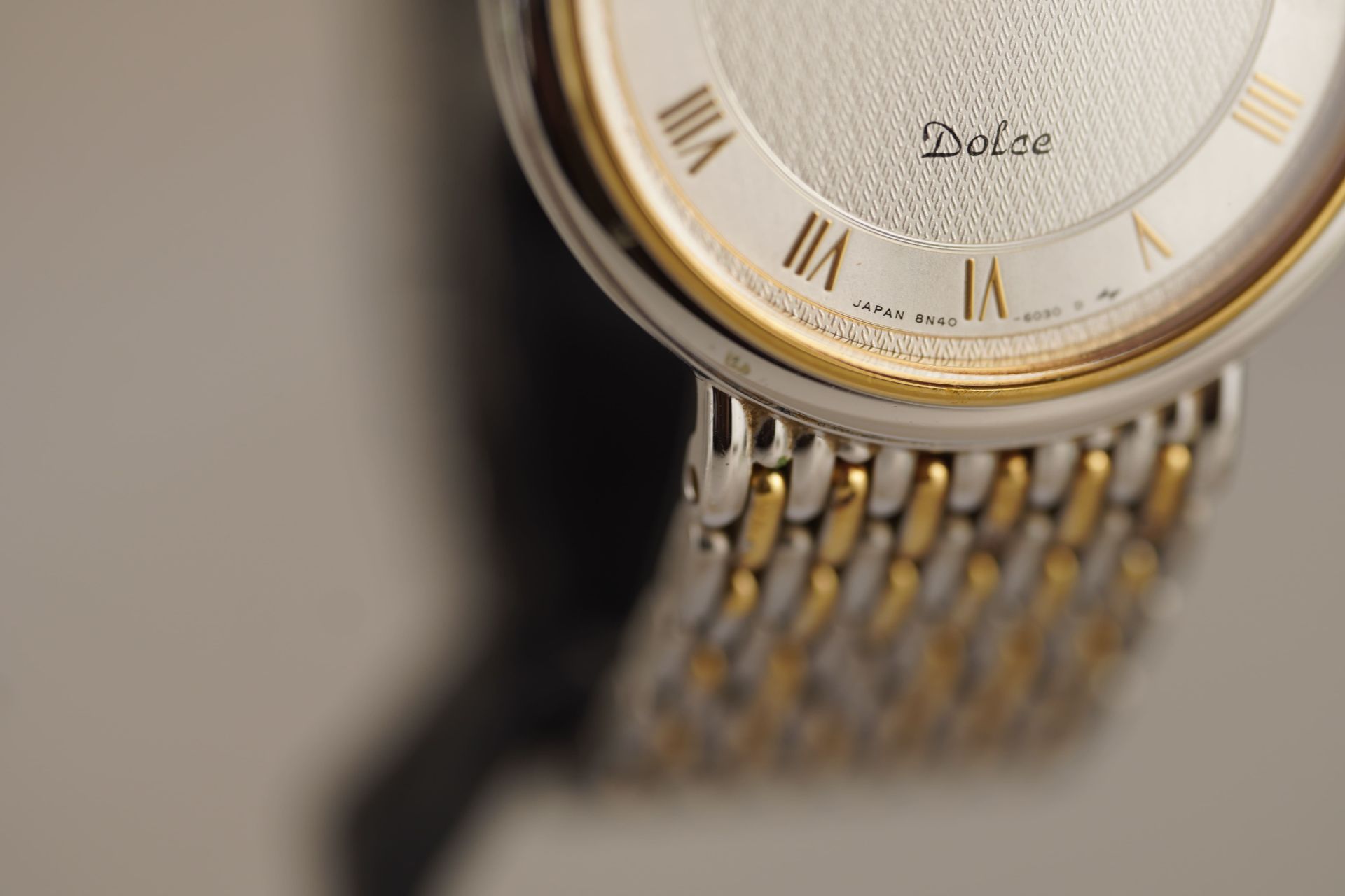 Découvrez l’élégance intemporelle de cette montre Seiko Dolce pour homme, référence commerciale 8N40-6030. Ce modèle de 1998, en bon état, est animé par un mouvement à Quartz précis. Son boîtier en acier de 37.8 mm de diamètre et de seulement 5.9 mm d’épaisseur abrite un cadran raffiné. Le bracelet original en acier bicolore or et acier, complété par sa boucle déployante originale, ajoute une touche de distinction au poignet. Avec son étanchéité de 3 ATM, cette Seiko Dolce allie sophistication et fonctionnalité. Elle bénéficie d’une garantie de 12 mois.