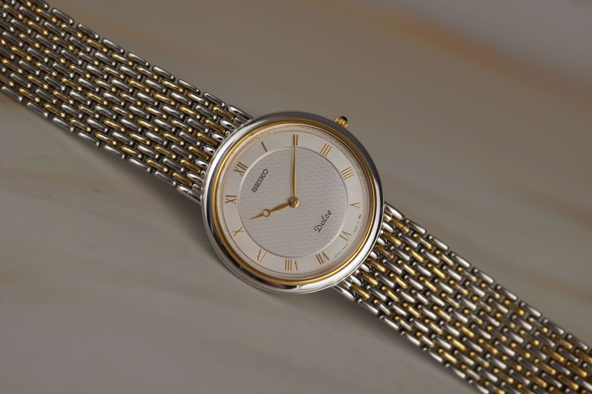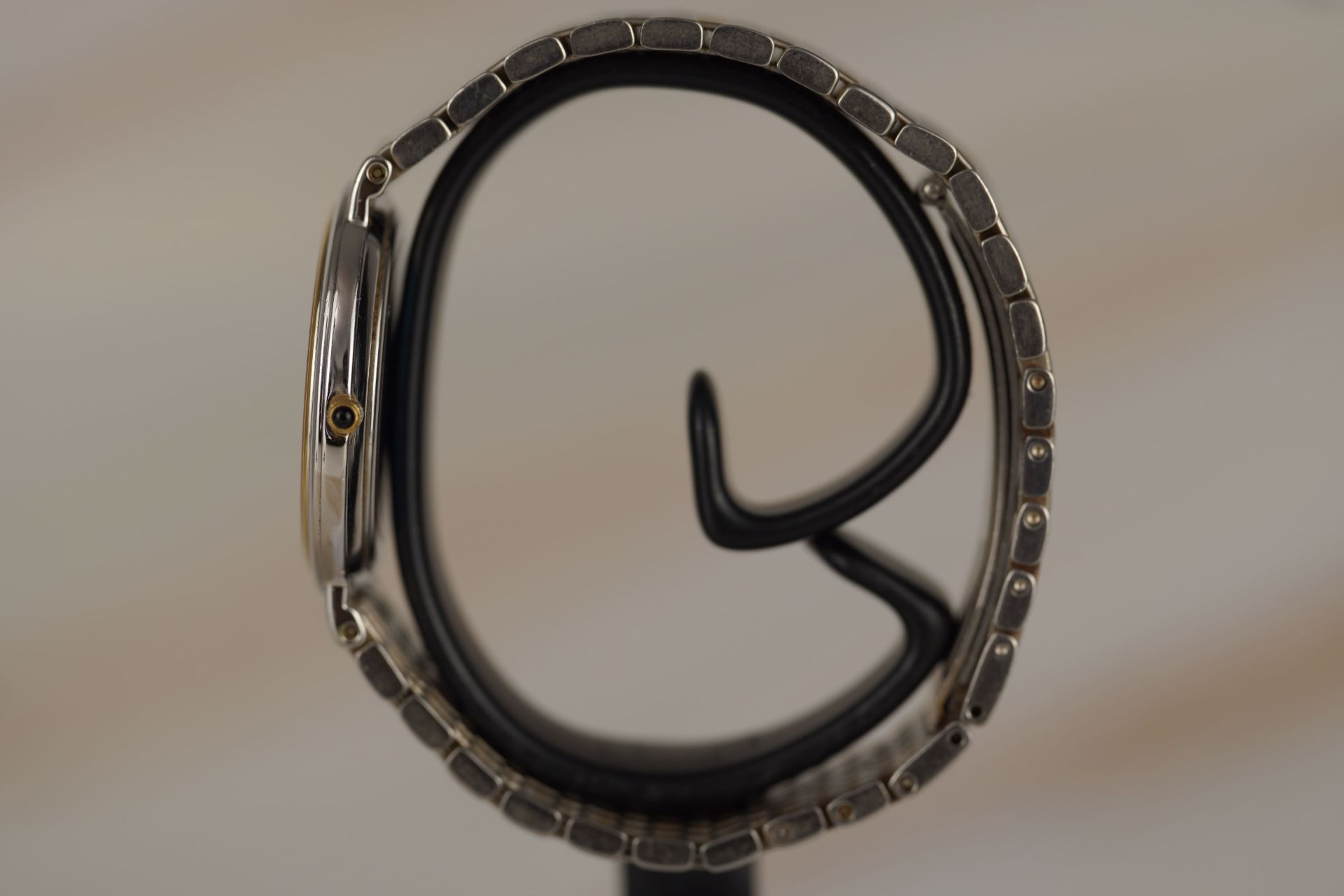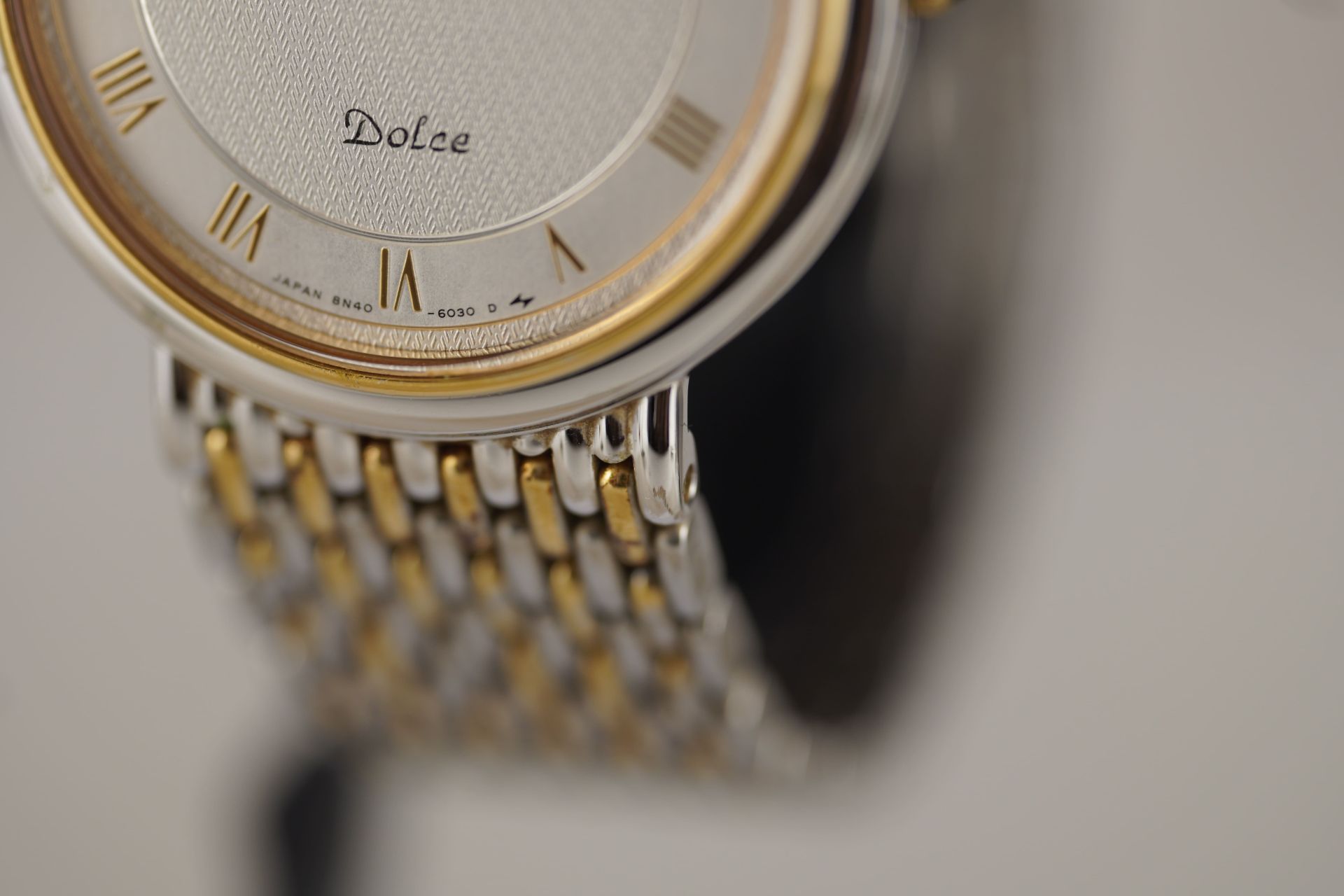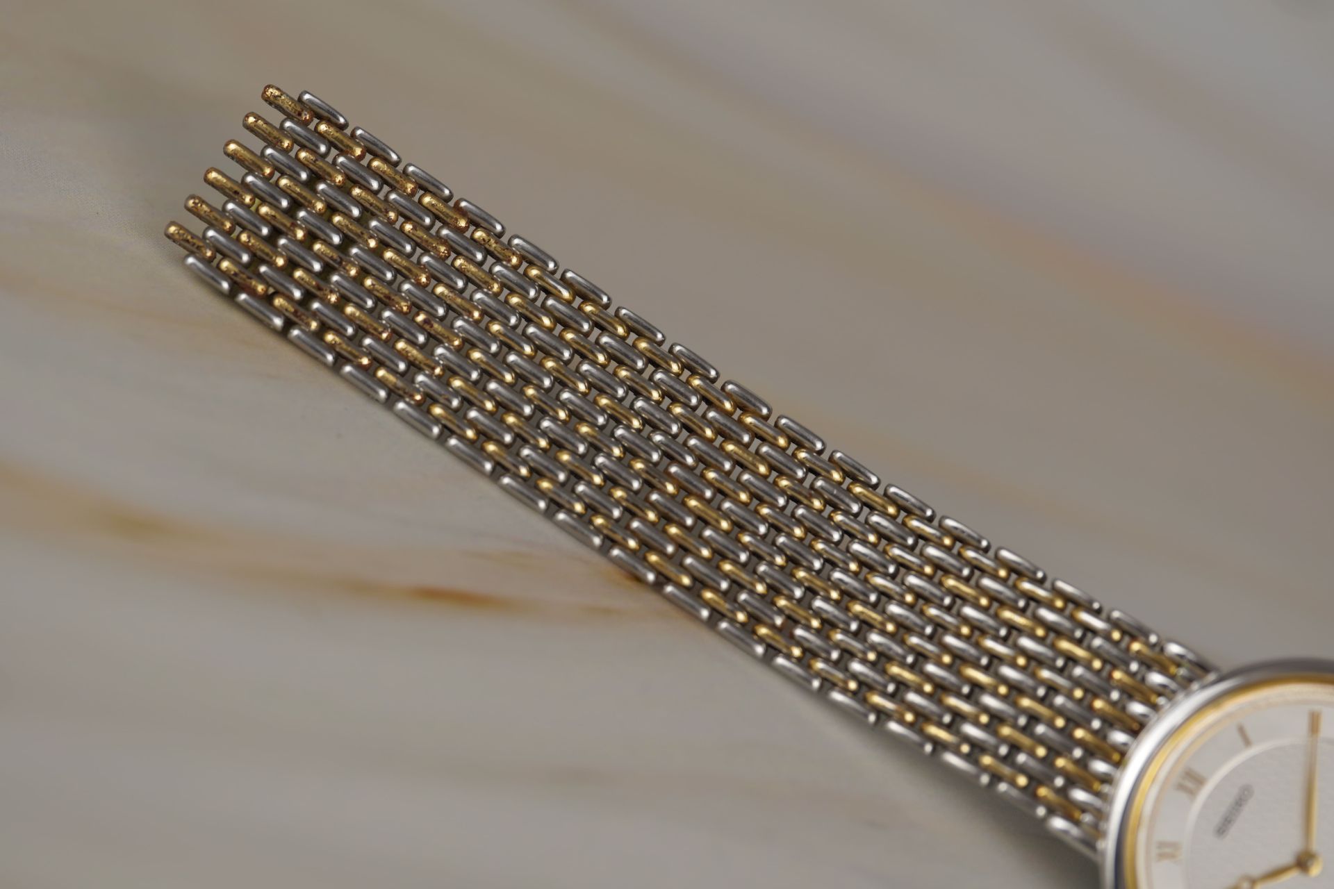 Découvrez l’élégance intemporelle de cette montre Seiko Dolce pour homme, référence commerciale 8N40-6030. Ce modèle de 1998, en bon état, est animé par un mouvement à Quartz précis. Son boîtier en acier de 37.8 mm de diamètre et de seulement 5.9 mm d’épaisseur abrite un cadran raffiné. Le bracelet original en acier bicolore or et acier, complété par sa boucle déployante originale, ajoute une touche de distinction au poignet. Avec son étanchéité de 3 ATM, cette Seiko Dolce allie sophistication et fonctionnalité. Elle bénéficie d’une garantie de 12 mois.