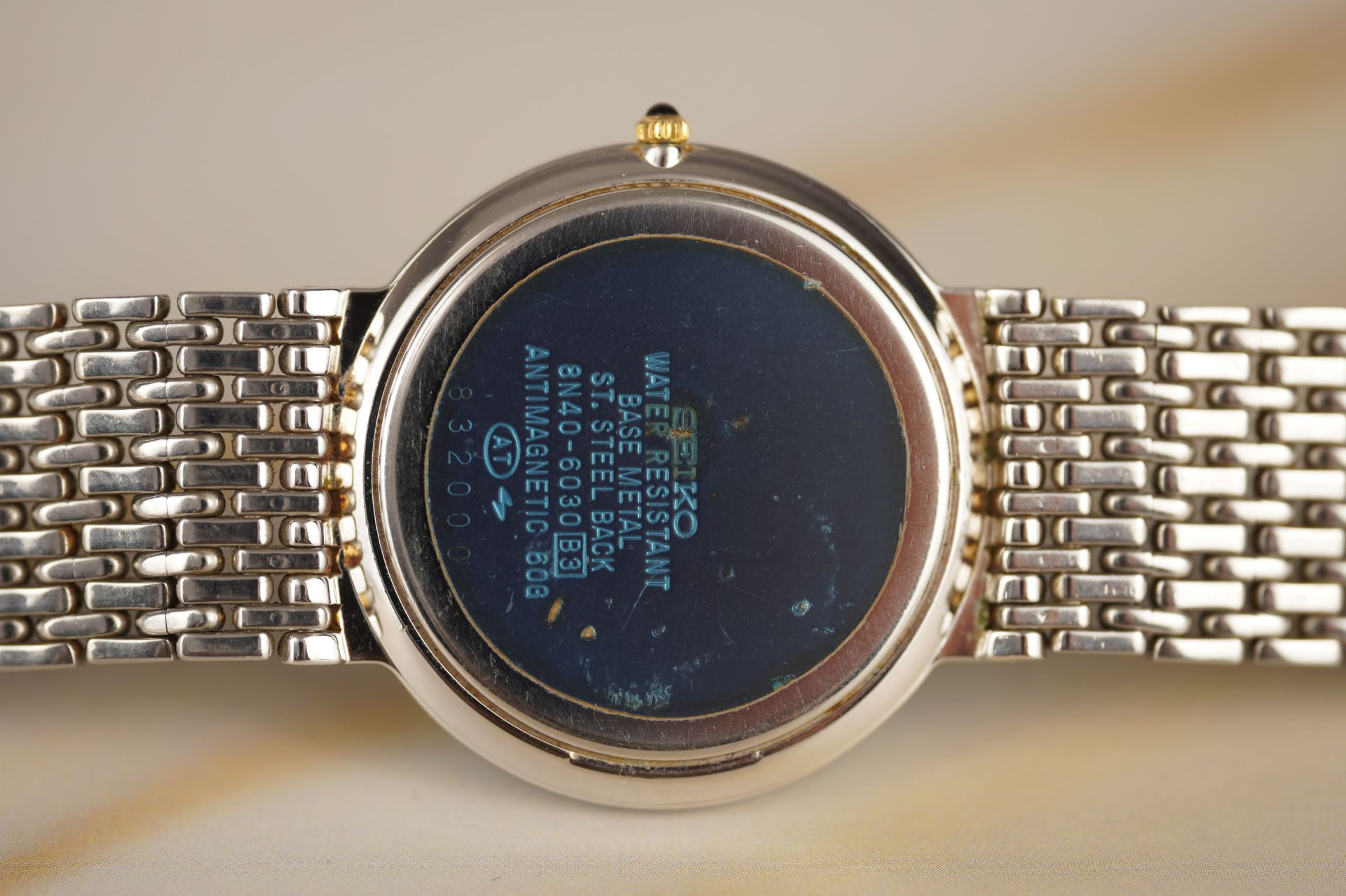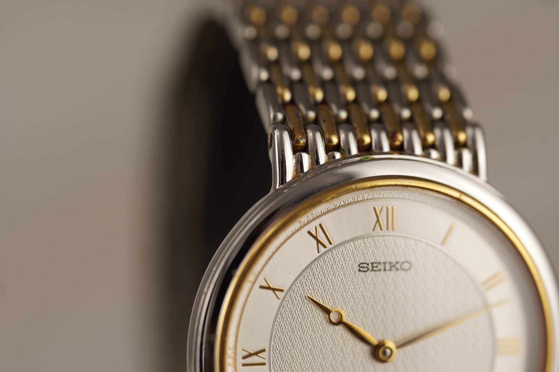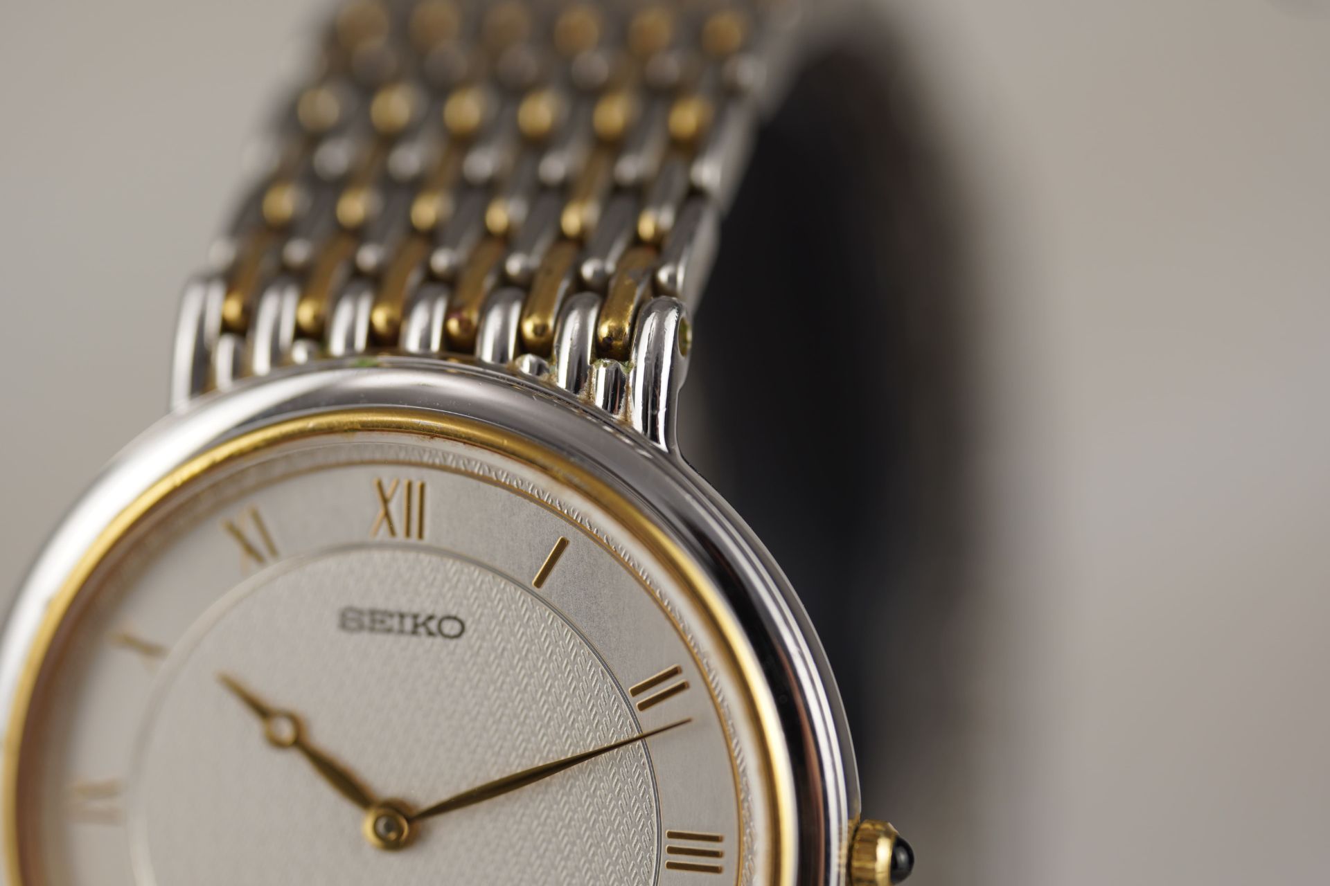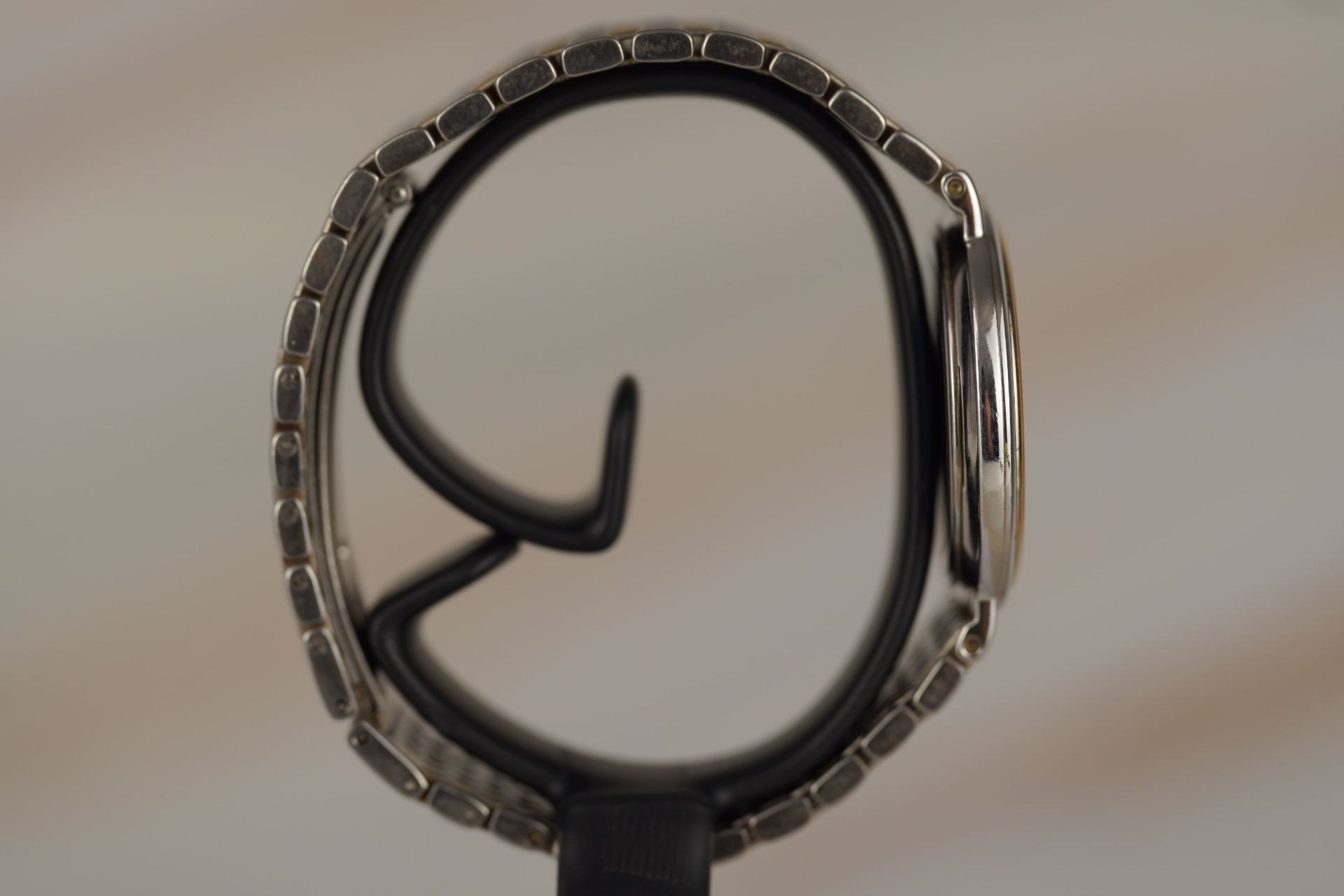 Découvrez l’élégance intemporelle de cette montre Seiko Dolce pour homme, référence commerciale 8N40-6030. Ce modèle de 1998, en bon état, est animé par un mouvement à Quartz précis. Son boîtier en acier de 37.8 mm de diamètre et de seulement 5.9 mm d’épaisseur abrite un cadran raffiné. Le bracelet original en acier bicolore or et acier, complété par sa boucle déployante originale, ajoute une touche de distinction au poignet. Avec son étanchéité de 3 ATM, cette Seiko Dolce allie sophistication et fonctionnalité. Elle bénéficie d’une garantie de 12 mois.