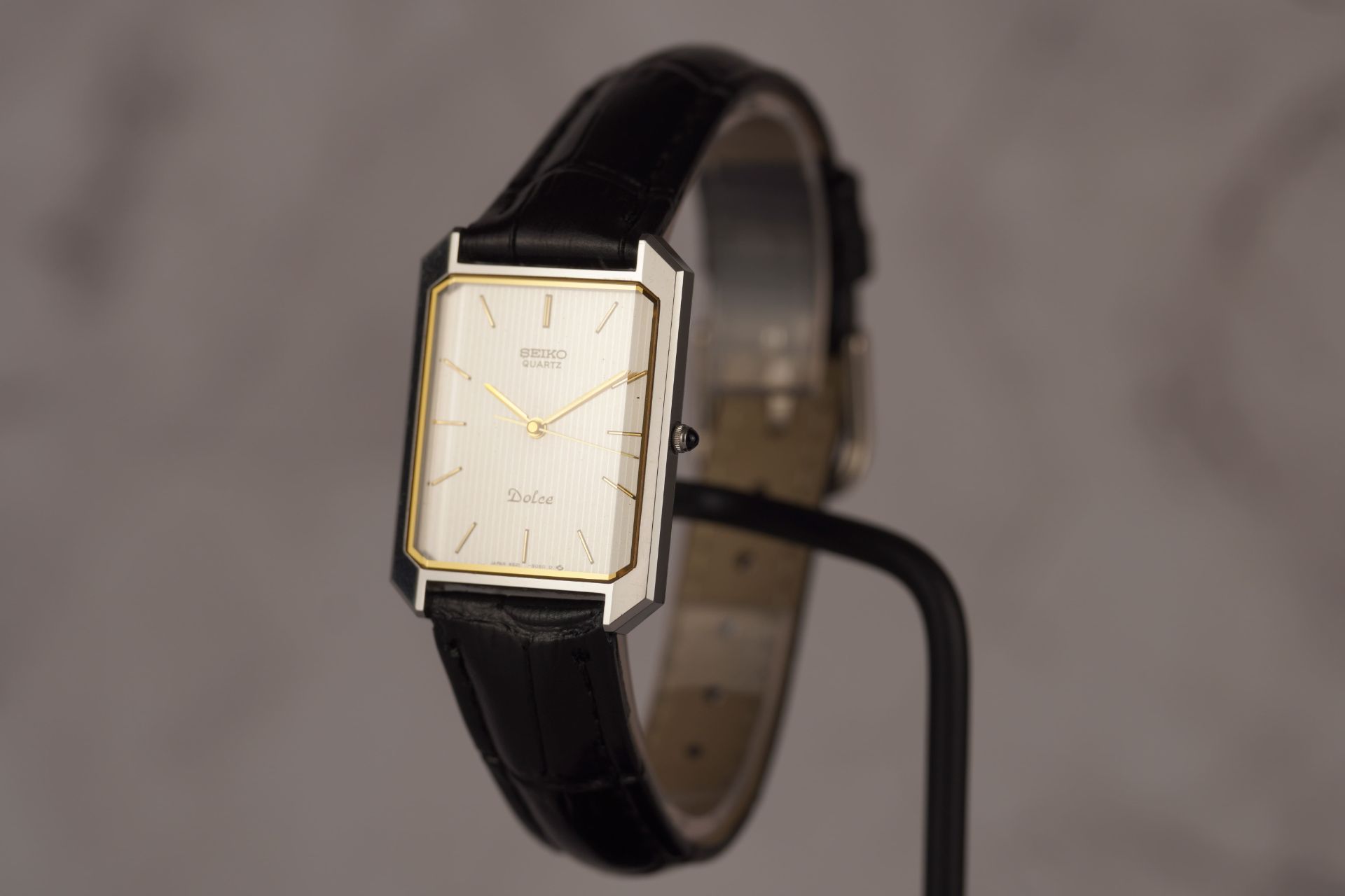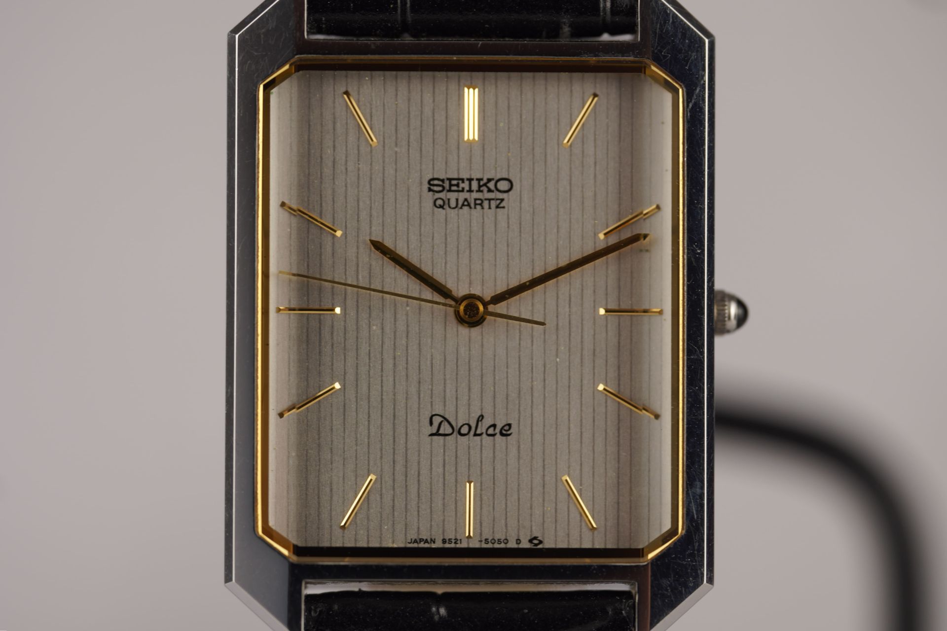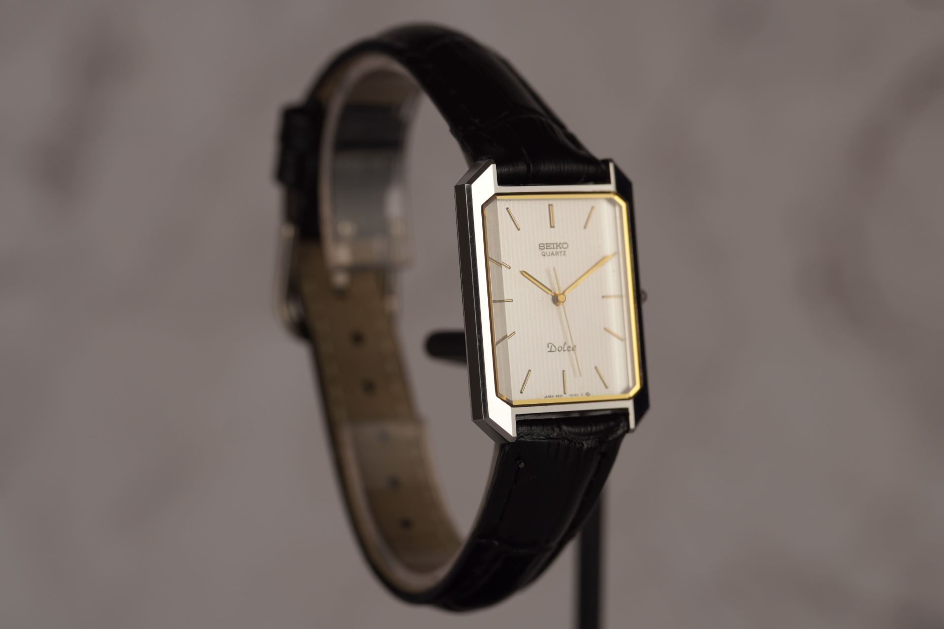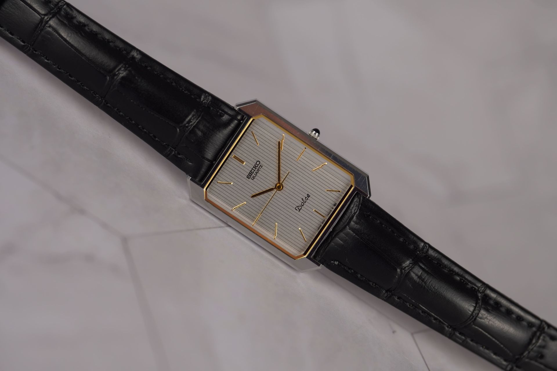 Découvrez l’élégance intemporelle de cette montre Seiko Dolce Tank, référence commerciale 9521-5060, une pièce unisexe de l’année 1984. Animée par un mouvement Quartz d’une grande précision, elle incarne la fiabilité japonaise. Son boîtier raffiné en acier, d’un diamètre délicat de 25.5mm et d’une épaisseur de seulement 4.9mm, offre une discrétion remarquable au poignet.