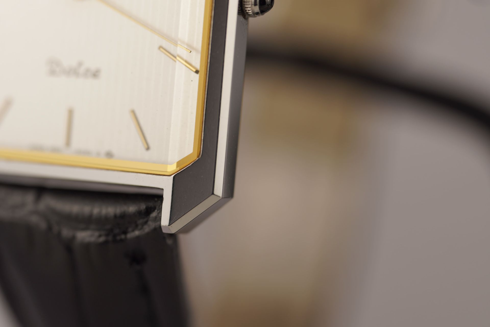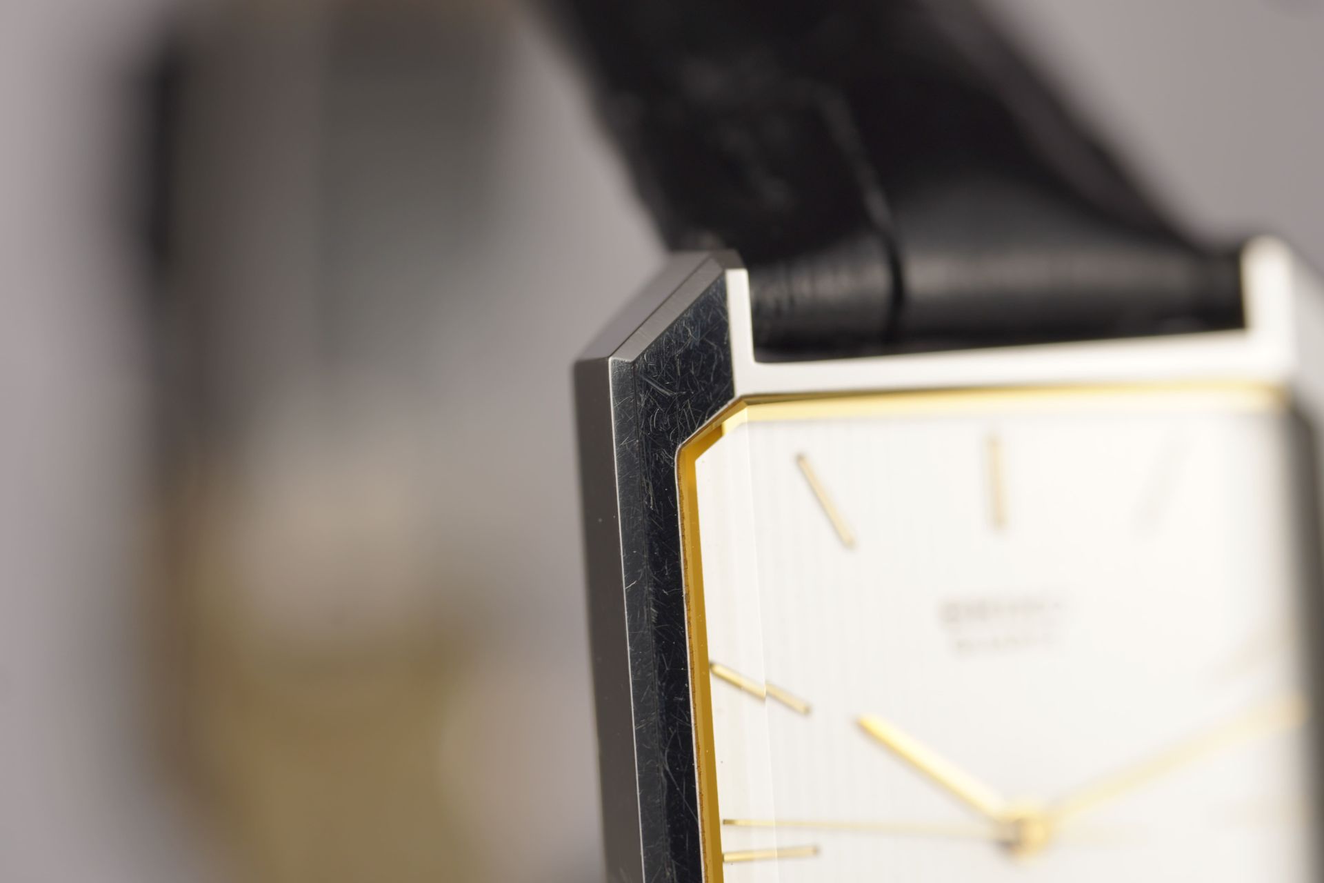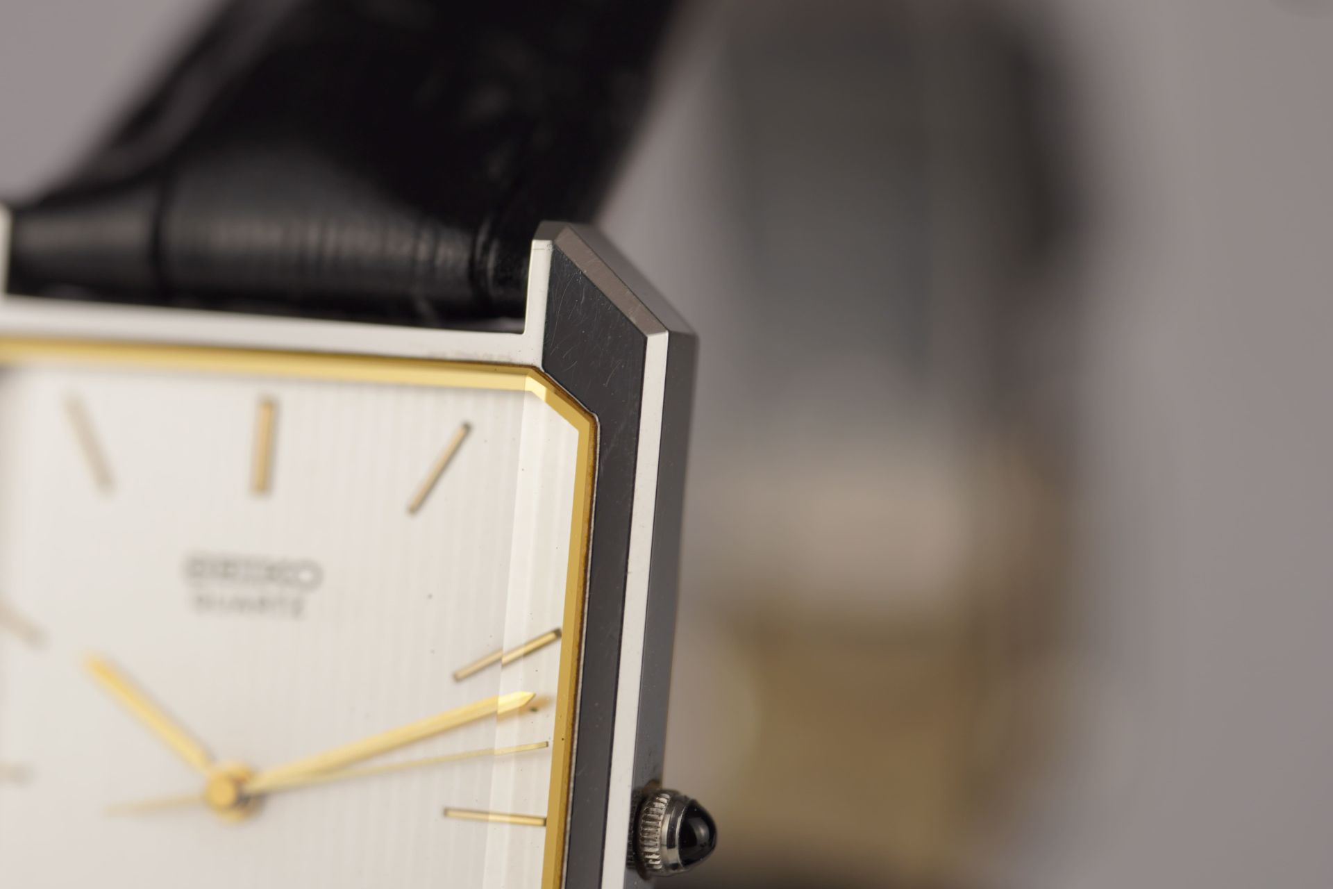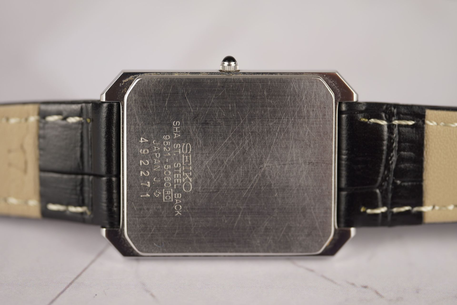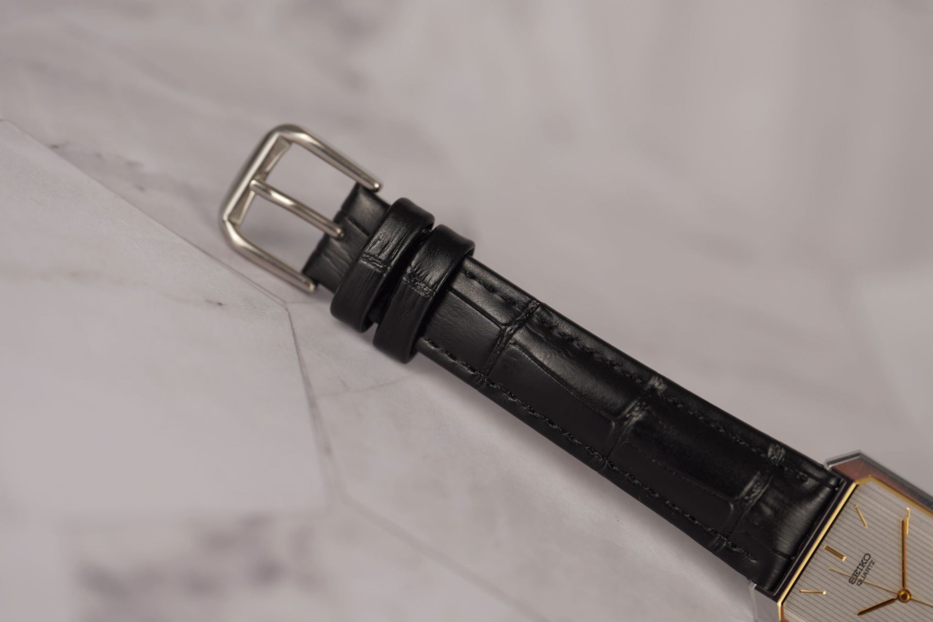 Découvrez l’élégance intemporelle de cette montre Seiko Dolce Tank, référence commerciale 9521-5060, une pièce unisexe de l’année 1984. Animée par un mouvement Quartz d’une grande précision, elle incarne la fiabilité japonaise. Son boîtier raffiné en acier, d’un diamètre délicat de 25.5mm et d’une épaisseur de seulement 4.9mm, offre une discrétion remarquable au poignet.