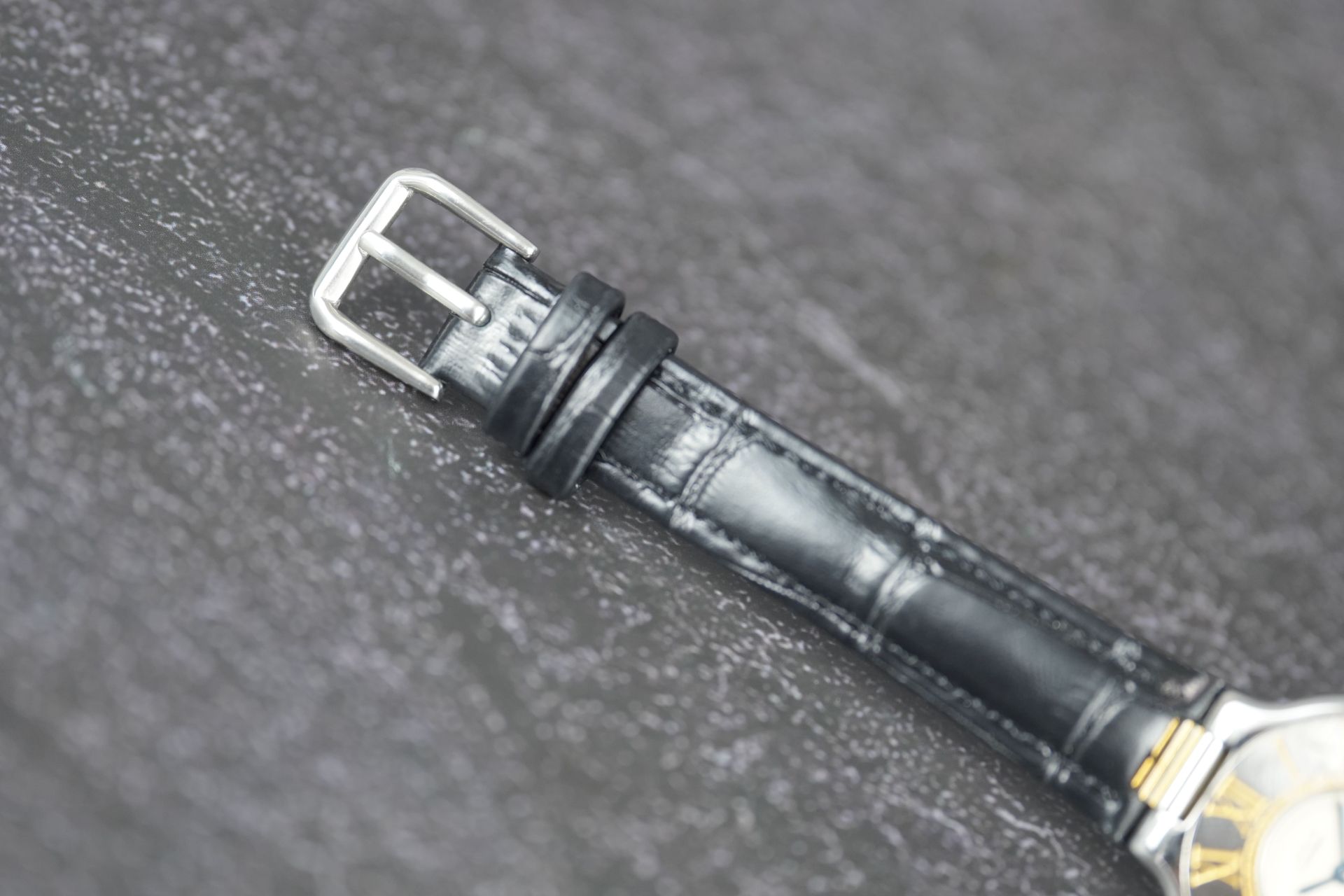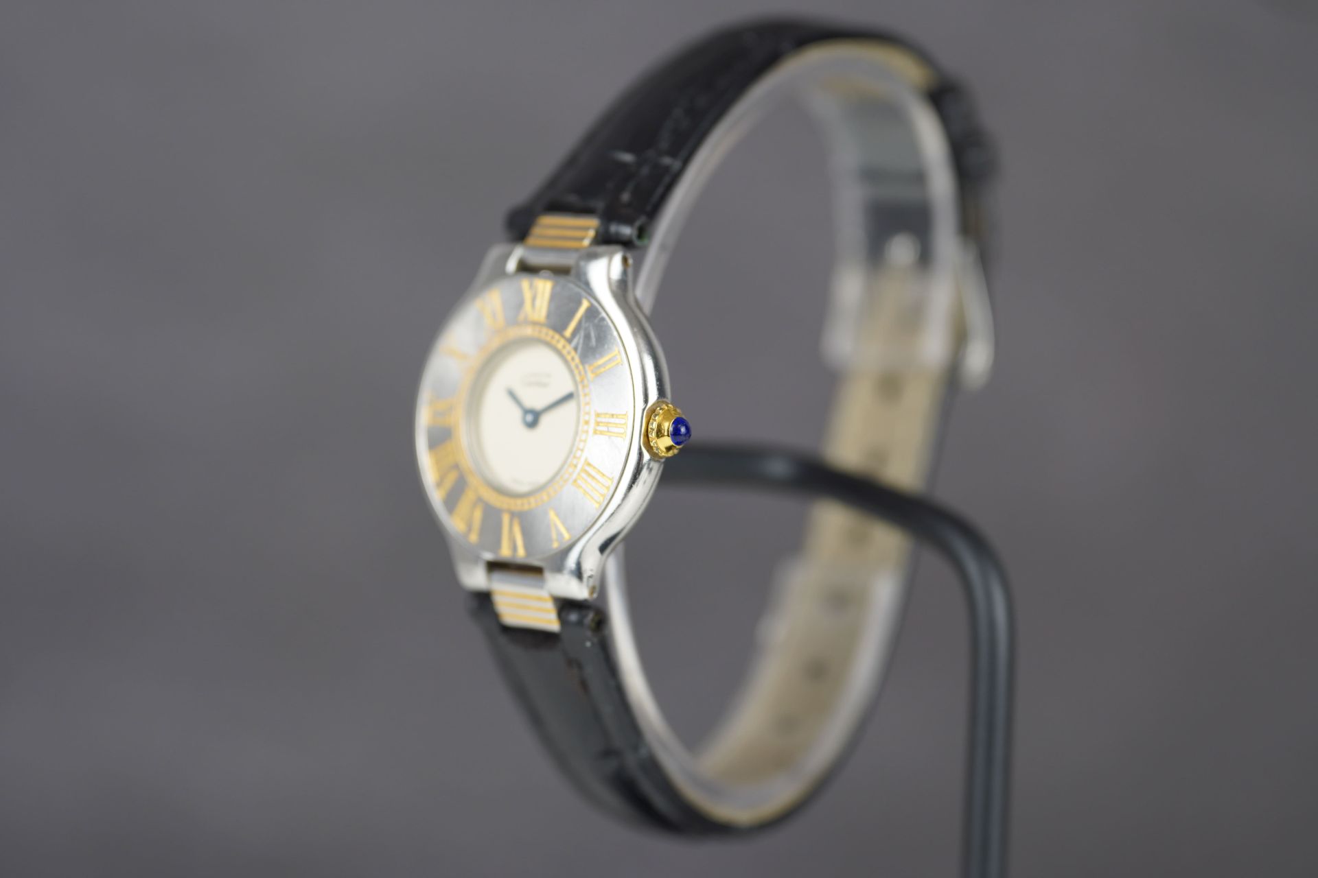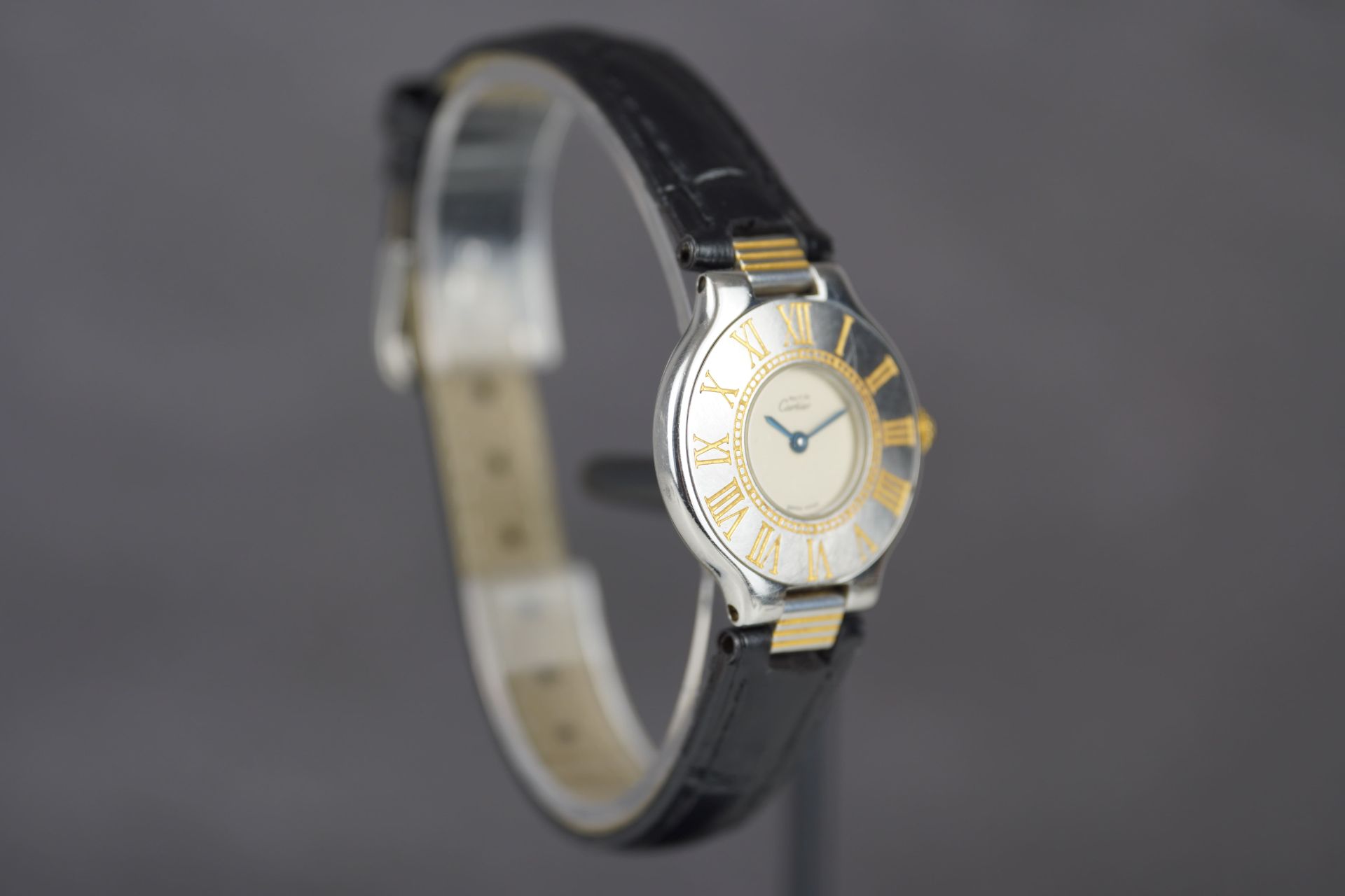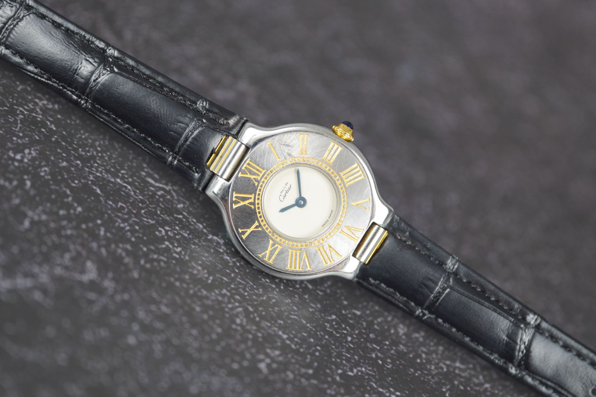 Découvrez la Cartier Must De 21 (Réf. 125000P), une montre féminine au charme intemporel. Son boîtier en acier de 28 mm, avec une épaisseur de 5,2 mm, loge un mouvement à Quartz précis. Le bracelet en cuir noir, bien que non-original, s’accompagne d’une boucle ardillon. Cette montre, qui affiche un bon état général, est livrée seule et bénéficie d’une garantie de 12 mois.