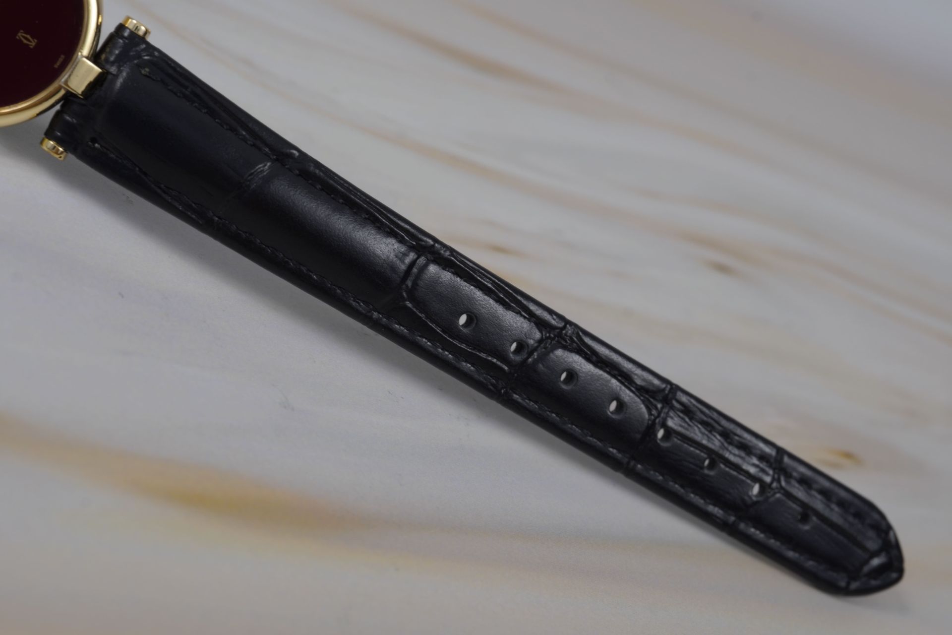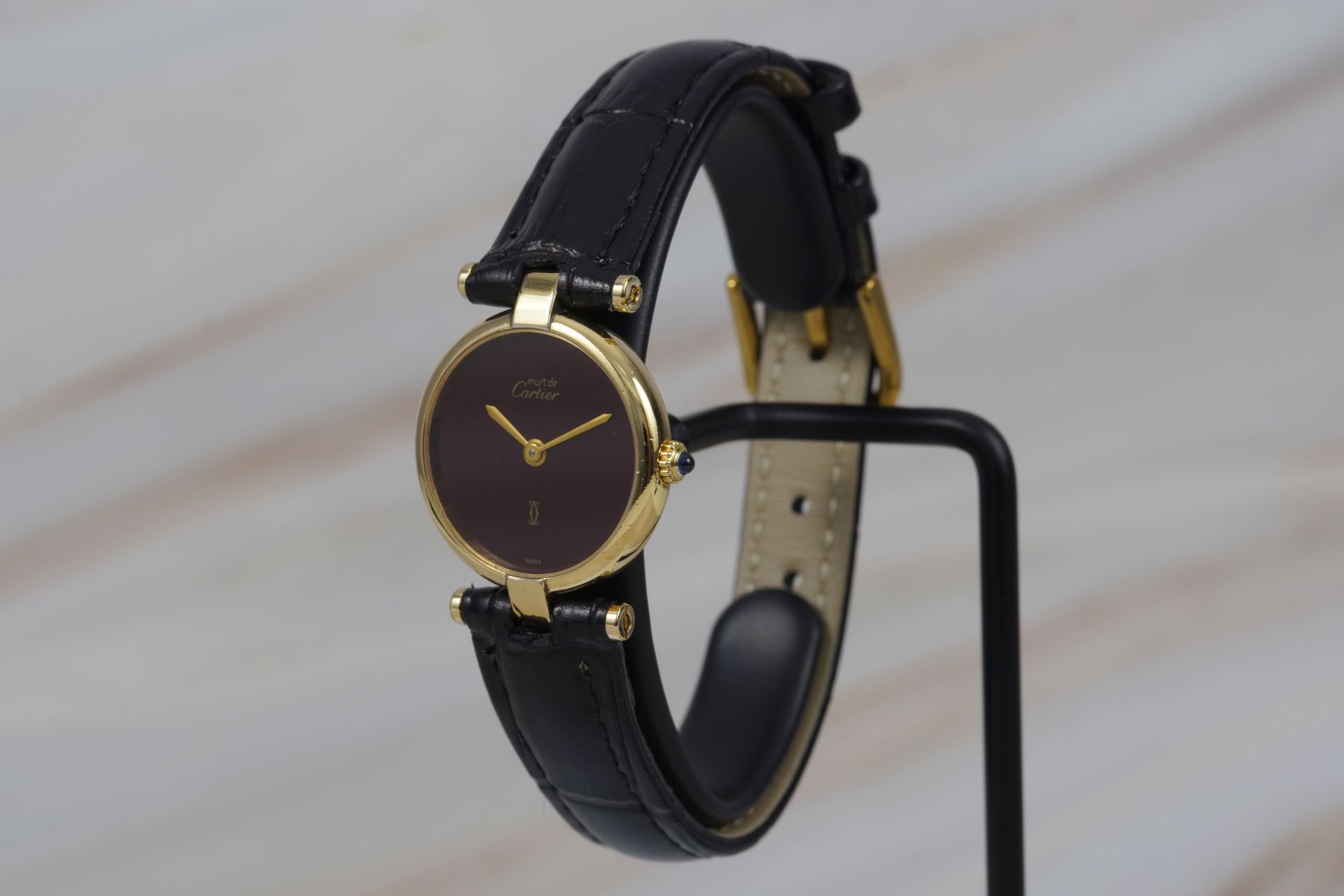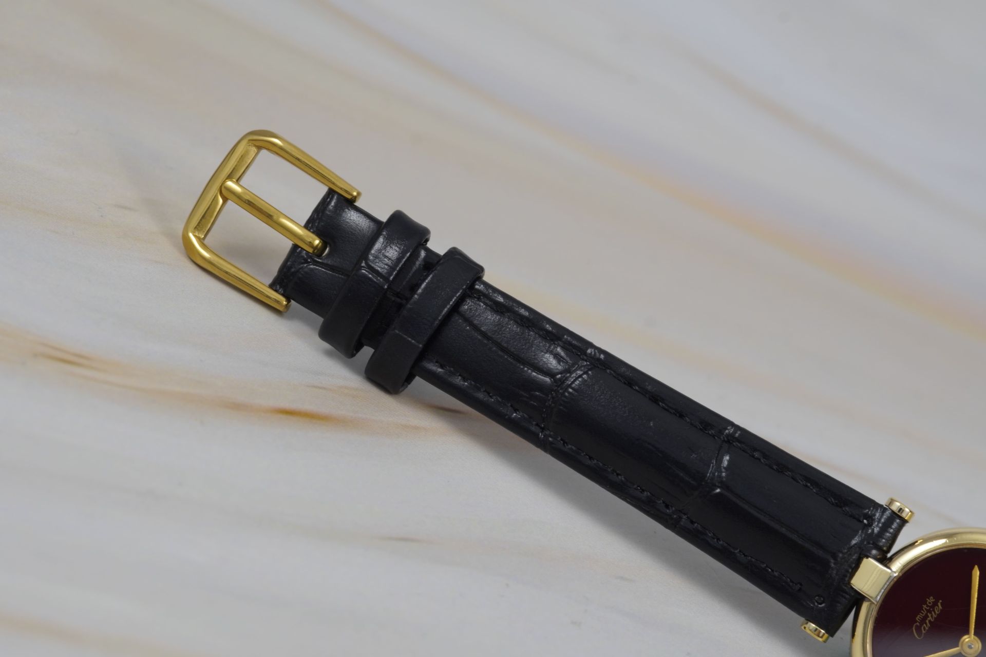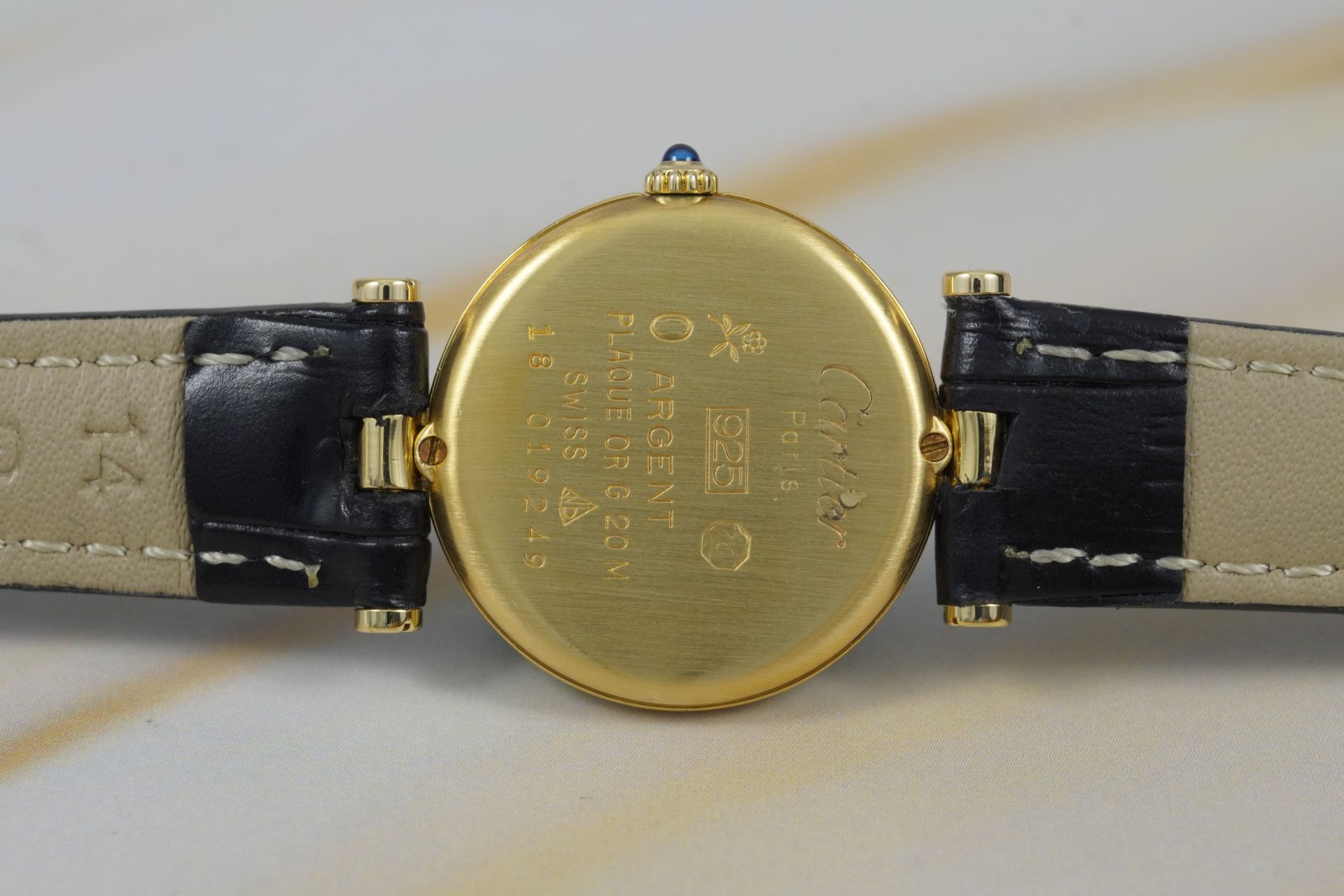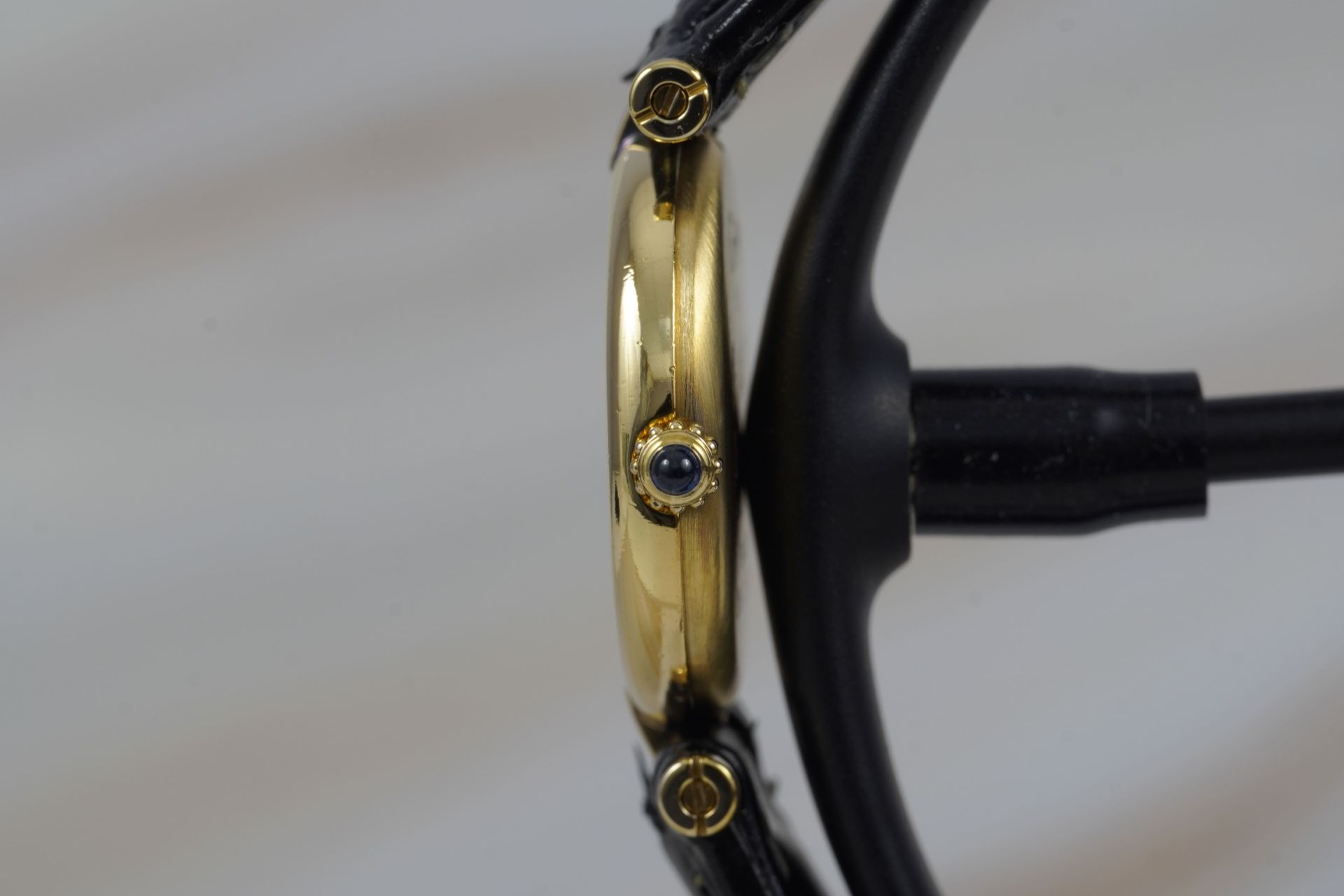 Découvrez l’élégance intemporelle de la Cartier Must De Vendôme, Référence 18019249. Ce modèle féminin, un classique raffiné, est doté d’un boîtier en argent 925 plaqué or (« vermeil ») de 24mm de diamètre et de 5mm d’épaisseur, incarnant la délicatesse et le luxe subtil de la Maison Cartier. Son mouvement à Quartz assure une précision fiable. La montre est actuellement accompagnée d’un bracelet en cuir noir non-original, assorti d’une boucle ardillon également non-originale. Cette pièce, présentée en très bon état, est livrée seule et bénéficie d’une garantie d’un an, vous offrant une tranquillité d’esprit pour votre acquisition.