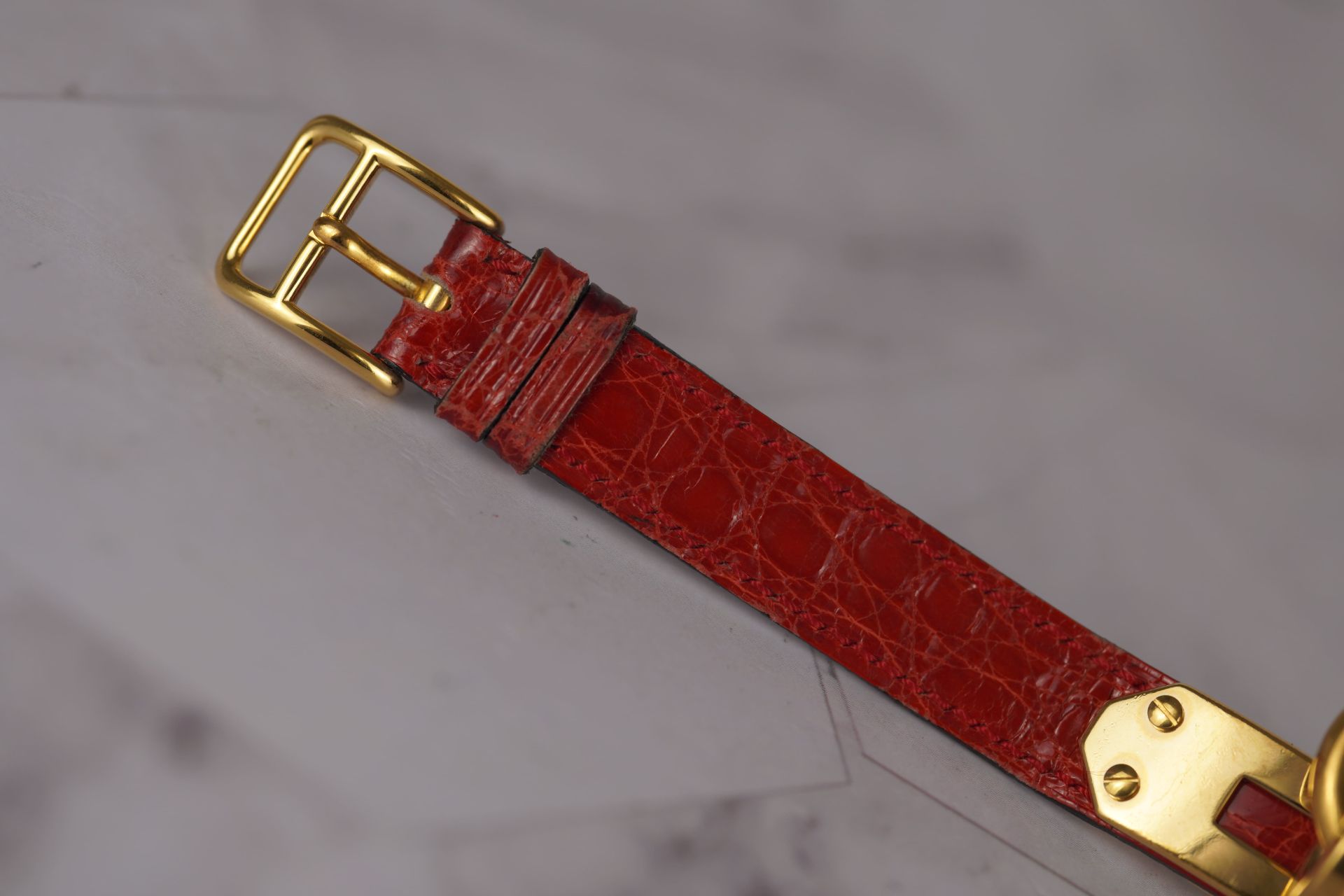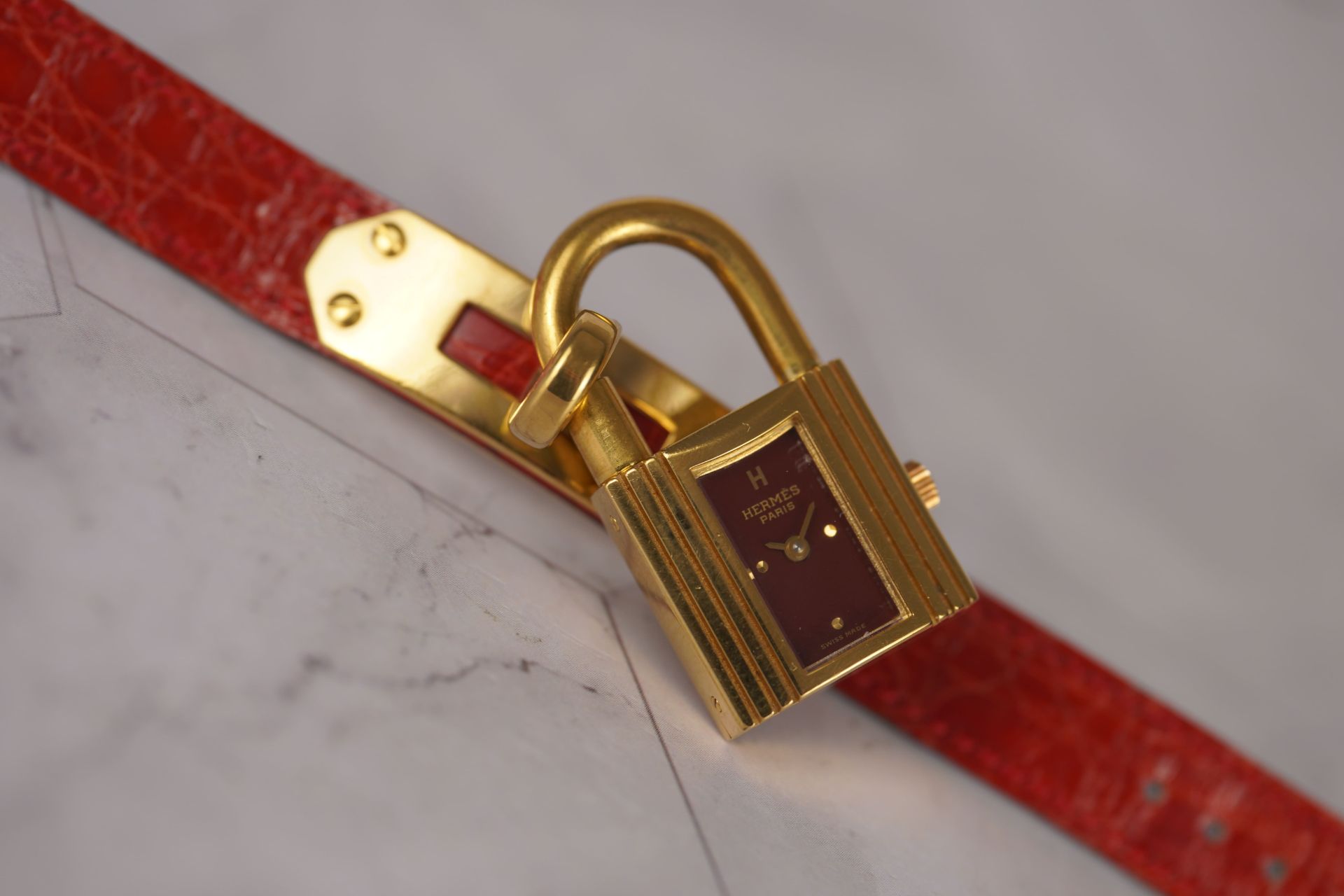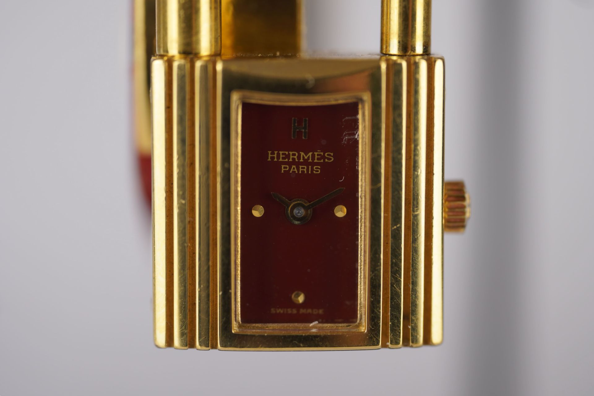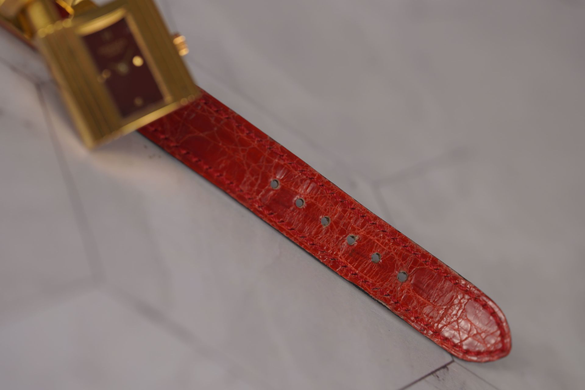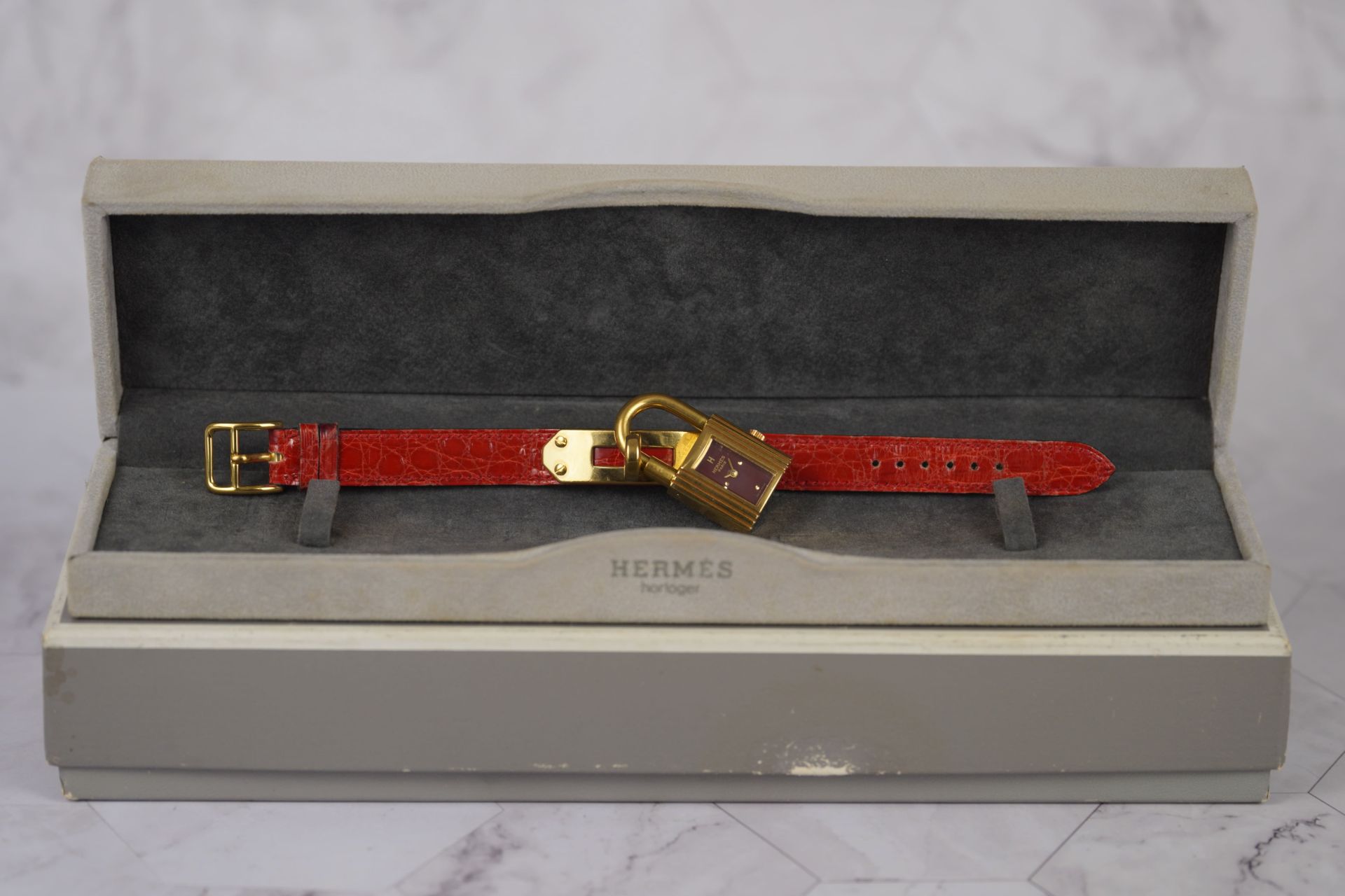 Découvrez la montre Hermès Kelly (Réf. KE1.210), un emblème intemporel de l’élégance féminine. Son boîtier plaqué or de 20 mm, d’une finesse de 8,6 mm, renferme un mouvement à quartz précis, alliant raffinement et fiabilité. Cette pièce est sublimée par son bracelet en cuir bordeaux d’origine, fermement maintenu par sa boucle ardillon, elle aussi d’origine, apportant une touche de couleur et de luxe. Livrée avec son coffret, cette montre en bon état est une invitation à adopter le style distinctif d’Hermès. Elle bénéficie d’une garantie de 12 mois.