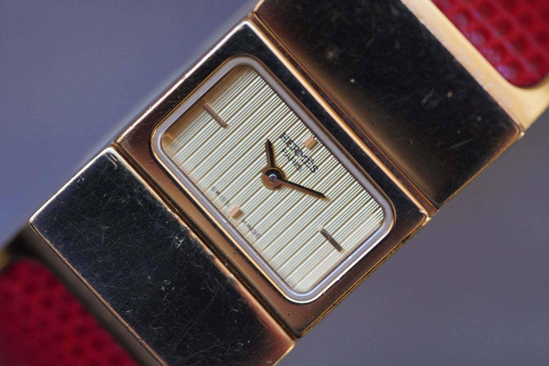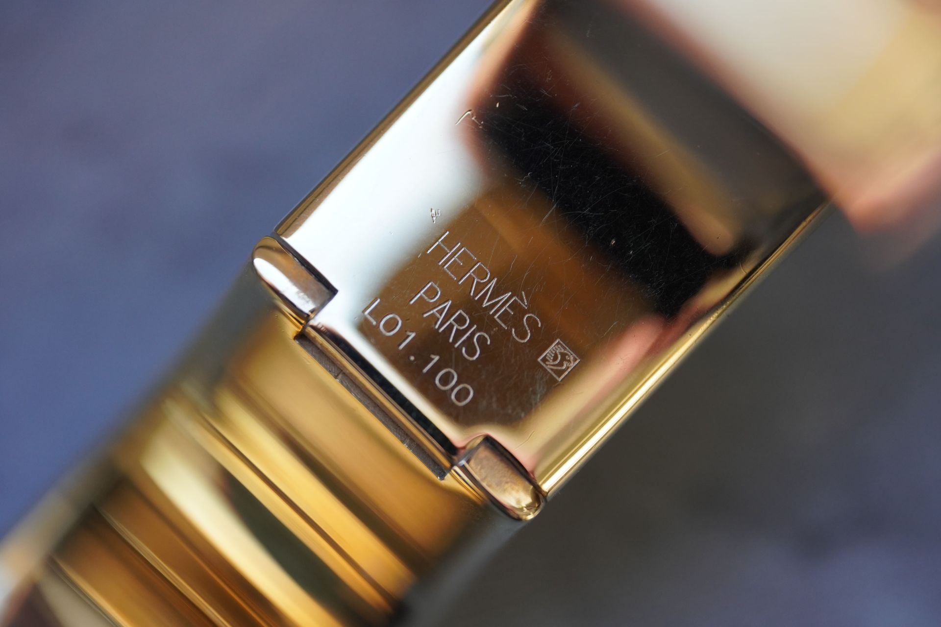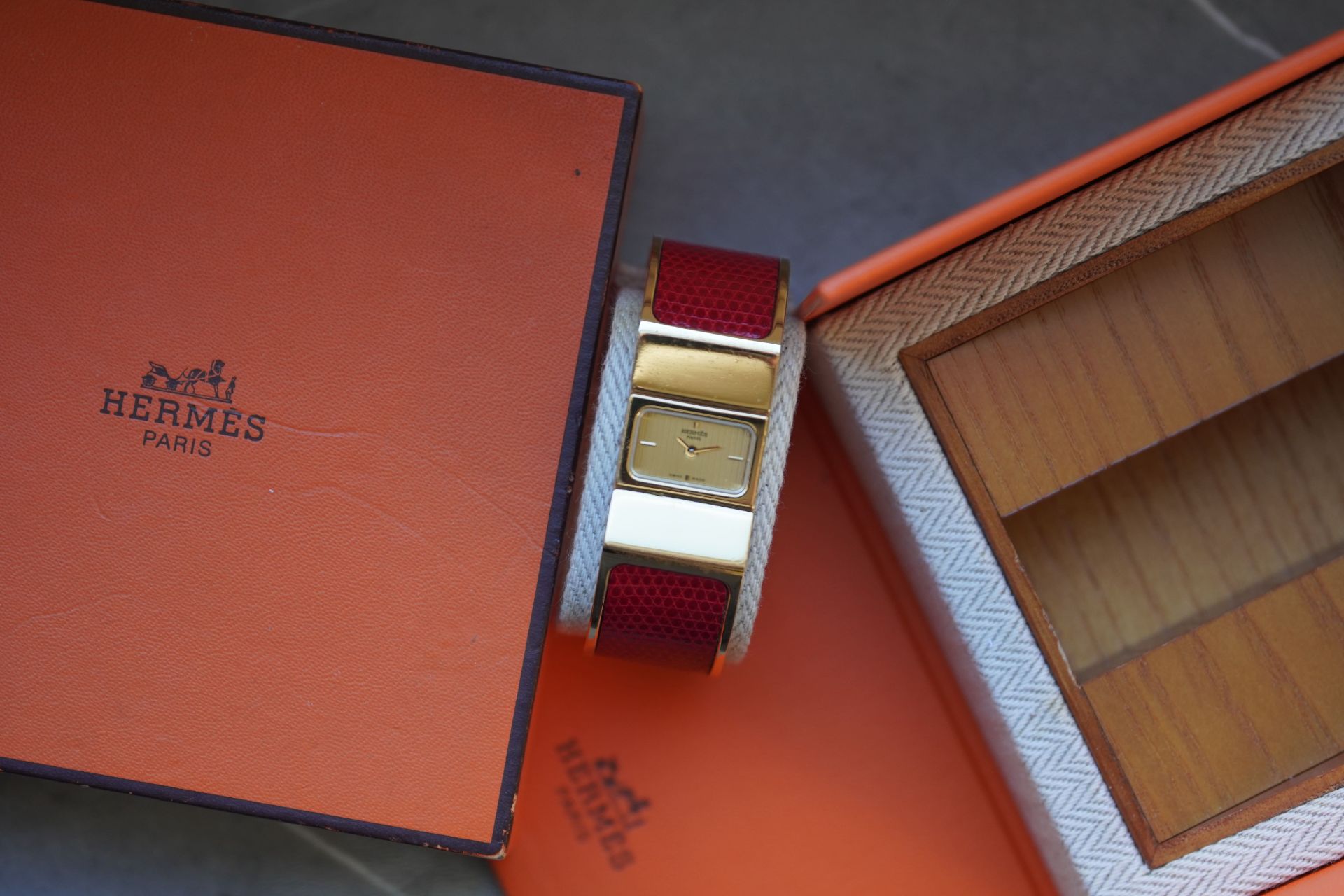 Découvrez l’élégance intemporelle avec cette montre Hermès Loquet, référence LO1.201. Conçue pour la femme moderne, elle abrite un mouvement à quartz précis dans son boîtier plaqué or de 19 mm de diamètre et 5.1 mm d’épaisseur. Son bracelet original en acier, avec une touche de cuir d’un profond bordeaux, s’harmonise parfaitement avec le boîtier, et est sécurisé par un fermoir bijoux original. Acquise en 1997, elle est livrée complète et bénéficie d’une garantie de 12 mois.