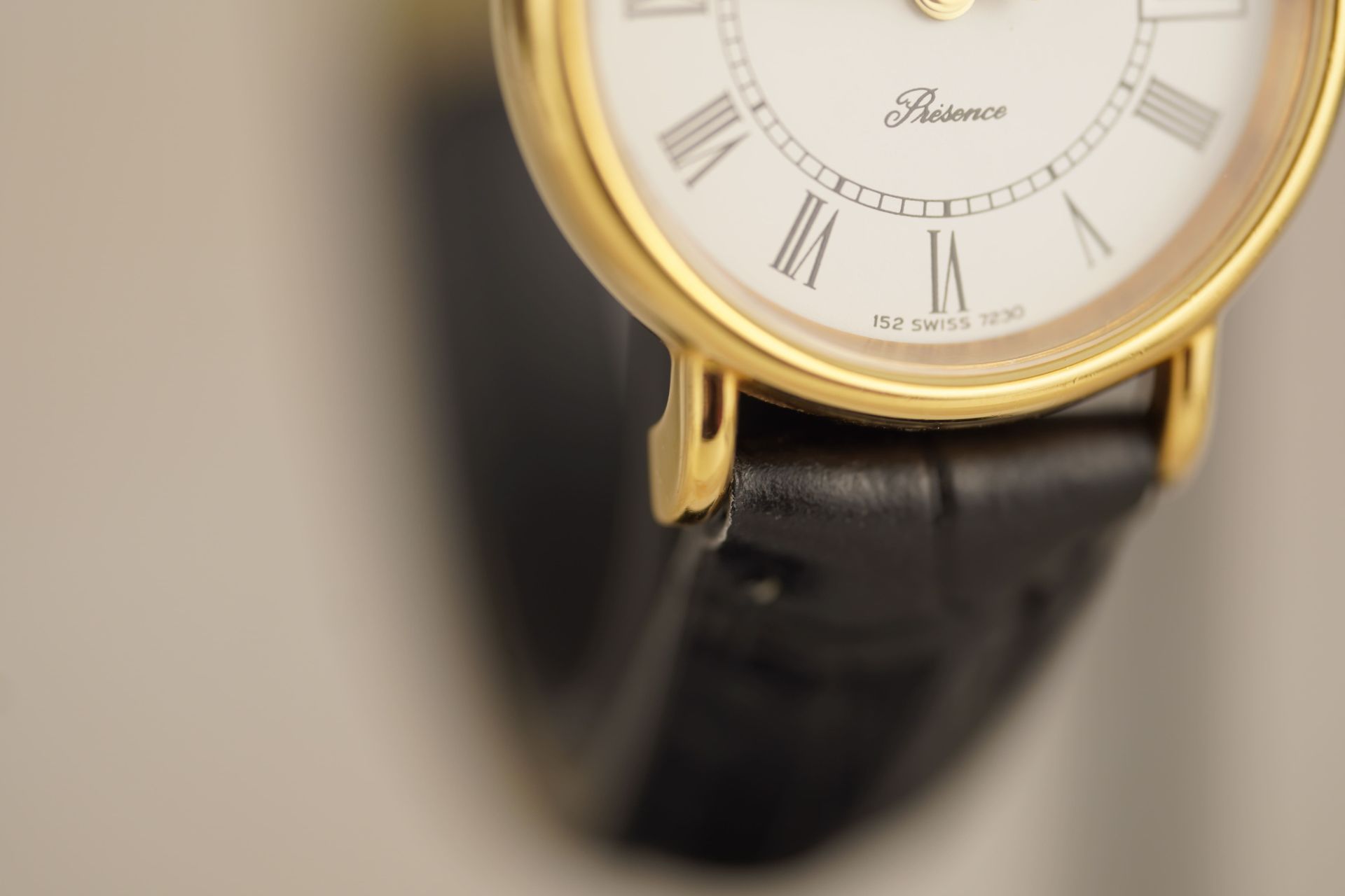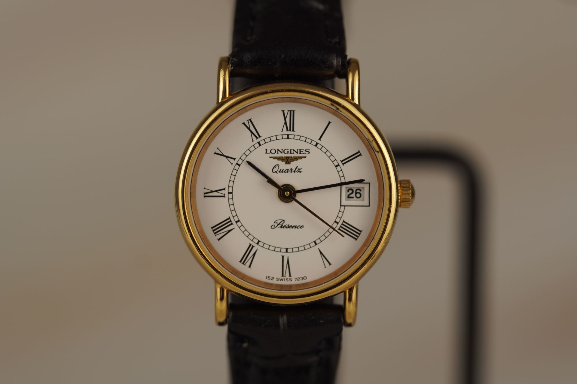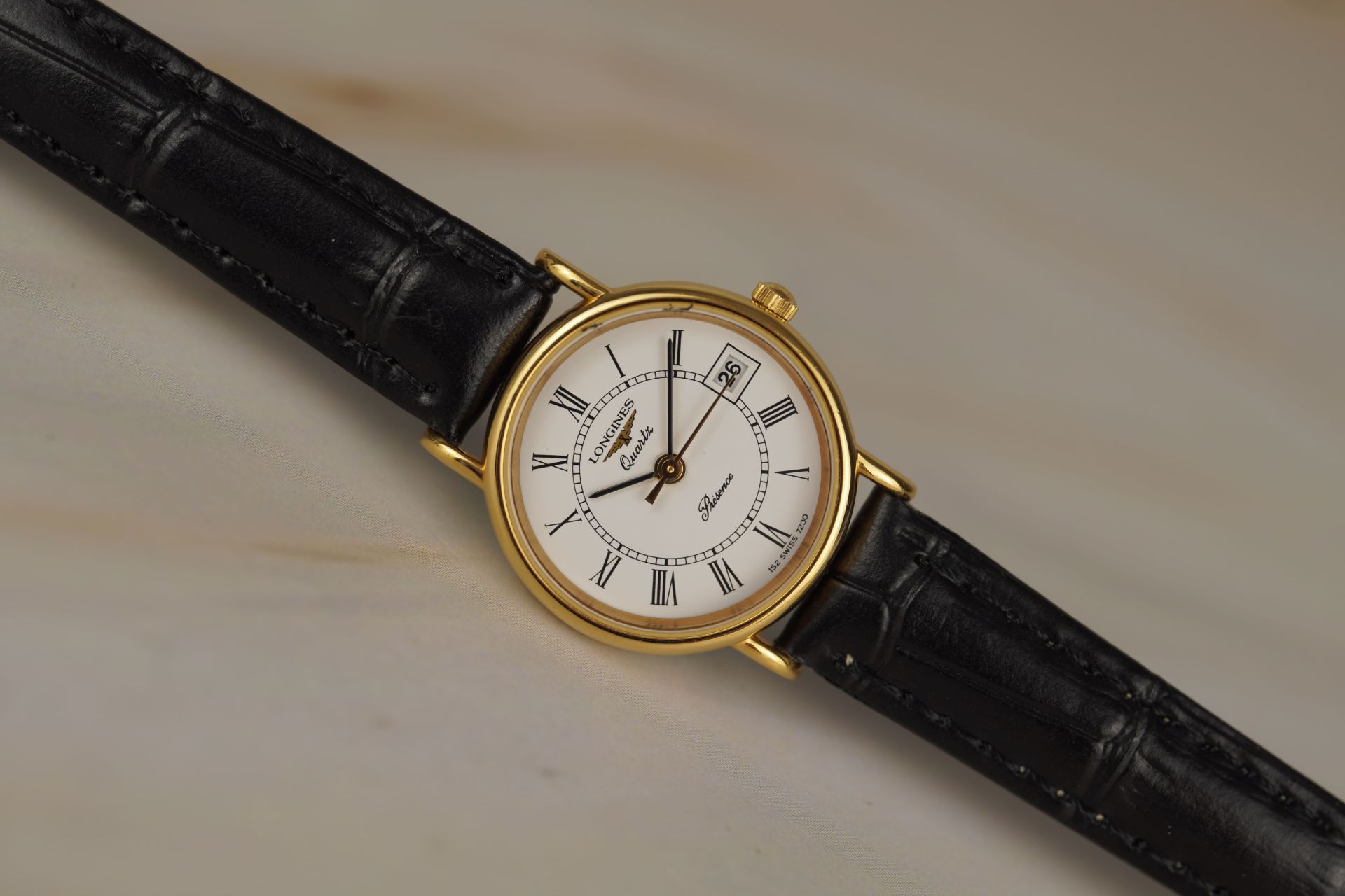 Découvrez l’élégance intemporelle avec cette montre Longines Présence Quartz, référence commerciale 152 7230. Son boîtier plaqué or de 23 mm de diamètre et 5.4 mm d’épaisseur abrite un mouvement Quartz précis, symbolisant le raffinement féminin. Le bracelet en cuir noir non-original, doté d’une boucle ardillon non-originale, s’harmonise parfaitement avec les lignes épurées de ce modèle. Présentée en bon état et accompagnée d’une garantie de 12 mois, cette pièce est une invitation à la distinction.
