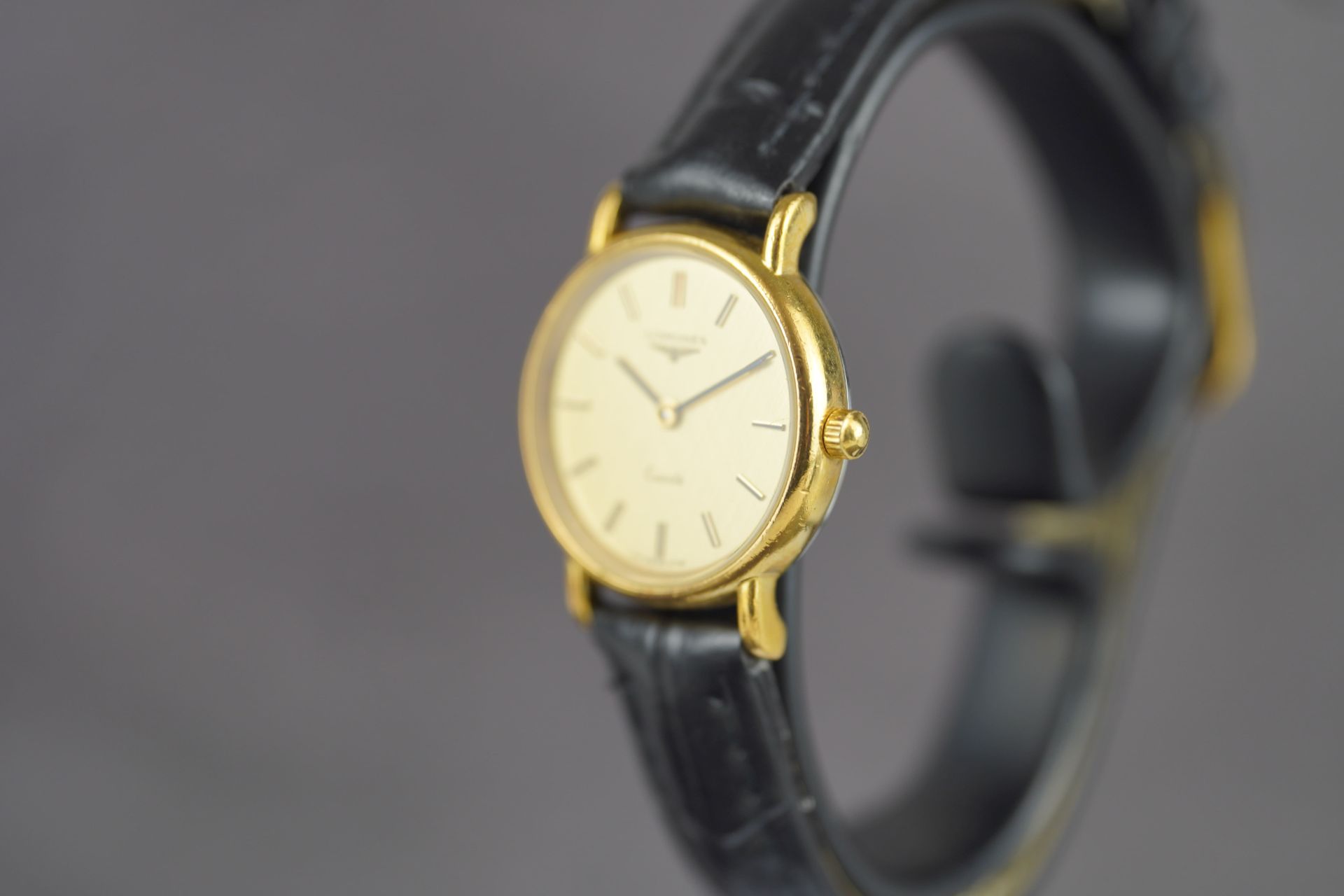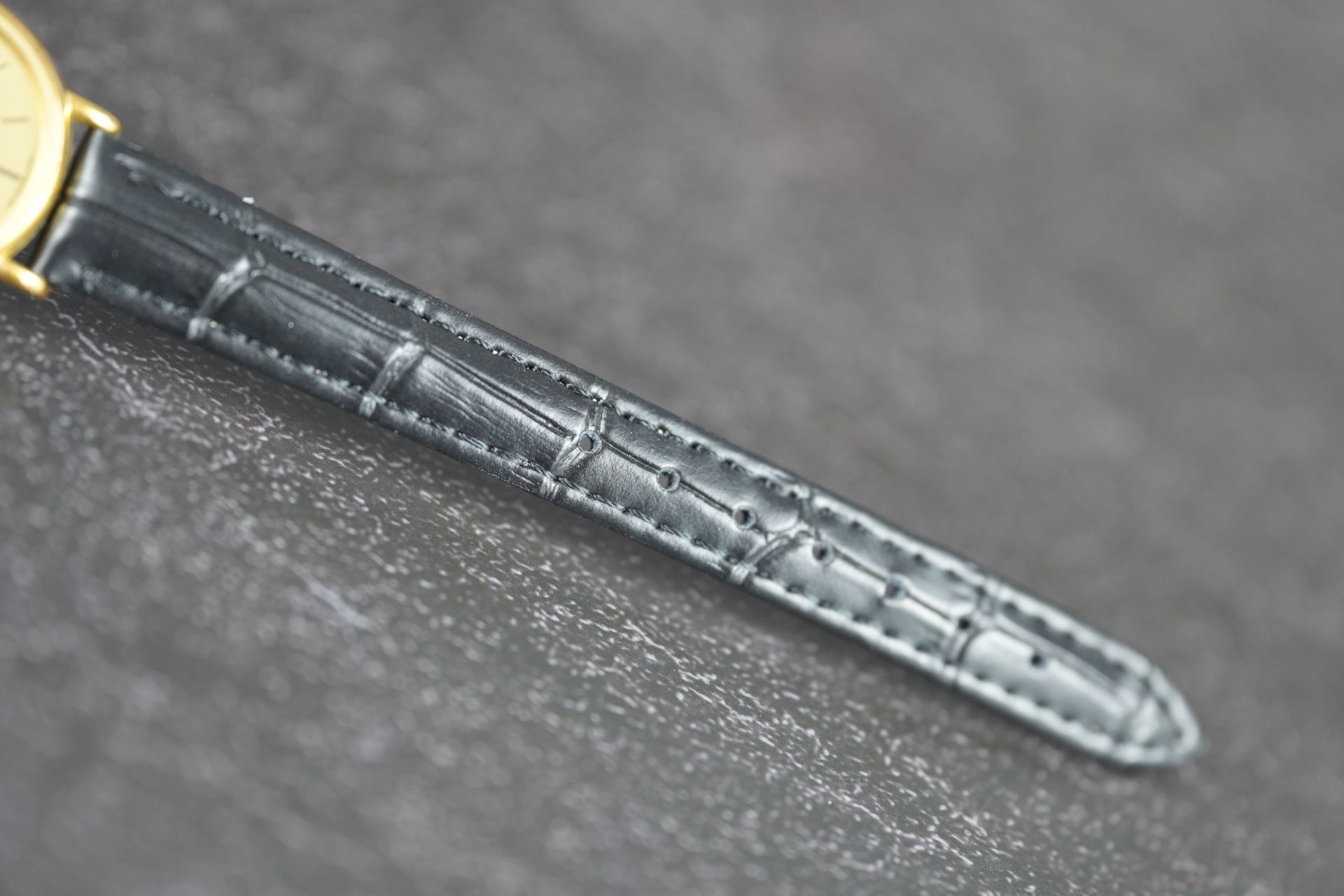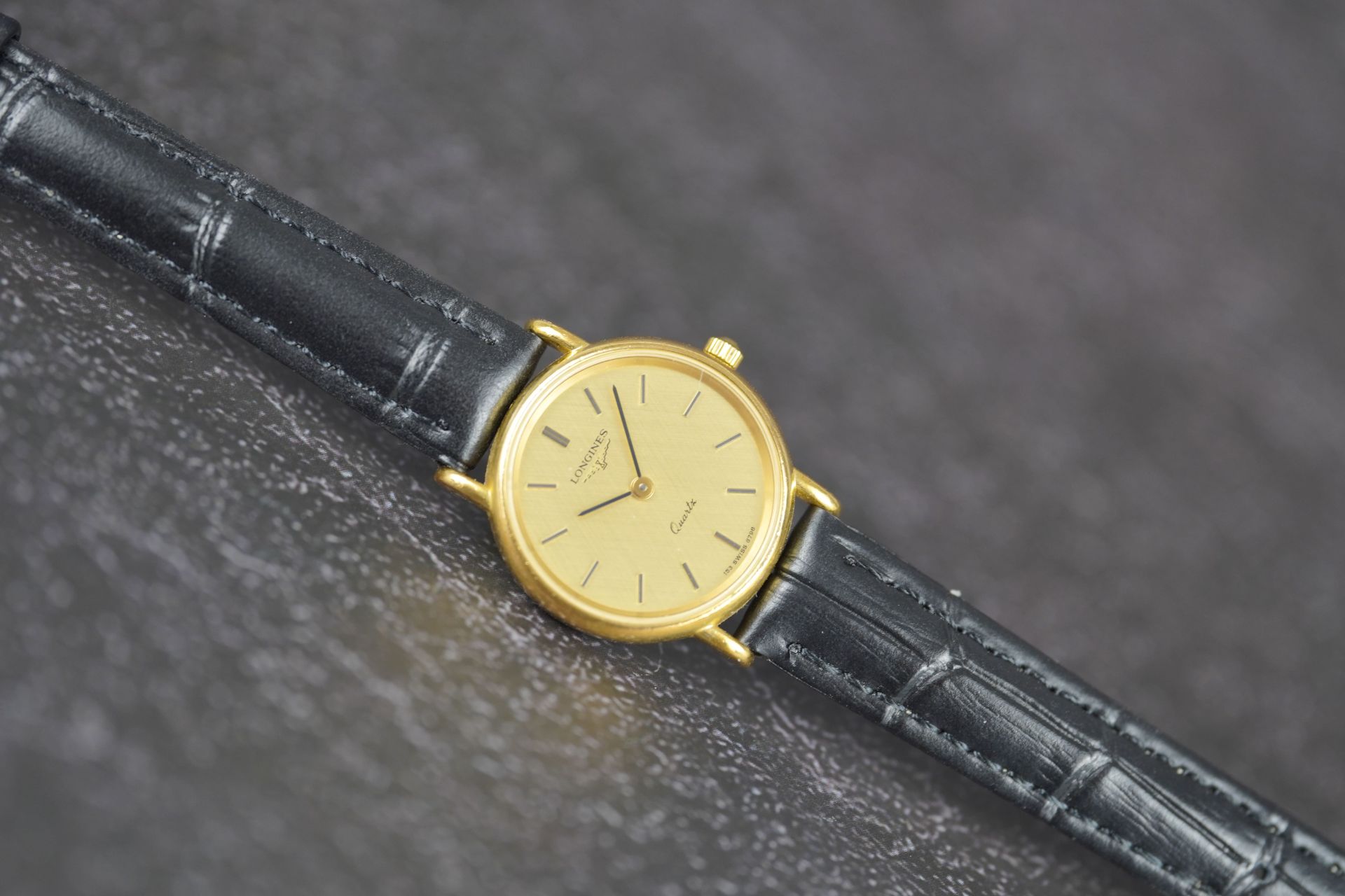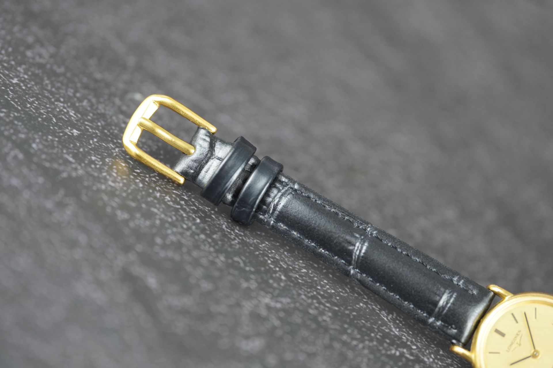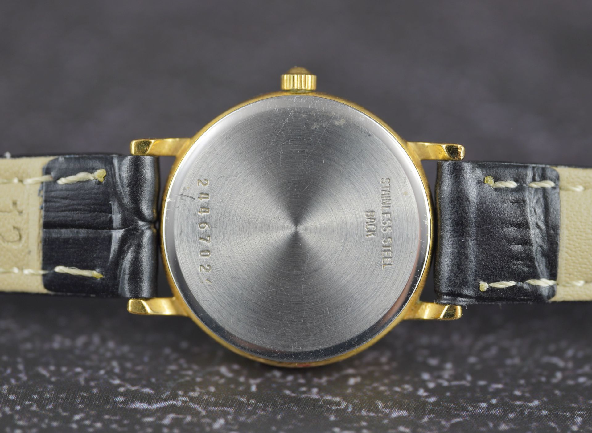 Découvrez l’élégance intemporelle avec cette montre Longines pour femme, Modèle Quartz (réf. 153 6798). Son boîtier délicatement plaqué or, d’un diamètre de 24mm et d’une fine épaisseur de 5mm, abrite un mouvement à quartz d’une précision remarquable. Le cadran, complété par un bracelet en cuir noir (non-original) et une boucle ardillon non originale, confère à cette pièce un charme discret et raffiné.