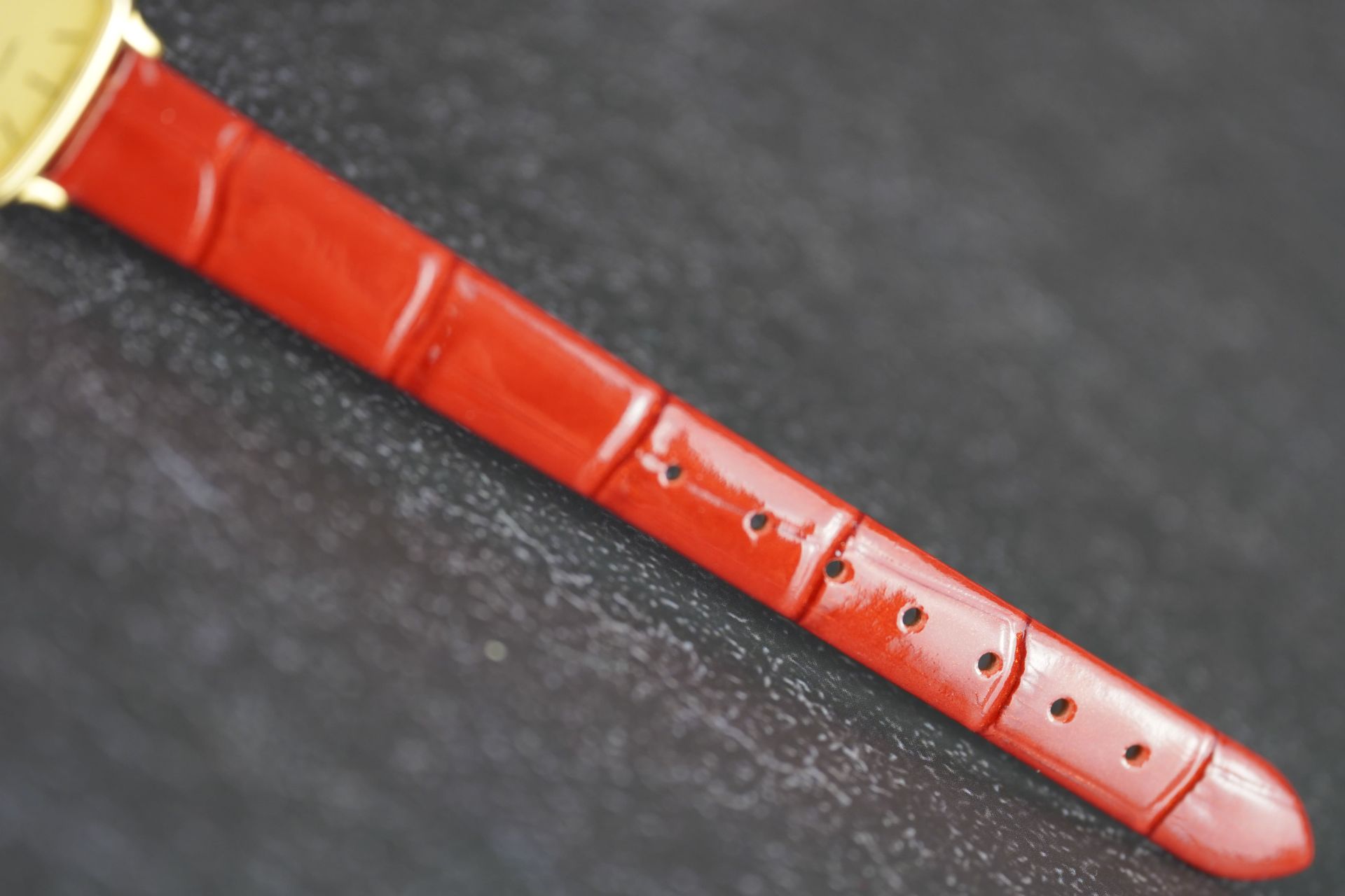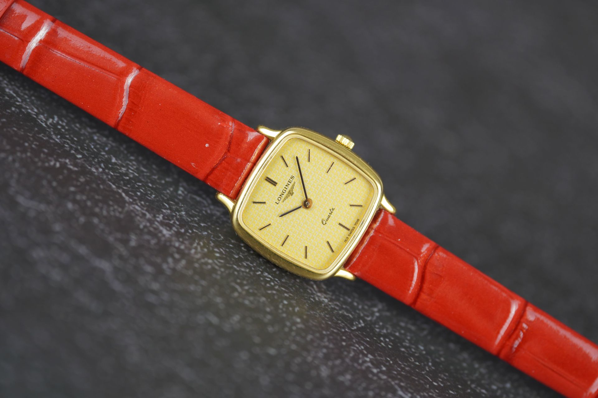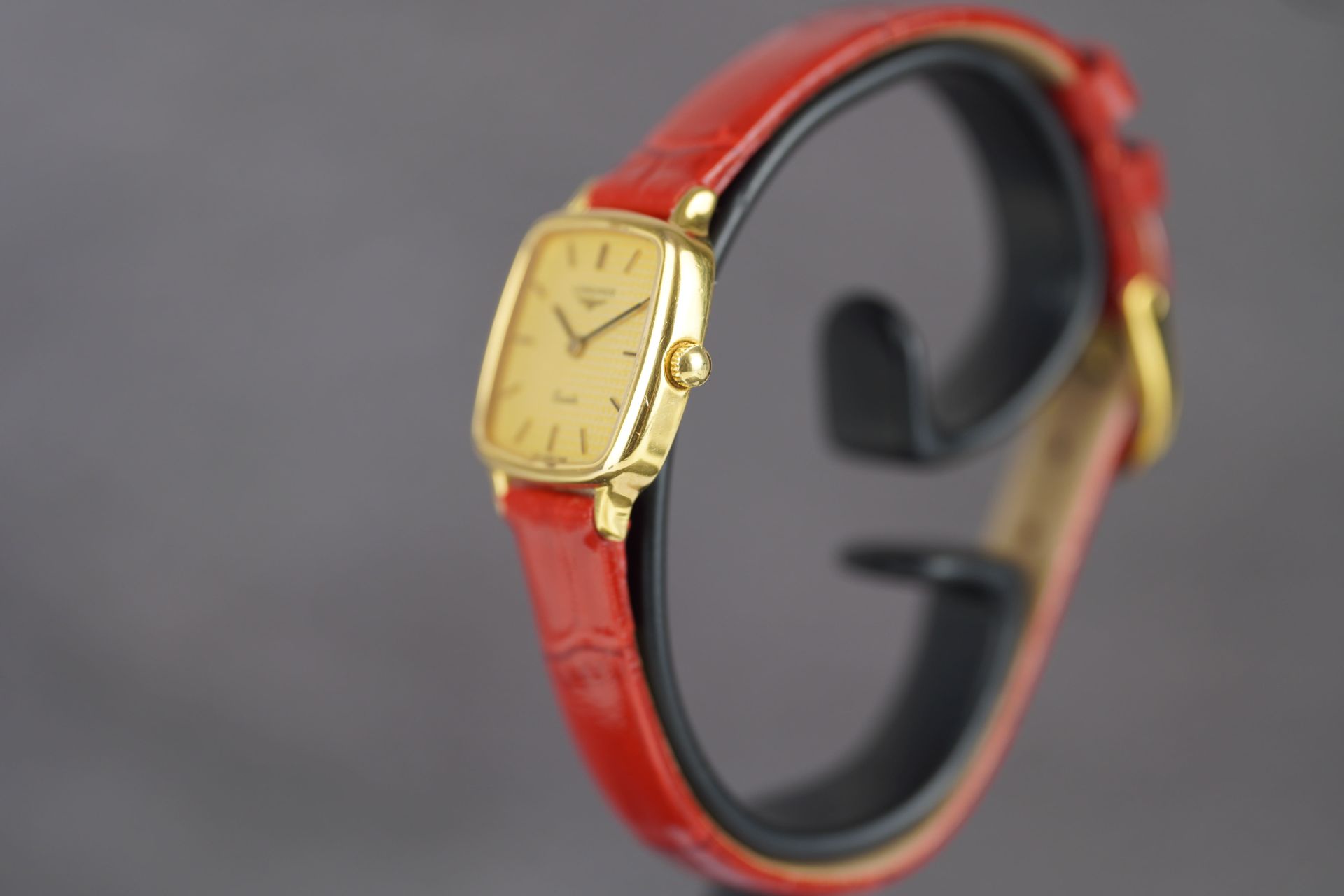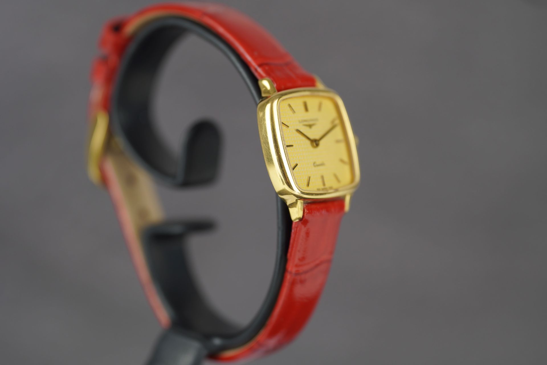 Découvrez l’élégance intemporelle avec cette montre Longines pour femme, un modèle Quartz, réf. 153 7018. Son boîtier plaqué or de 21.6mm de diamètre et de seulement 4.9mm d’épaisseur offre une silhouette délicate au poignet. Animée par un mouvement Quartz fiable, elle assure une précision remarquable. Le bracelet en cuir rouge, bien que non original, apporte une touche de couleur vive, complété par une boucle ardillon non originale.