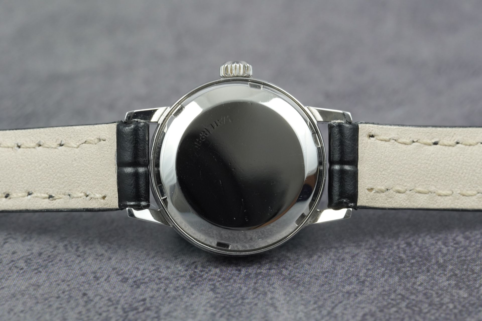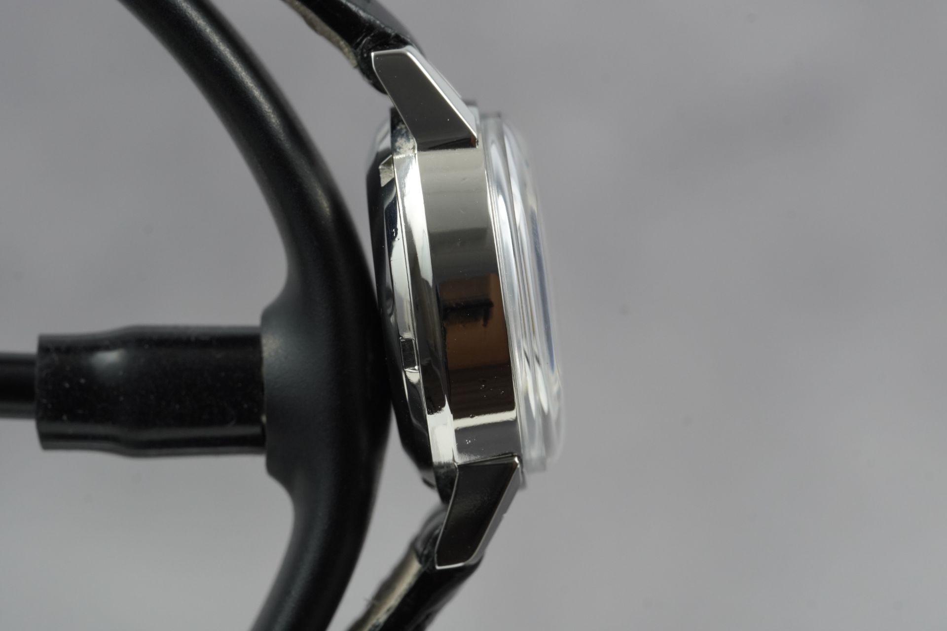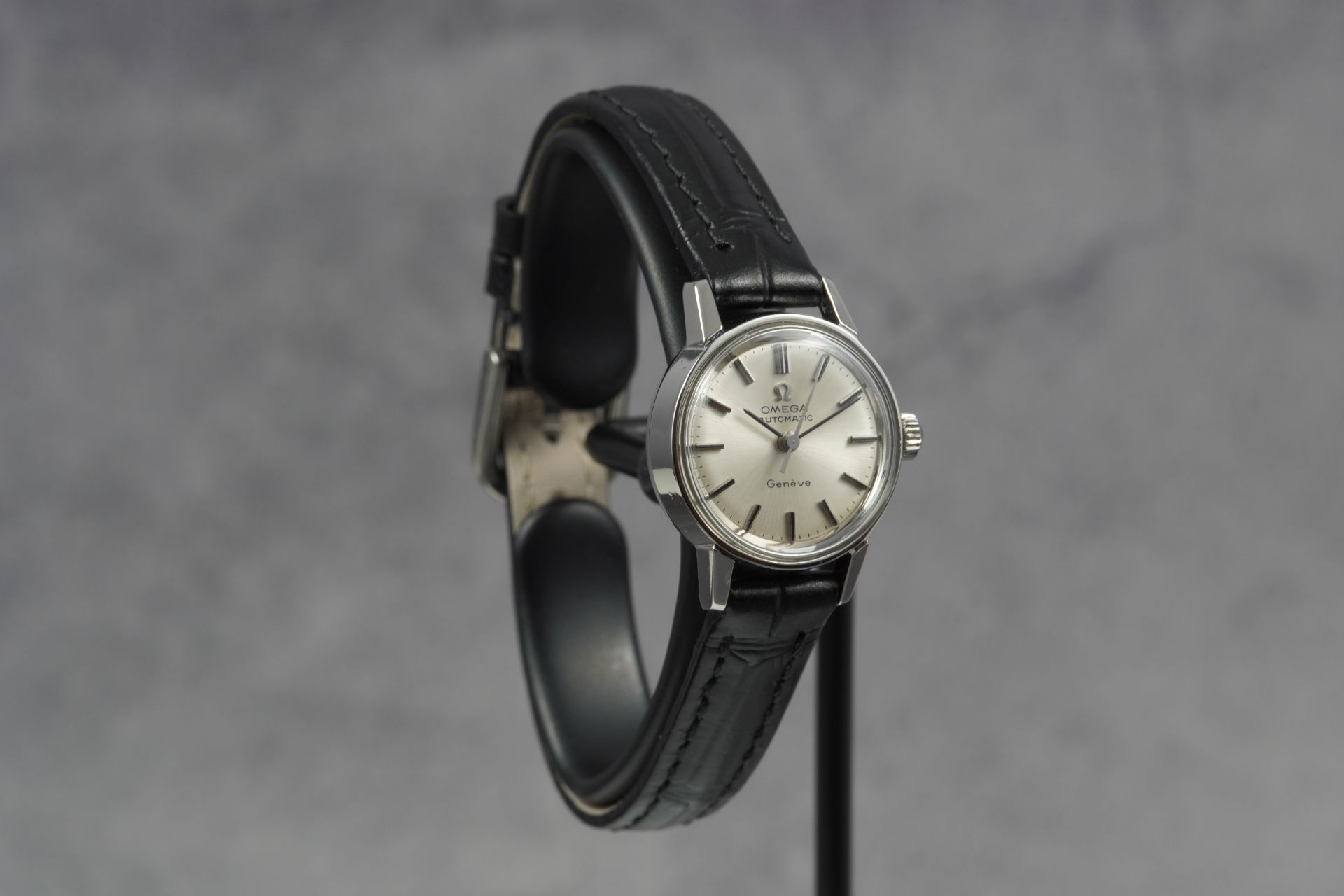 La montre est présentée avec un bracelet en cuir noir et une boucle ardillon, ces deux éléments étant non-originaux. Cette Omega Genève, référence commerciale 565.002, vous est proposée en montre seule. Elle bénéficie d’une garantie de 12 mois.