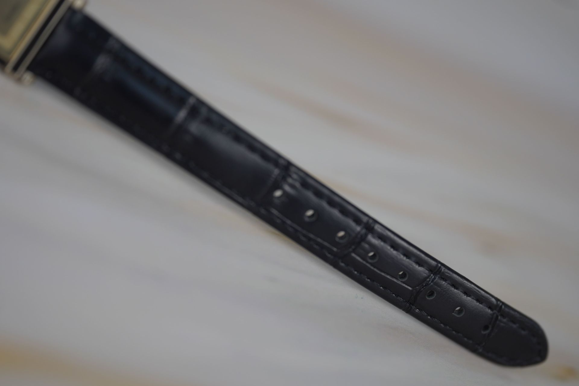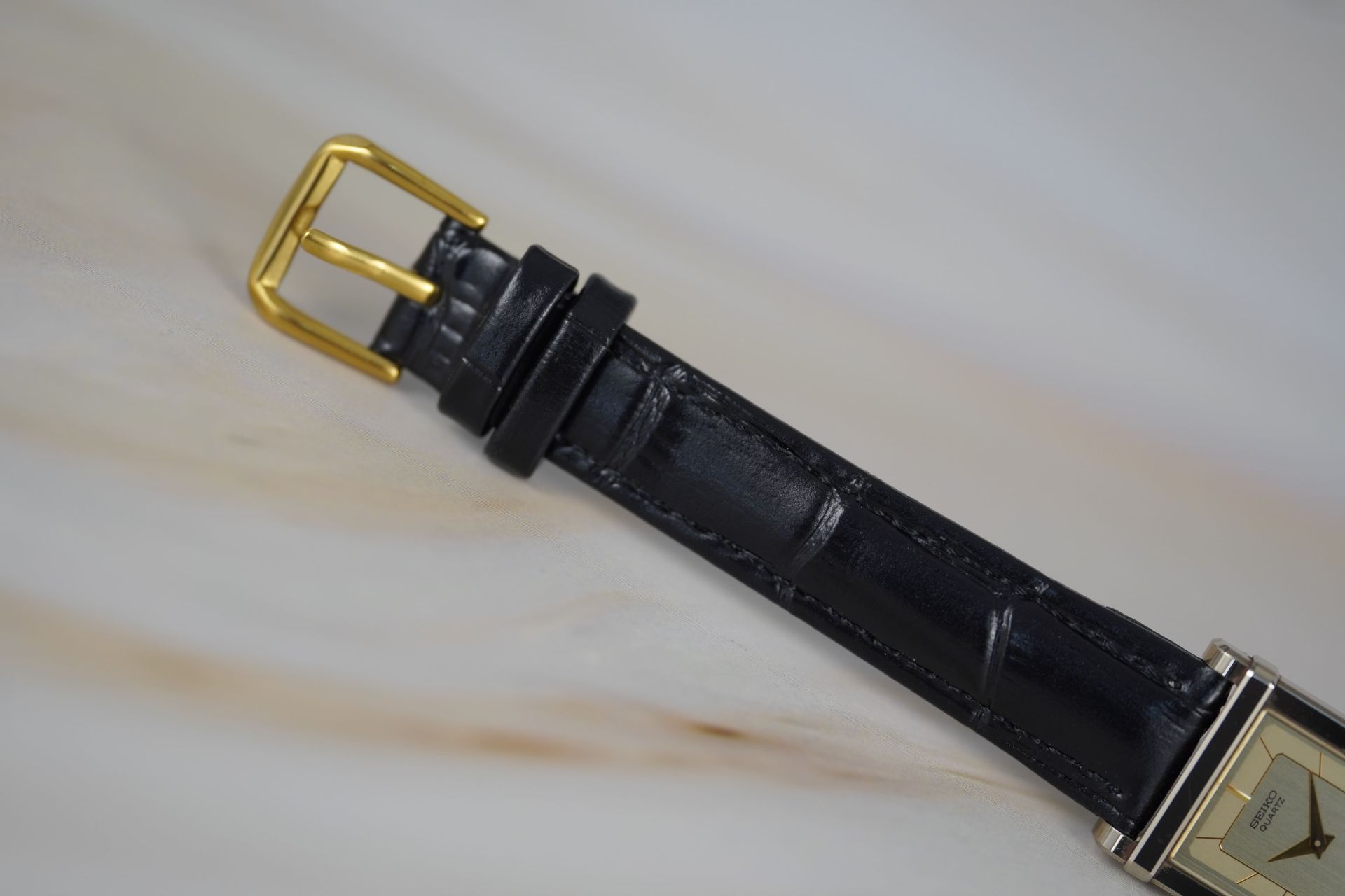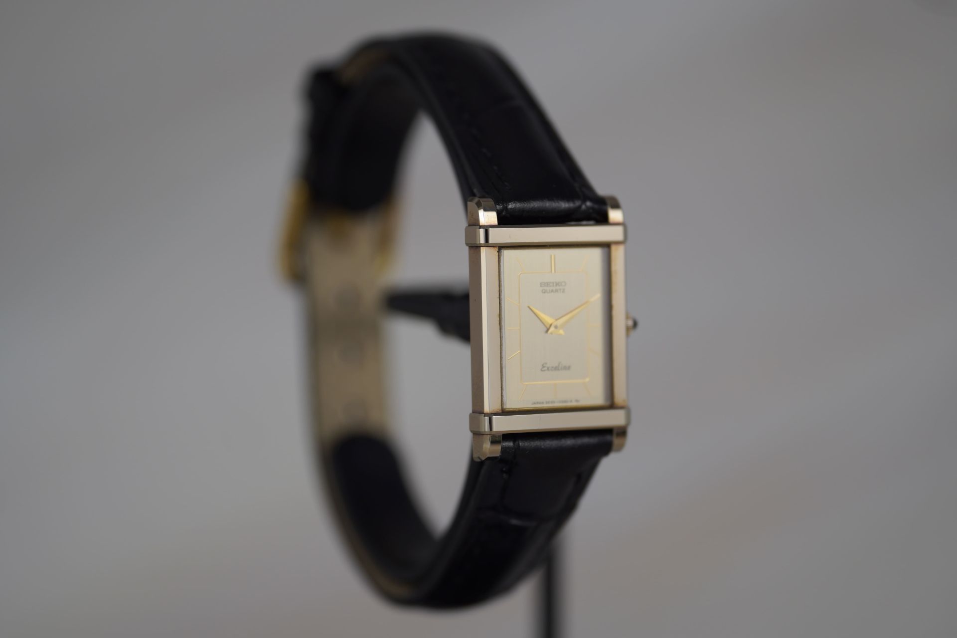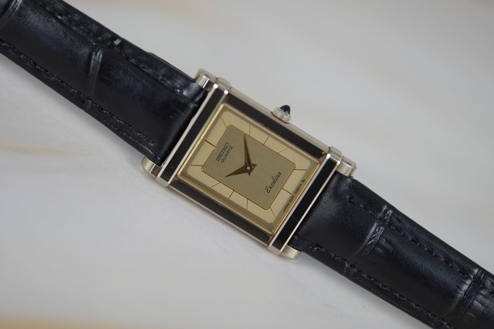 Élégance intemporelle pour cette Seiko Exceline « Tank » de 1985, référence commerciale 2E20-5190, une pièce délicate conçue pour la femme. Son boîtier rectangulaire en tungstène de 18.2mm de diamètre et 5.2mm d’épaisseur abrite un mouvement à quartz précis. Le cadran, discret et raffiné, s’harmonise parfaitement avec ce design emblématique. Un bracelet en cuir noir non original, accompagné d’une boucle ardillon non originale, vient parfaire cet ensemble. Cette montre, sous son apparence classique, révèle une robustesse inattendue grâce à son boîtier en tungstène. Elle est livrée en bon état et bénéficie d’une garantie de 12 mois.