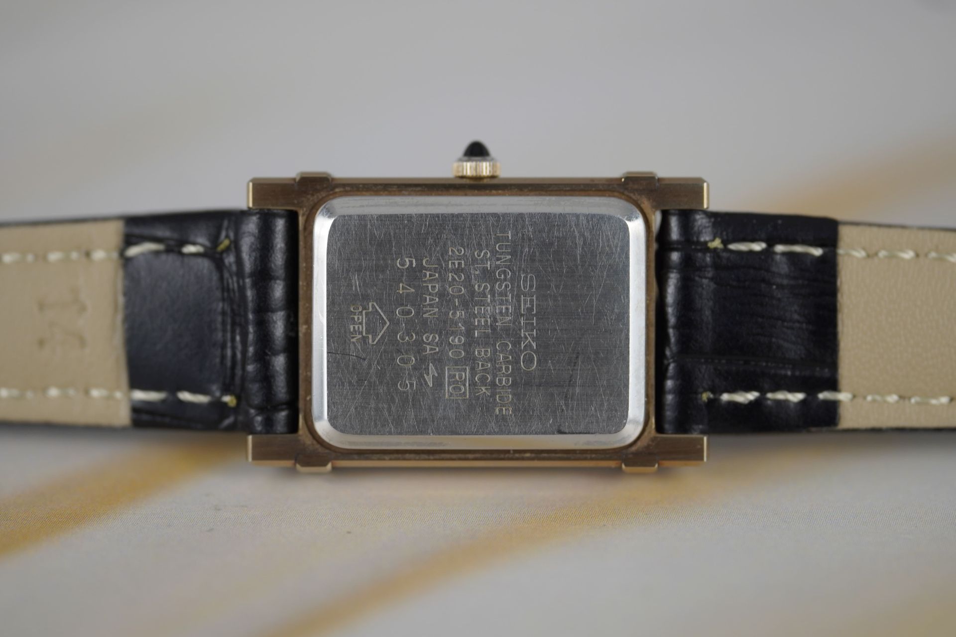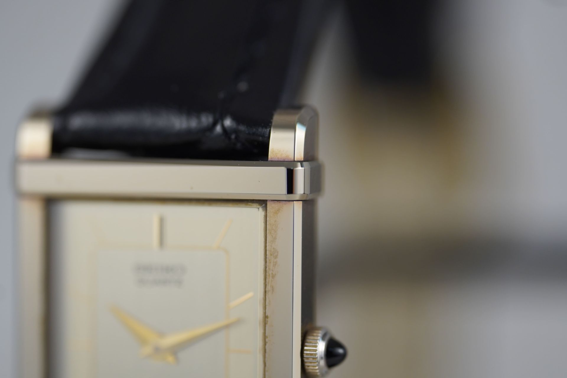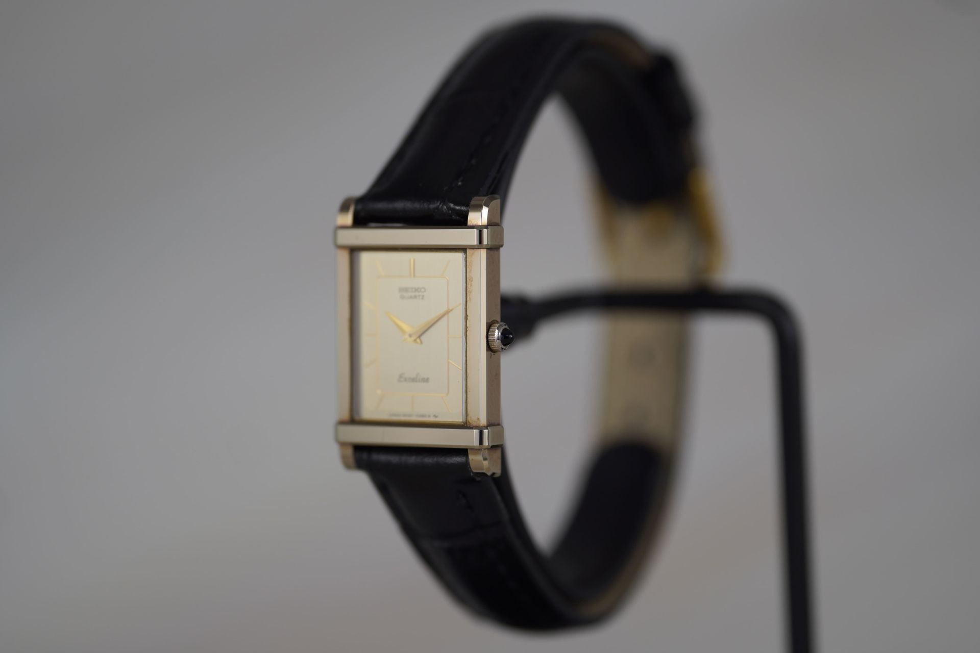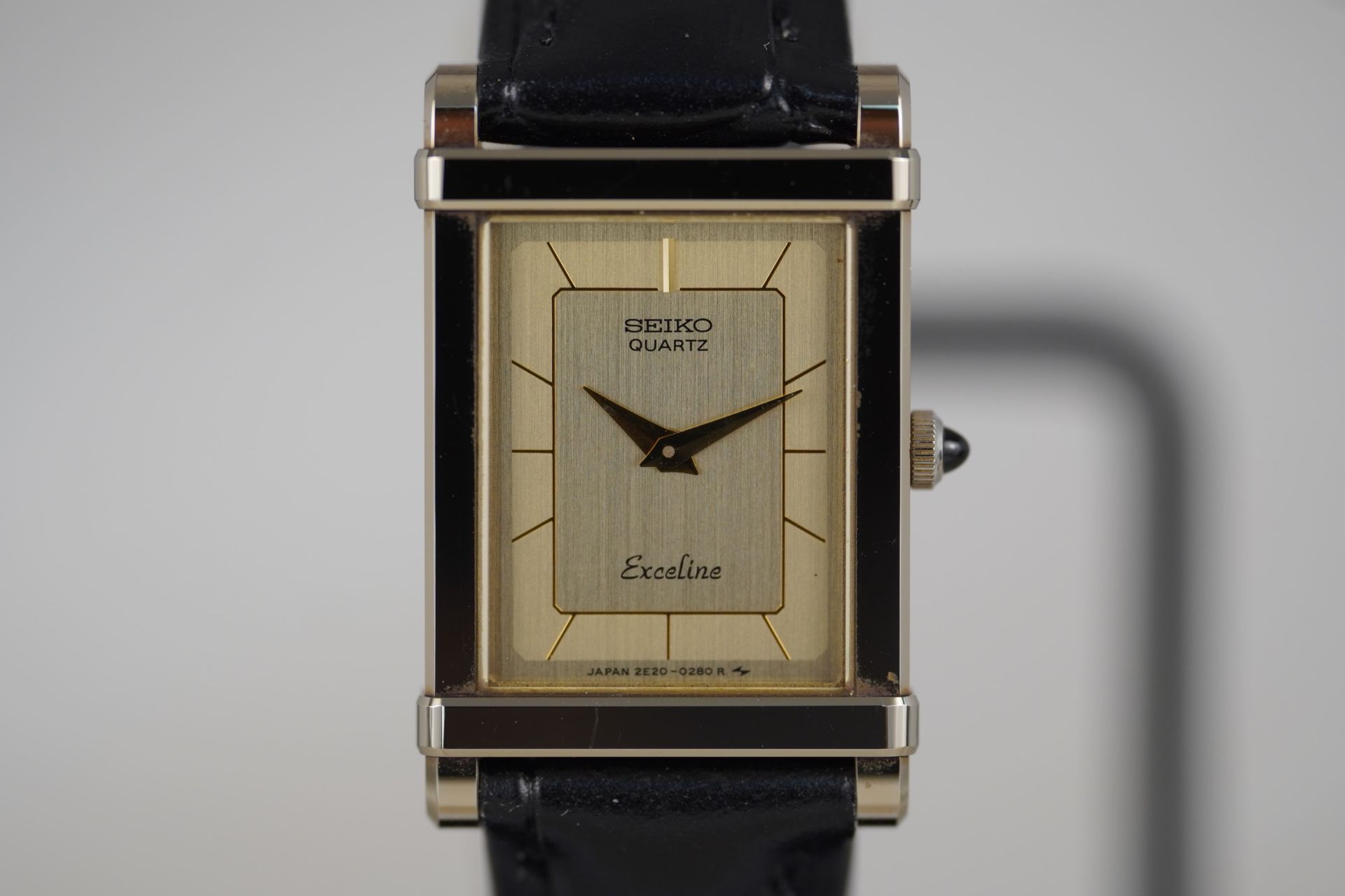 Élégance intemporelle pour cette Seiko Exceline « Tank » de 1985, référence commerciale 2E20-5190, une pièce délicate conçue pour la femme. Son boîtier rectangulaire en tungstène de 18.2mm de diamètre et 5.2mm d’épaisseur abrite un mouvement à quartz précis. Le cadran, discret et raffiné, s’harmonise parfaitement avec ce design emblématique. Un bracelet en cuir noir non original, accompagné d’une boucle ardillon non originale, vient parfaire cet ensemble. Cette montre, sous son apparence classique, révèle une robustesse inattendue grâce à son boîtier en tungstène. Elle est livrée en bon état et bénéficie d’une garantie de 12 mois.