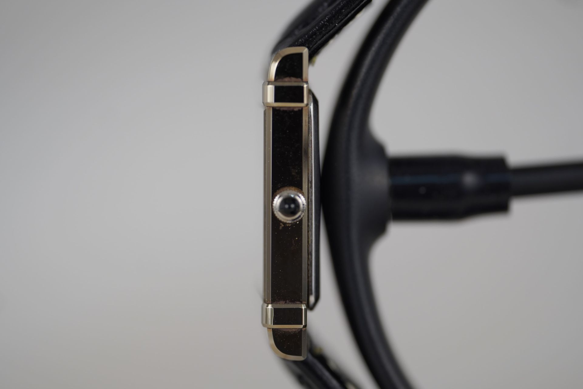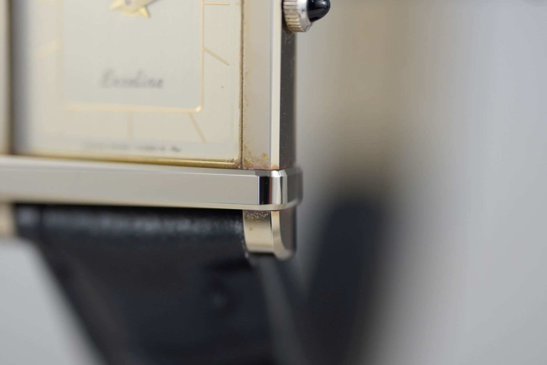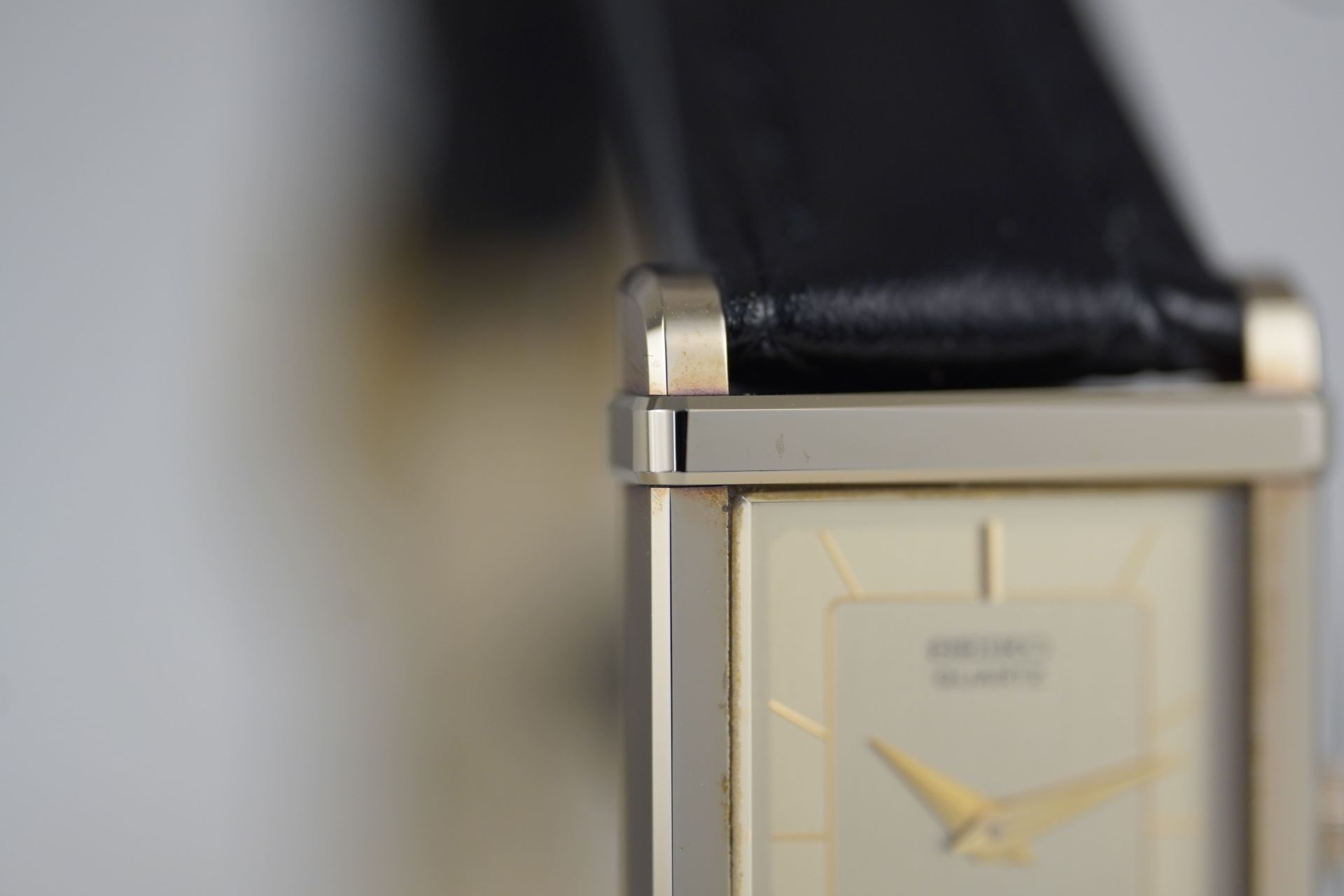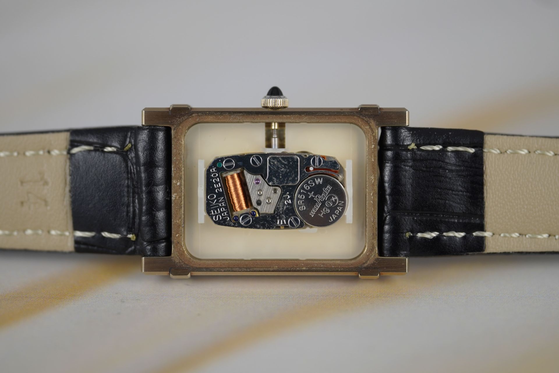 Élégance intemporelle pour cette Seiko Exceline « Tank » de 1985, référence commerciale 2E20-5190, une pièce délicate conçue pour la femme. Son boîtier rectangulaire en tungstène de 18.2mm de diamètre et 5.2mm d’épaisseur abrite un mouvement à quartz précis. Le cadran, discret et raffiné, s’harmonise parfaitement avec ce design emblématique. Un bracelet en cuir noir non original, accompagné d’une boucle ardillon non originale, vient parfaire cet ensemble. Cette montre, sous son apparence classique, révèle une robustesse inattendue grâce à son boîtier en tungstène. Elle est livrée en bon état et bénéficie d’une garantie de 12 mois.