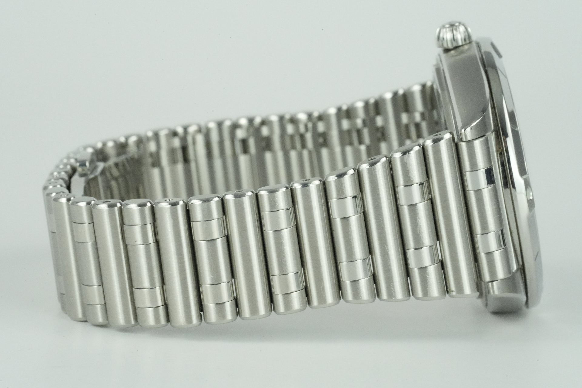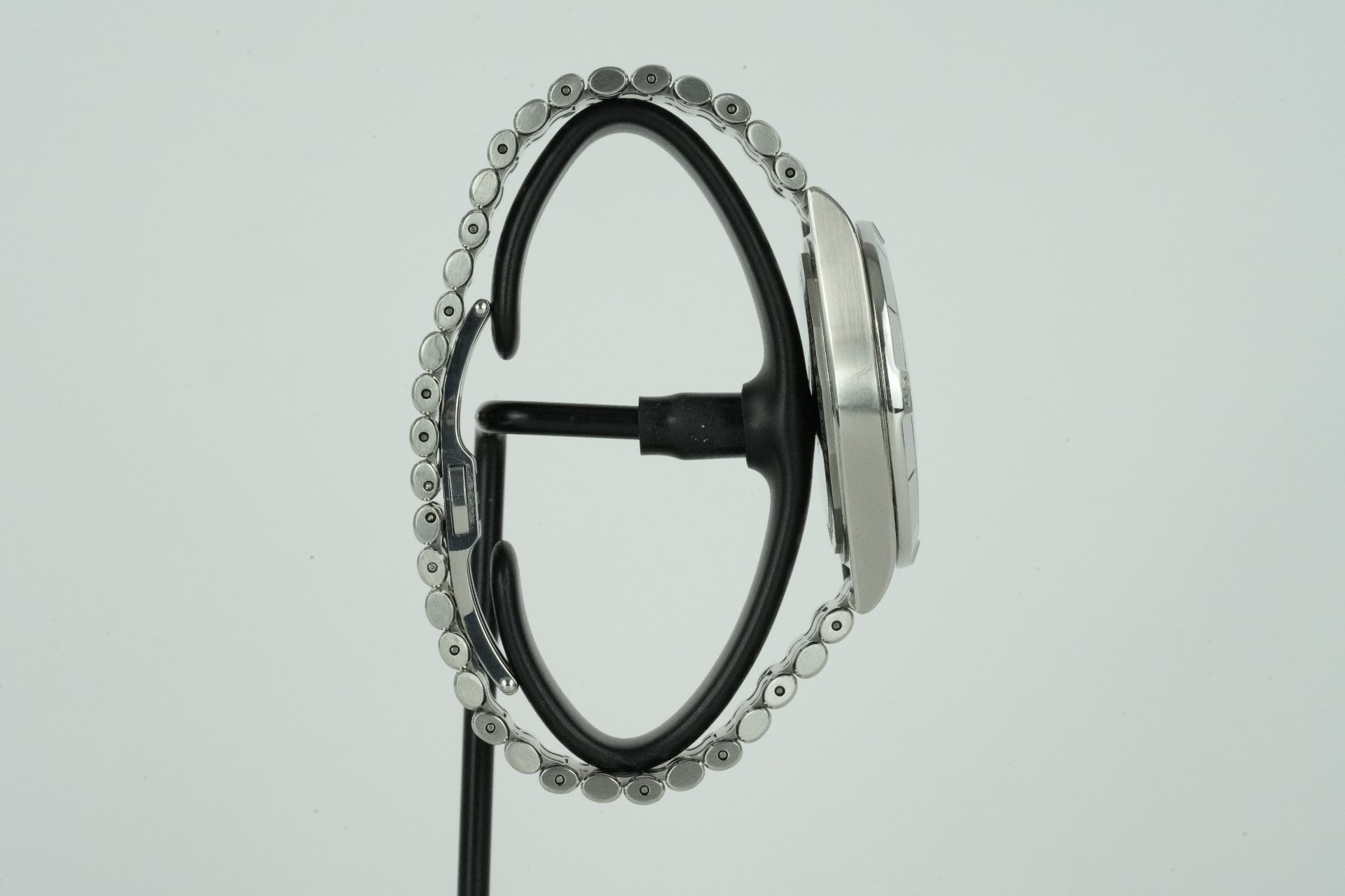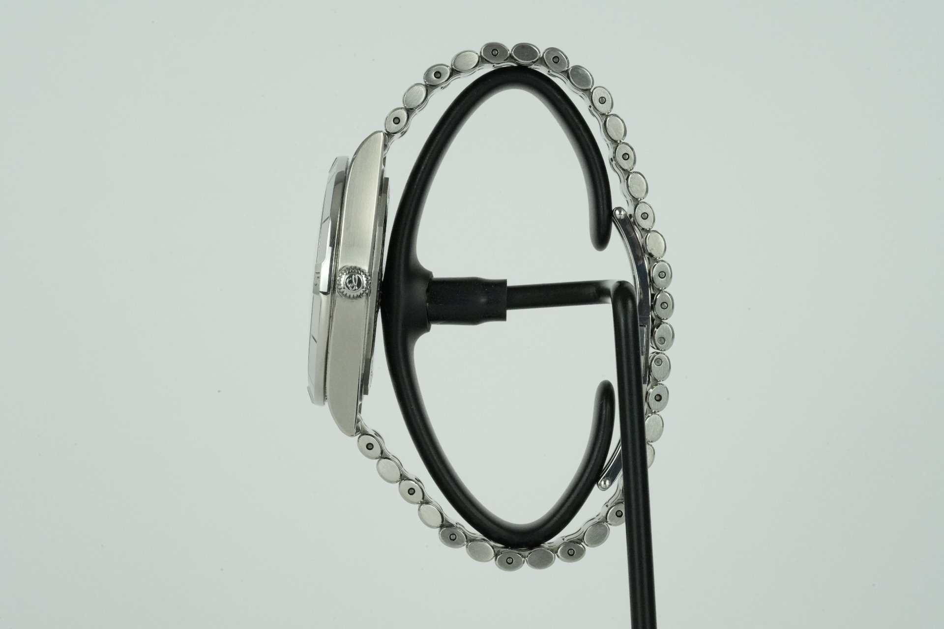 Animée par un mouvement à remontage automatique, elle réside dans un boîtier en acier de 36 mm de diamètre et 9.9 mm d’épaisseur, parfaitement proportionné. Son bracelet en acier, d’origine et de couleur acier assortie, est sécurisé par une boucle déployante double plis également d’origine, garantissant un confort et une sécurité optimaux.