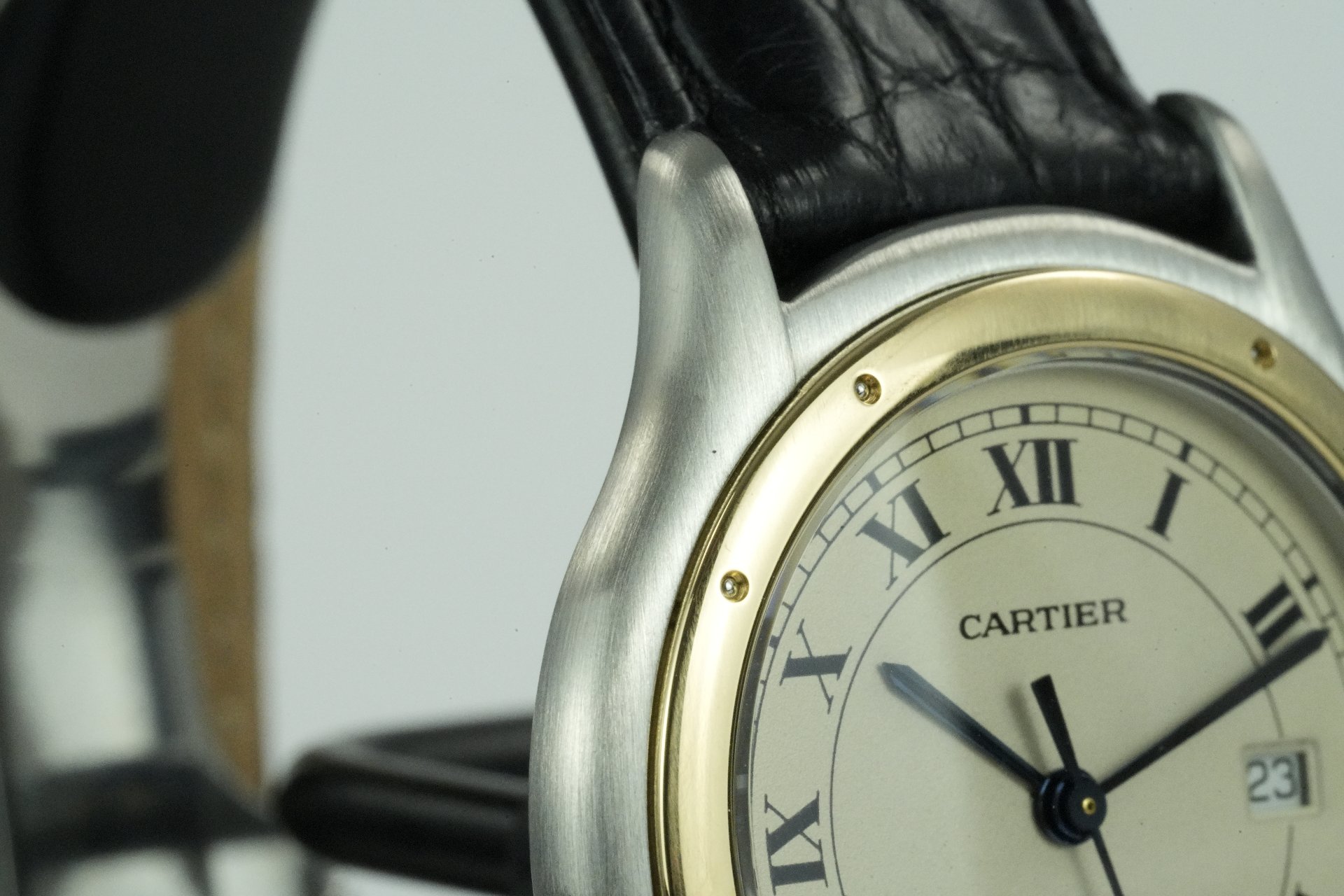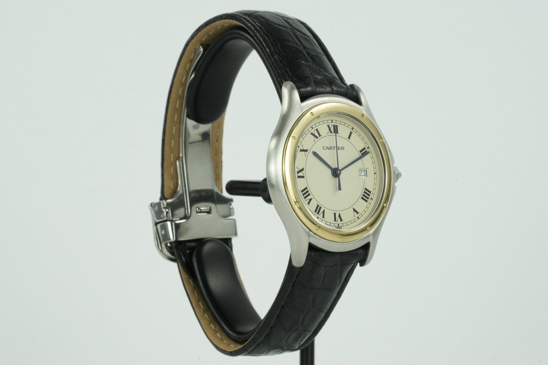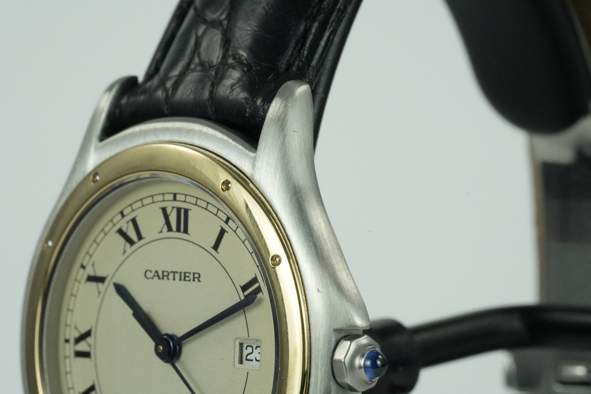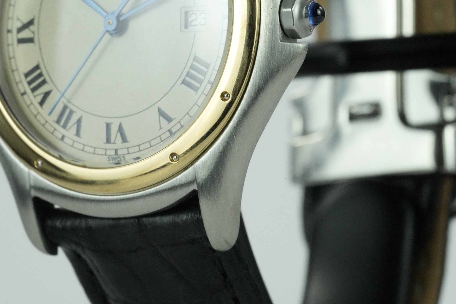 Découvrez l’élégance audacieuse de la Cartier Cougar Panthère, référence TOT-01804. Ce modèle unisexe, référence commerciale 187904, incarne le raffinement intemporel de la maison Cartier. Son boîtier distinctif, combinant l’or et l’acier avec un diamètre de 32 mm et une épaisseur de 6.7 mm, offre une présence subtile et sophistiquée. Animée par un mouvement à Quartz précis, cette montre est présentée dans un très bon état général. Le bracelet en cuir noir, bien que non original, complète harmonieusement l’esthétique, tandis que sa boucle à plis d’origine assure une touche d’authenticité. La montre seule sera livrée, accompagnée d’une garantie de 12 mois.