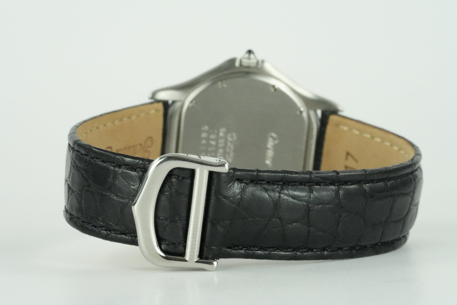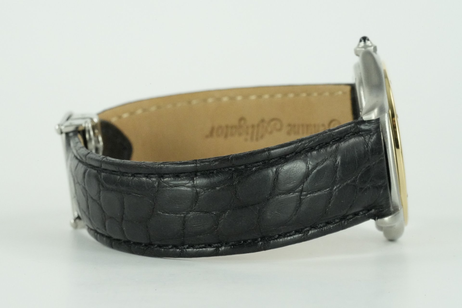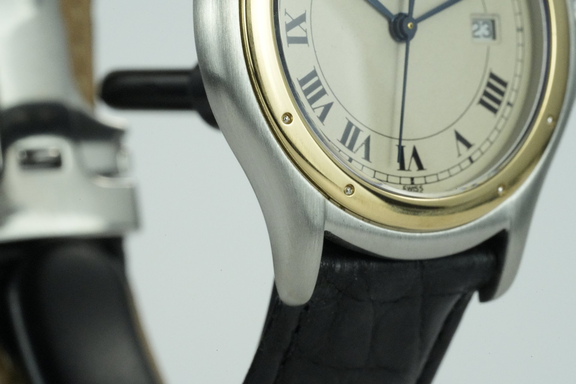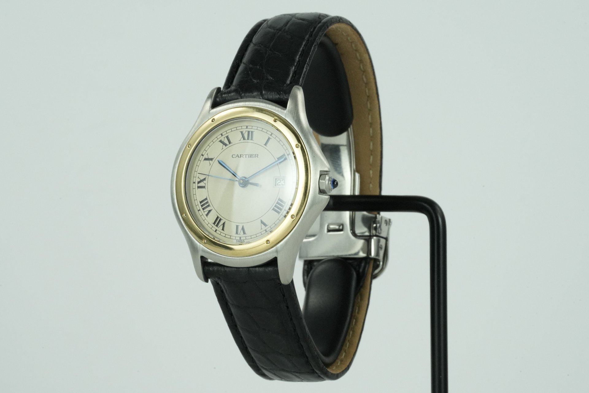 Découvrez l’élégance audacieuse de la Cartier Cougar Panthère, référence TOT-01804. Ce modèle unisexe, référence commerciale 187904, incarne le raffinement intemporel de la maison Cartier. Son boîtier distinctif, combinant l’or et l’acier avec un diamètre de 32 mm et une épaisseur de 6.7 mm, offre une présence subtile et sophistiquée. Animée par un mouvement à Quartz précis, cette montre est présentée dans un très bon état général. Le bracelet en cuir noir, bien que non original, complète harmonieusement l’esthétique, tandis que sa boucle à plis d’origine assure une touche d’authenticité. La montre seule sera livrée, accompagnée d’une garantie de 12 mois.