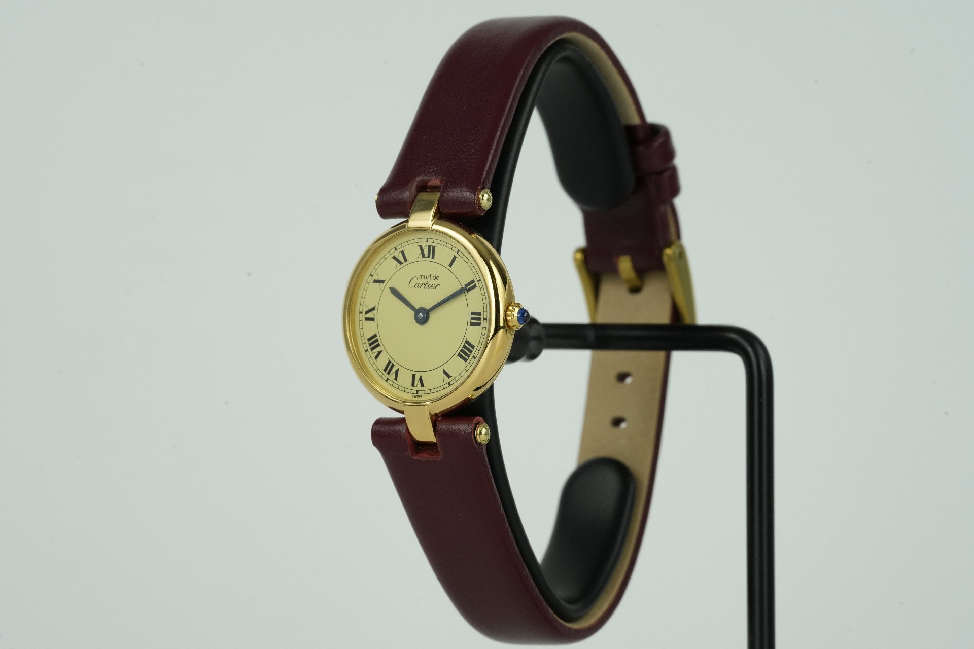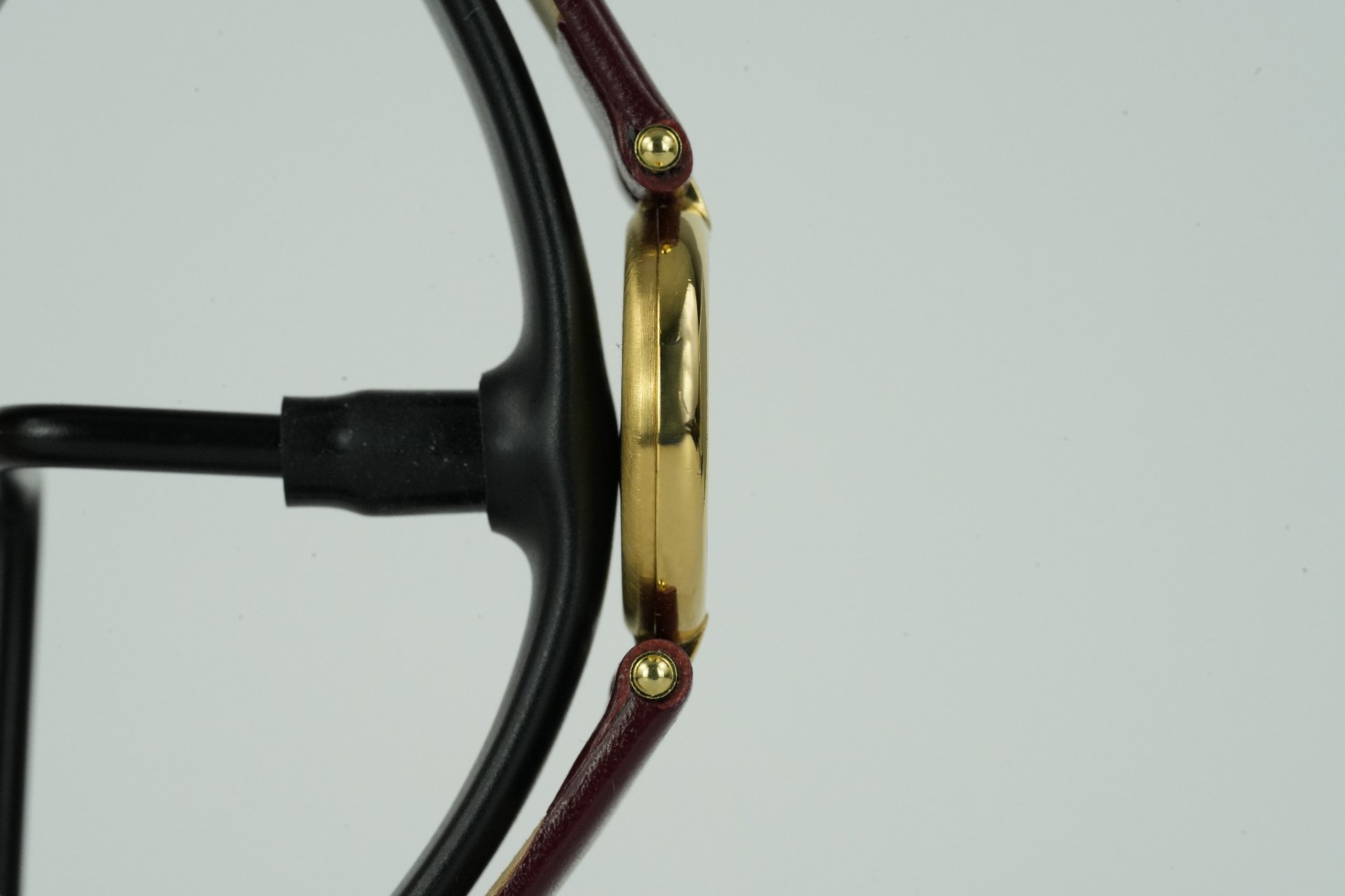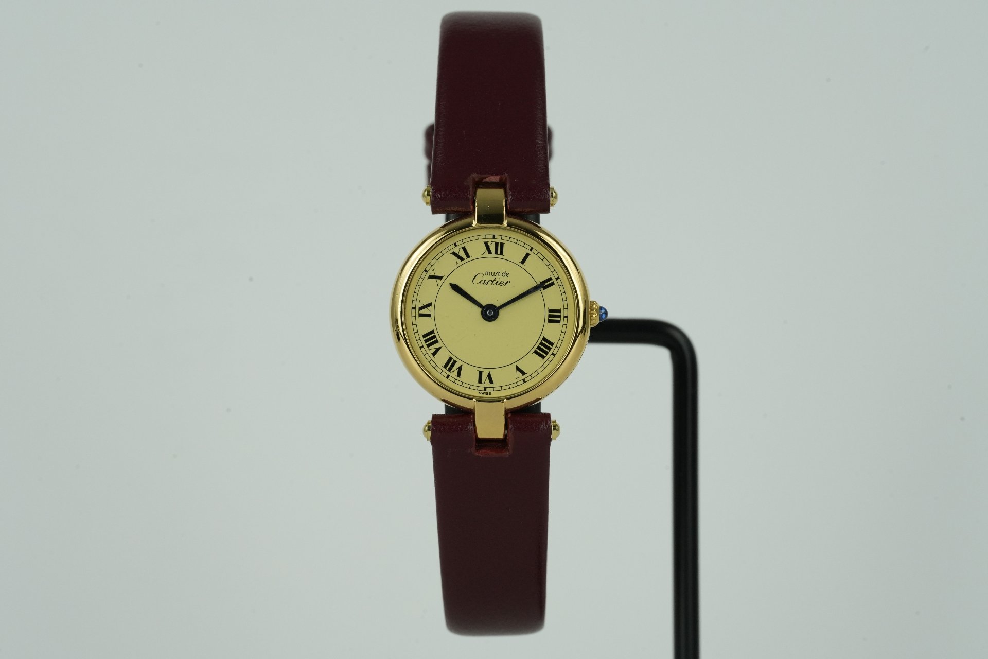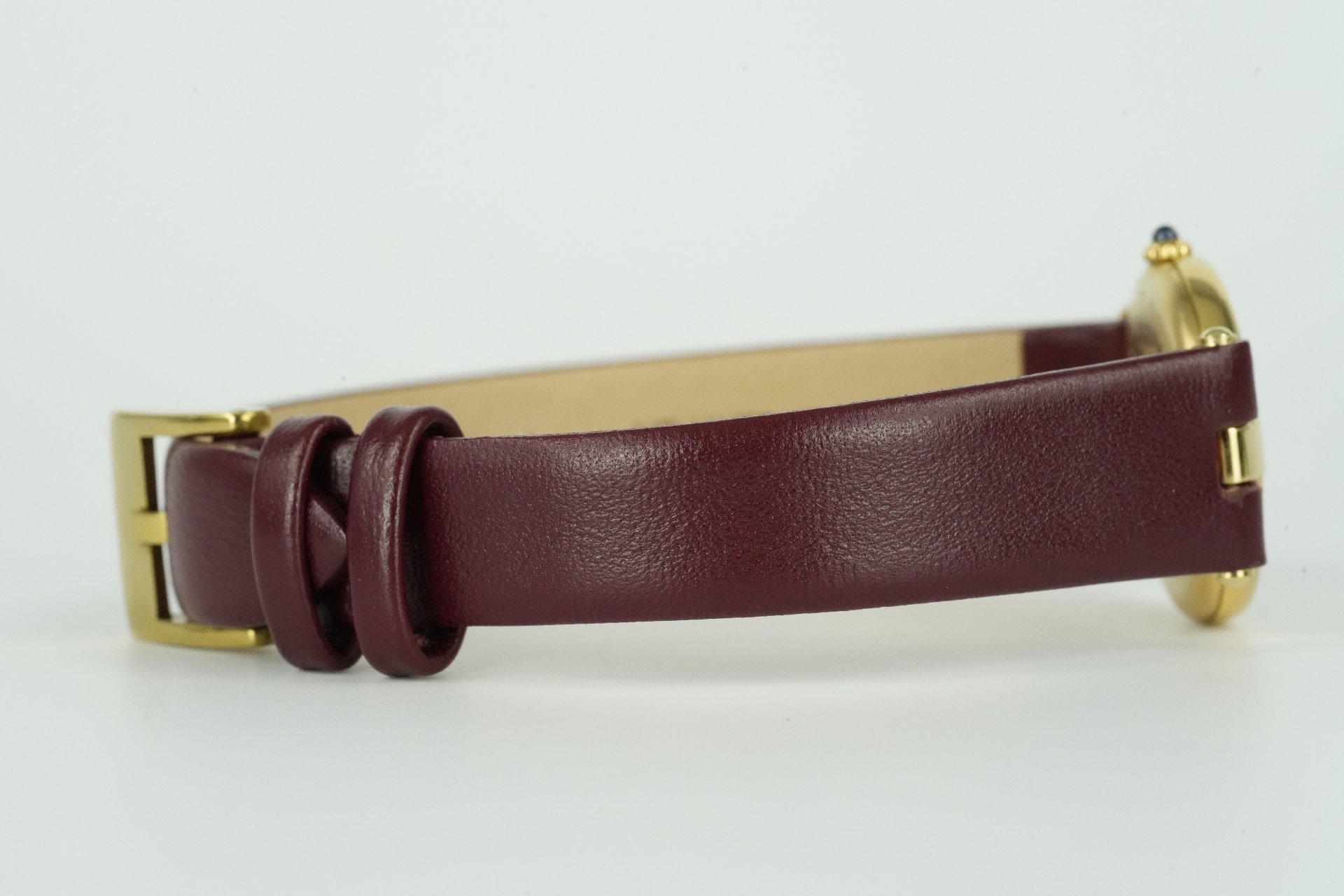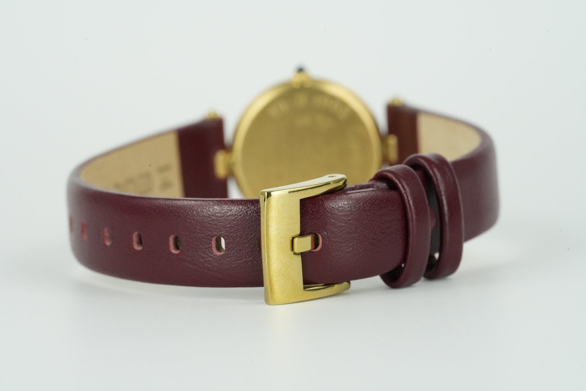 Sublimez votre poignet avec la Cartier Must De Vendôme, référence 18, une icône d’élégance intemporelle. Cette montre féminine est animée par un mouvement à Quartz, garantissant précision et fiabilité. Son boîtier rond en argent 925 plaqué or (« vermeil ») de 24 mm de diamètre et de seulement 4,7 mm d’épaisseur incarne une finesse remarquable. Admirez son cadran d’une beauté classique et son verre en saphir, signe de luxe et de durabilité. Le bracelet en cuir rouge, bien que non original, offre une touche de caractère, complété par une boucle ardillon non originale. Livrée avec montre seule, cette pièce est en très bon état et bénéficie d’une garantie de 12 mois.