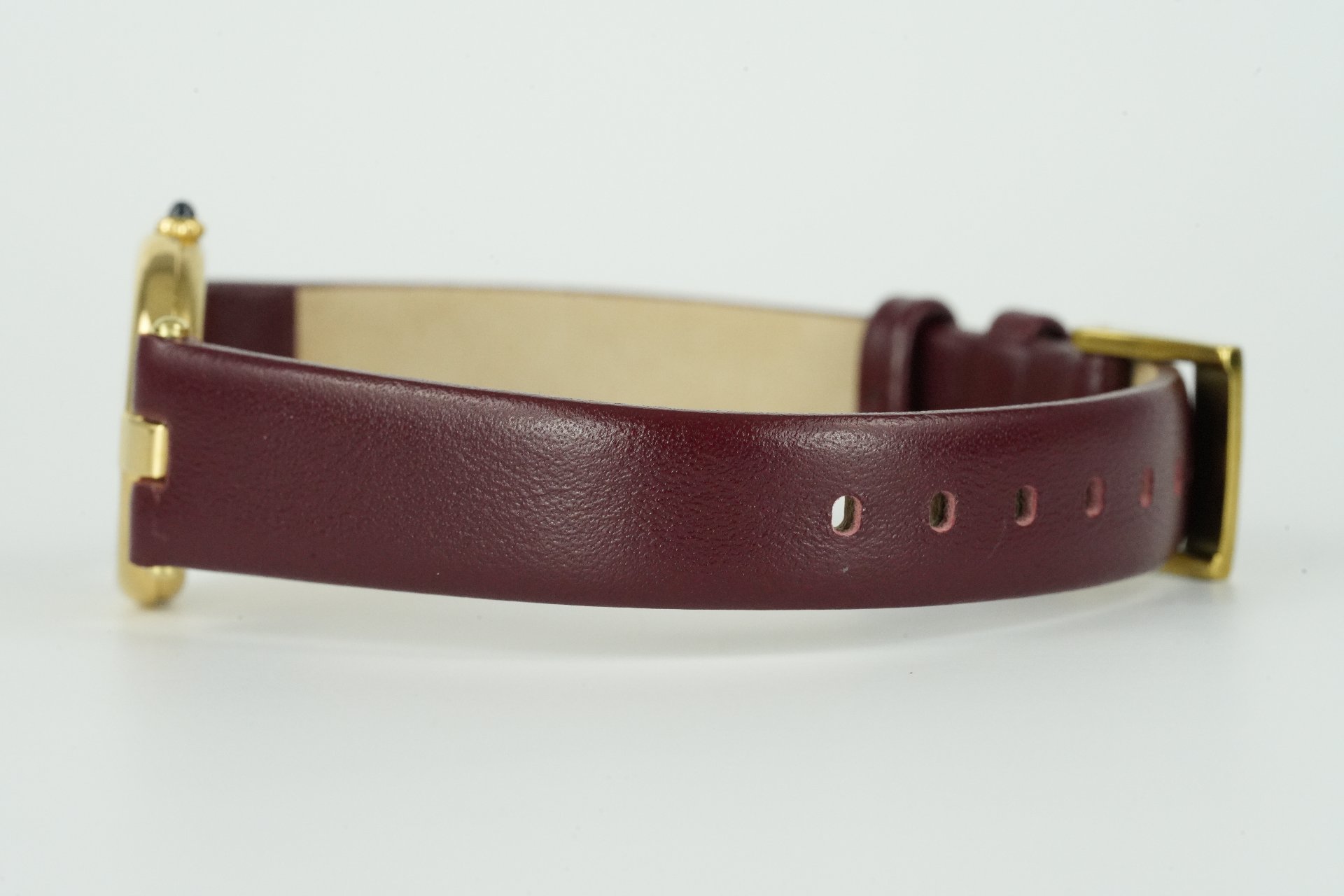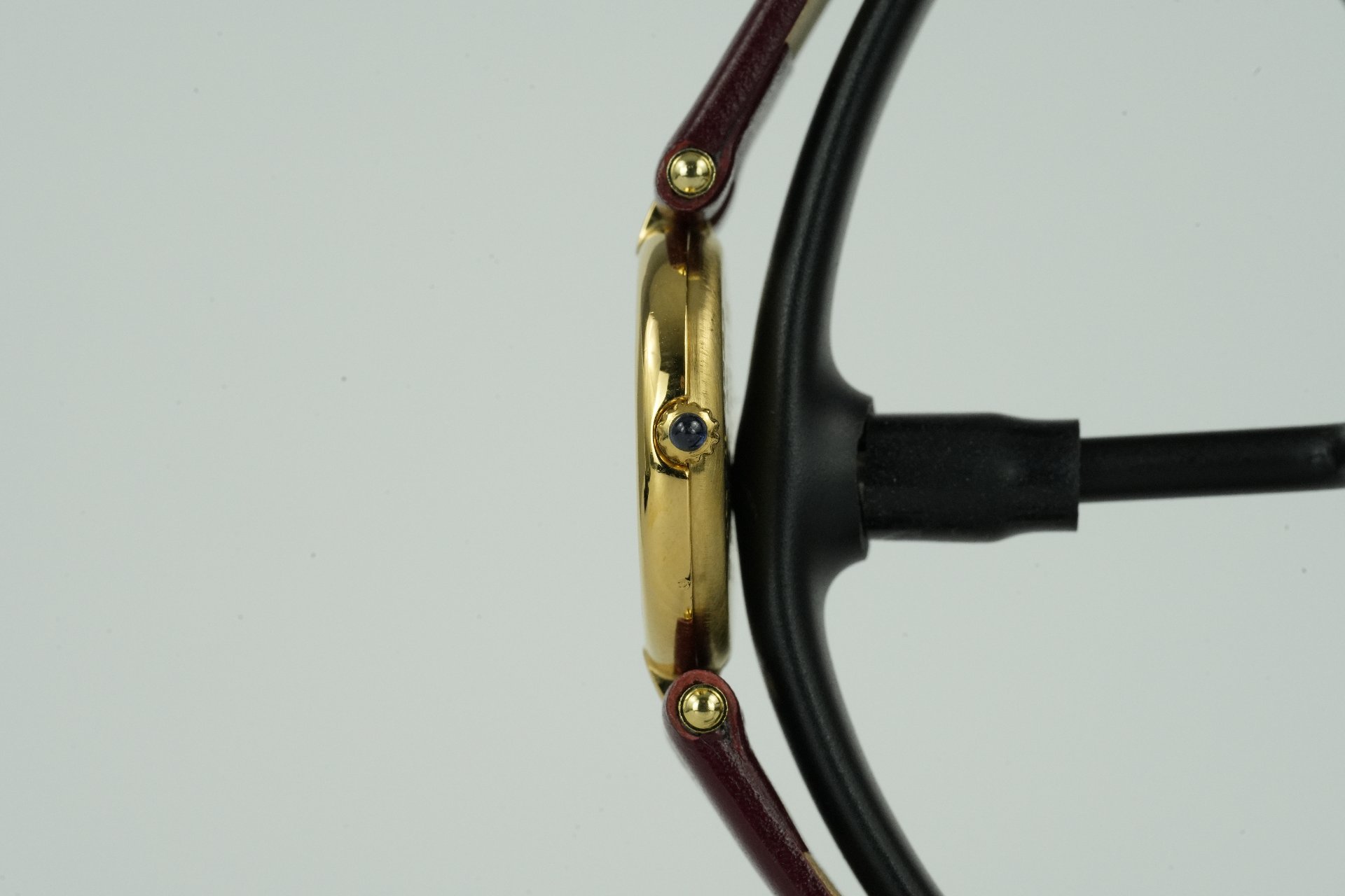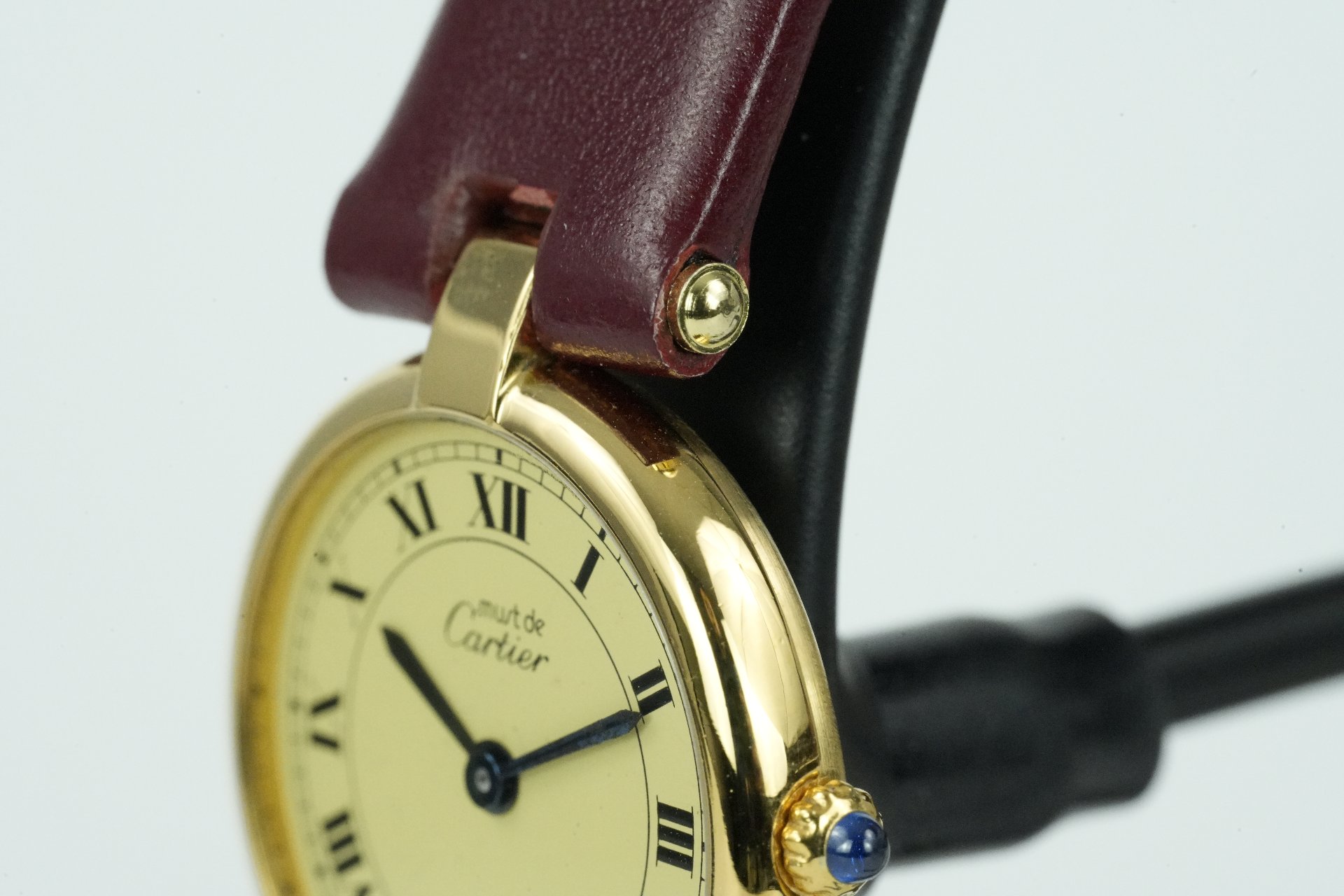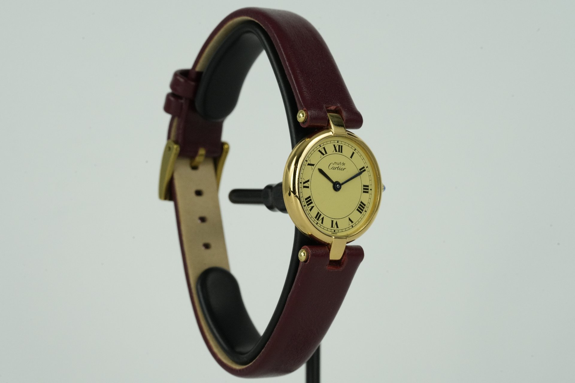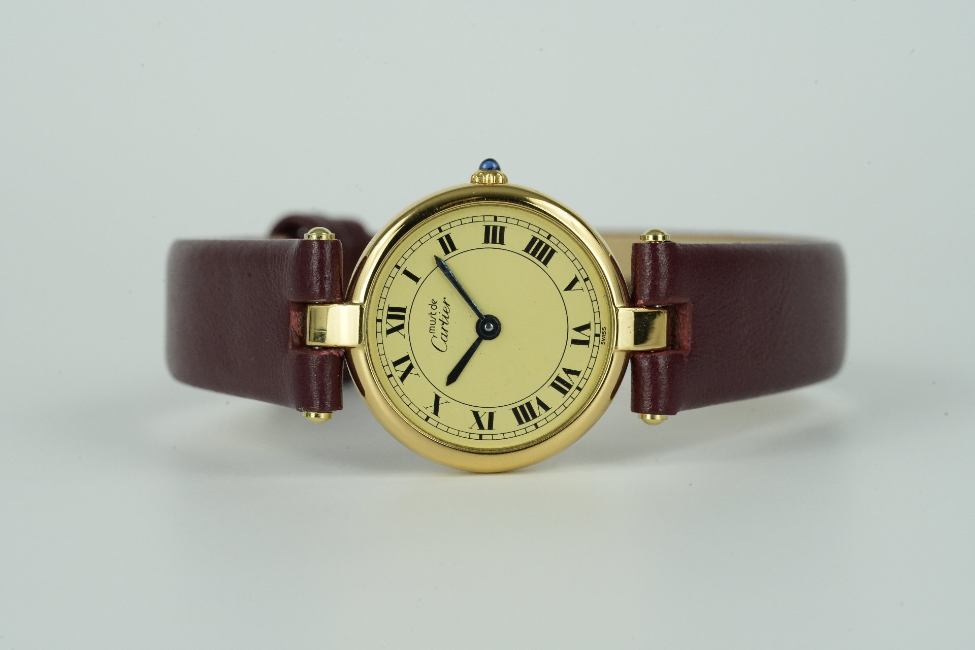Sublimez votre poignet avec la Cartier Must De Vendôme, référence 18, une icône d’élégance intemporelle. Cette montre féminine est animée par un mouvement à Quartz, garantissant précision et fiabilité. Son boîtier rond en argent 925 plaqué or (« vermeil ») de 24 mm de diamètre et de seulement 4,7 mm d’épaisseur incarne une finesse remarquable. Admirez son cadran d’une beauté classique et son verre en saphir, signe de luxe et de durabilité. Le bracelet en cuir rouge, bien que non original, offre une touche de caractère, complété par une boucle ardillon non originale. Livrée avec montre seule, cette pièce est en très bon état et bénéficie d’une garantie de 12 mois.