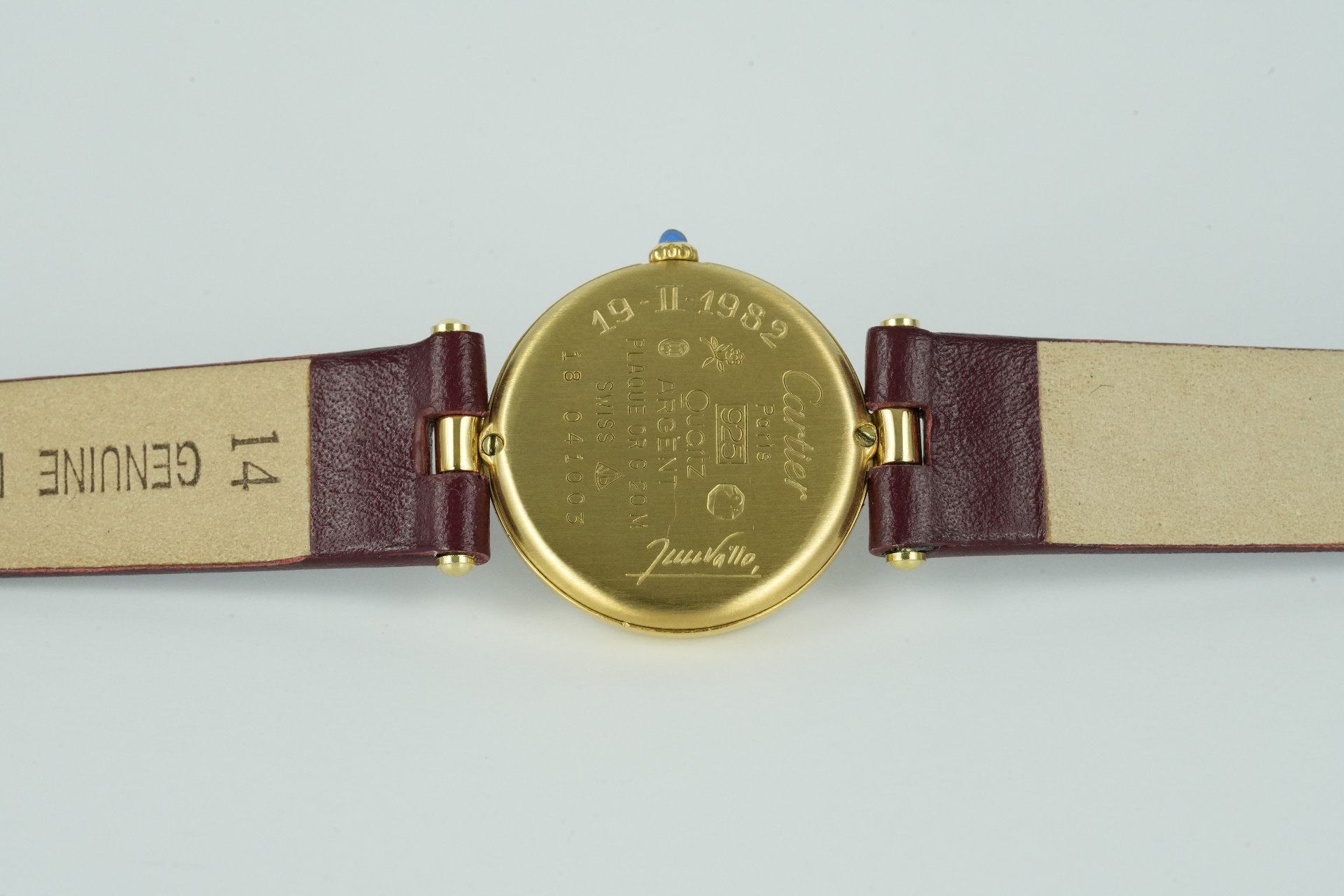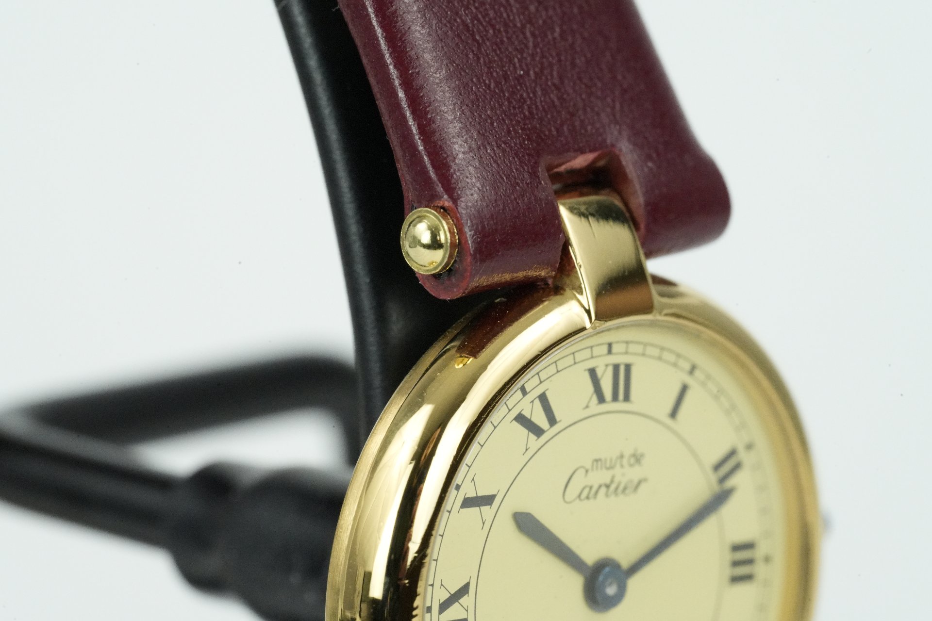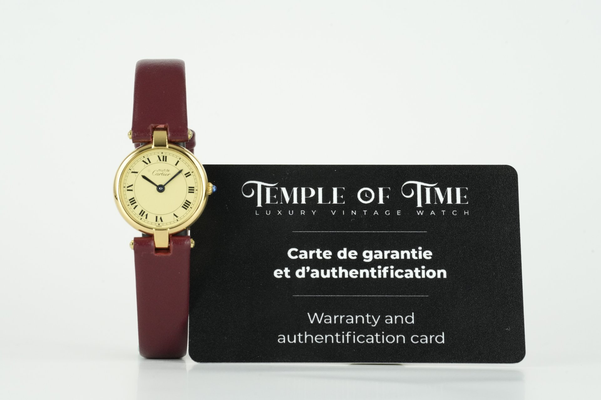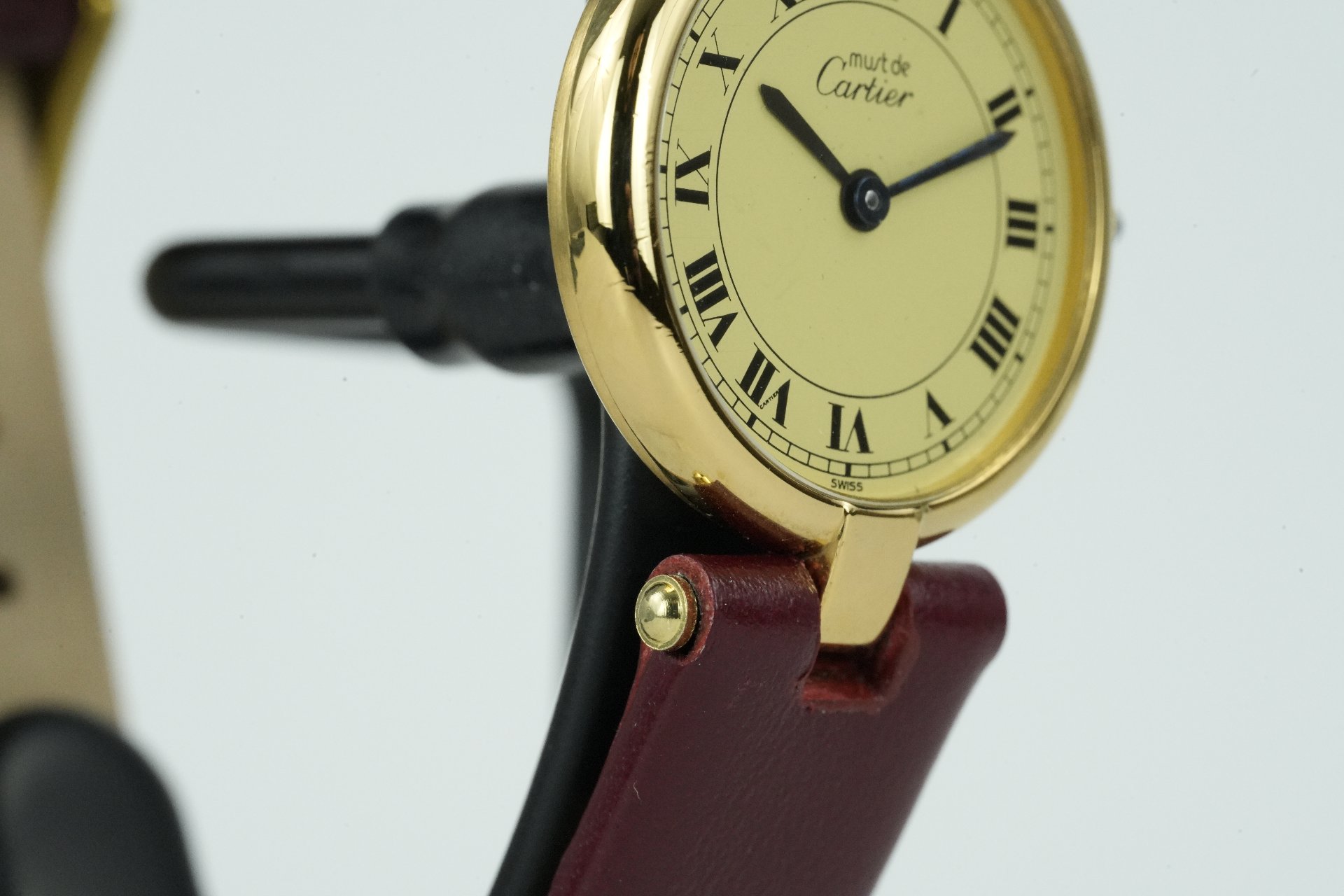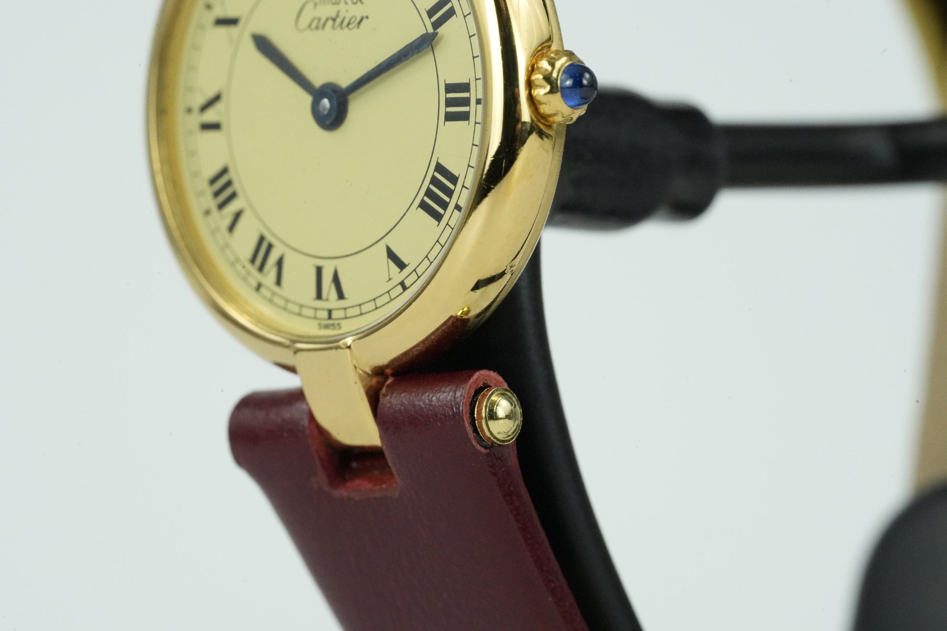 Sublimez votre poignet avec la Cartier Must De Vendôme, référence 18, une icône d’élégance intemporelle. Cette montre féminine est animée par un mouvement à Quartz, garantissant précision et fiabilité. Son boîtier rond en argent 925 plaqué or (« vermeil ») de 24 mm de diamètre et de seulement 4,7 mm d’épaisseur incarne une finesse remarquable. Admirez son cadran d’une beauté classique et son verre en saphir, signe de luxe et de durabilité. Le bracelet en cuir rouge, bien que non original, offre une touche de caractère, complété par une boucle ardillon non originale. Livrée avec montre seule, cette pièce est en très bon état et bénéficie d’une garantie de 12 mois.