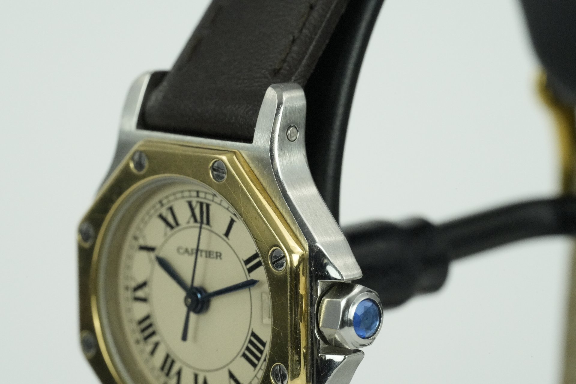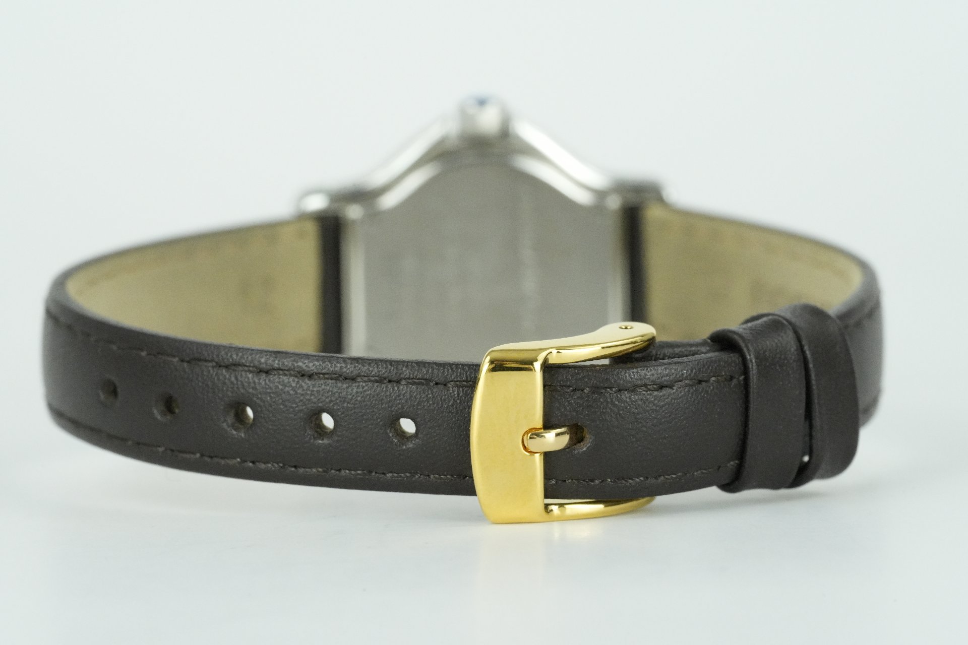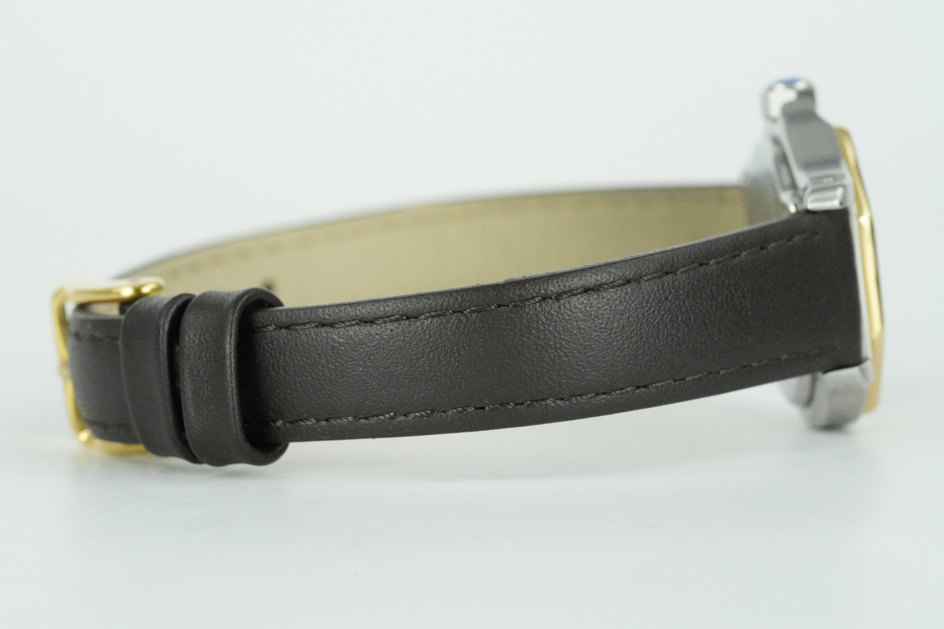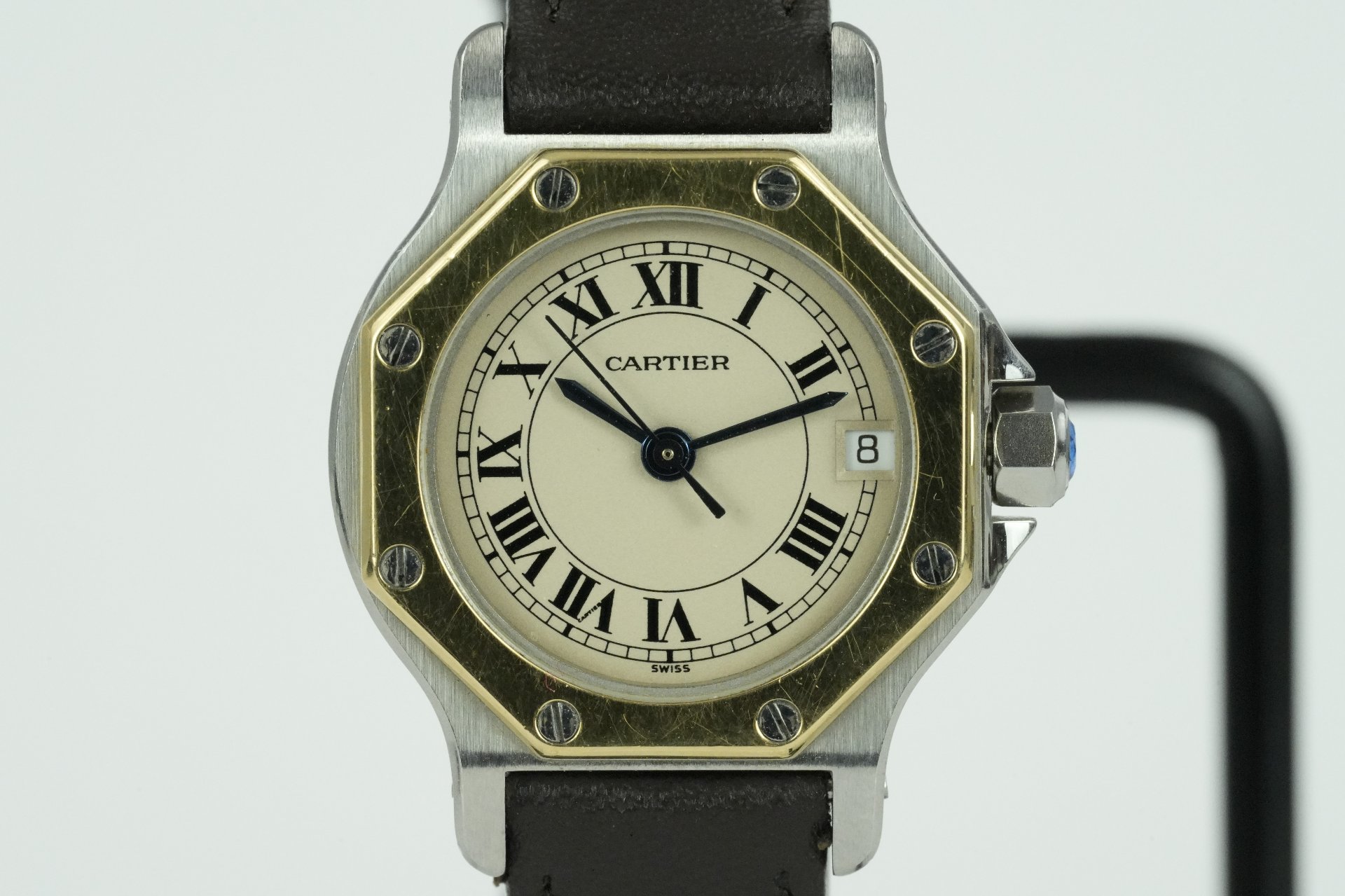 Découvrez la Cartier Santos Octogonale, référence commerciale 187903, une montre qui allie avec raffinement l’élégance classique et une esthétique distinctive. Conçue pour la femme exigeante, cette pièce iconique présente un boîtier octogonal de 25mm en or et acier, avec une fine épaisseur de 6.5mm, soulignant son profil délicat. Animée par un mouvement Quartz, elle assure une précision remarquable au quotidien. Le bracelet en cuir brun non-original, agrémenté d’une boucle ardillon non-originale, confère à cette montre un charme intemporel. Livrée seule, cette Cartier Santos Octogonale est proposée en bon état et bénéficie d’une garantie de 12 mois.