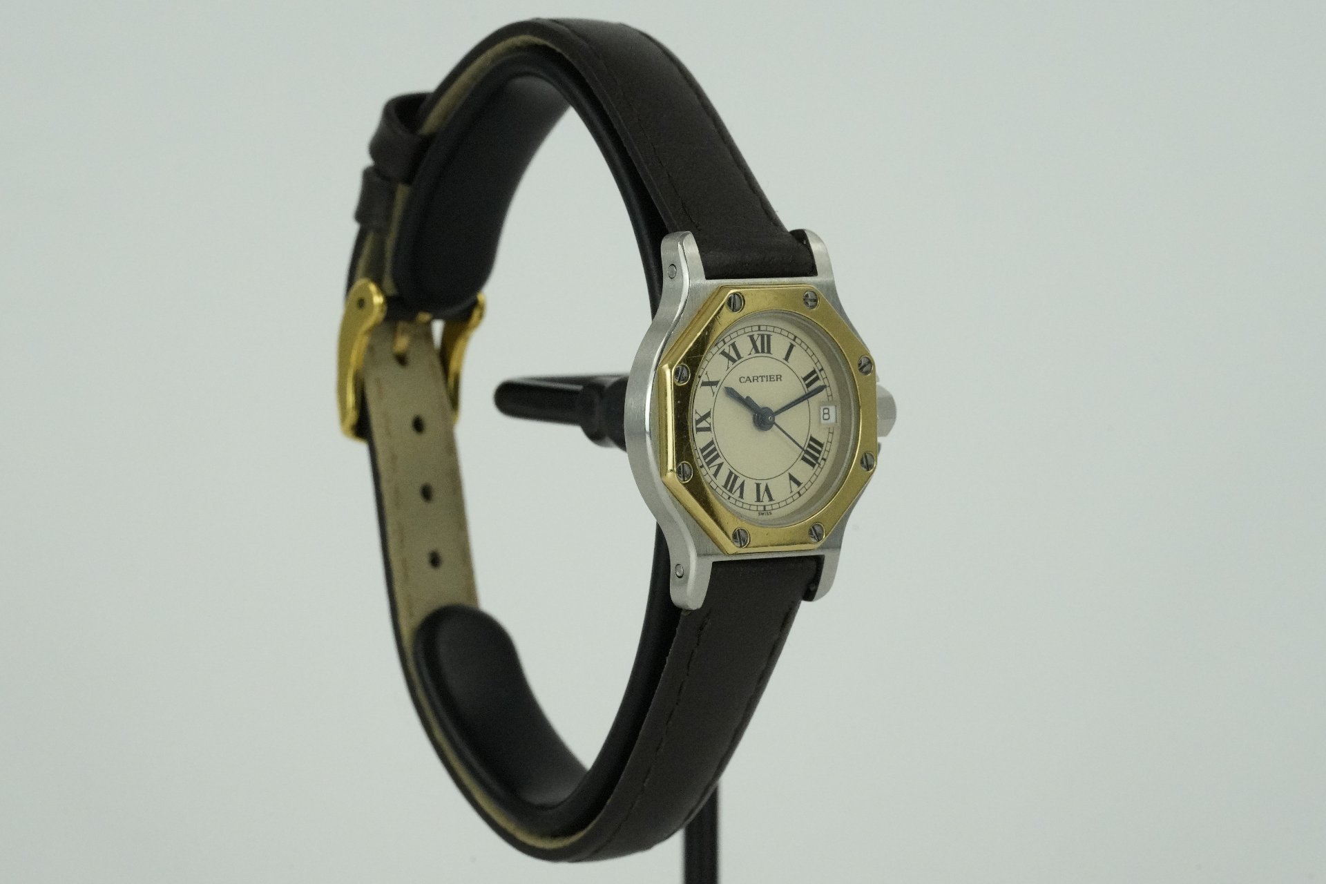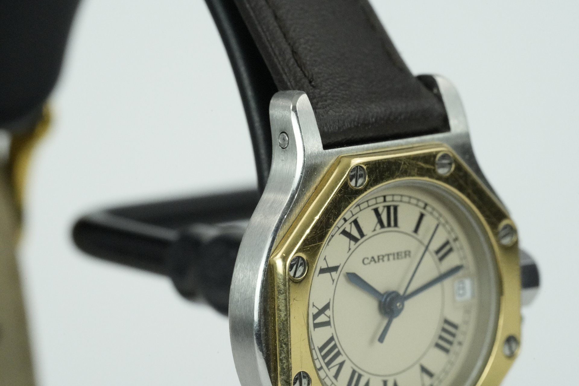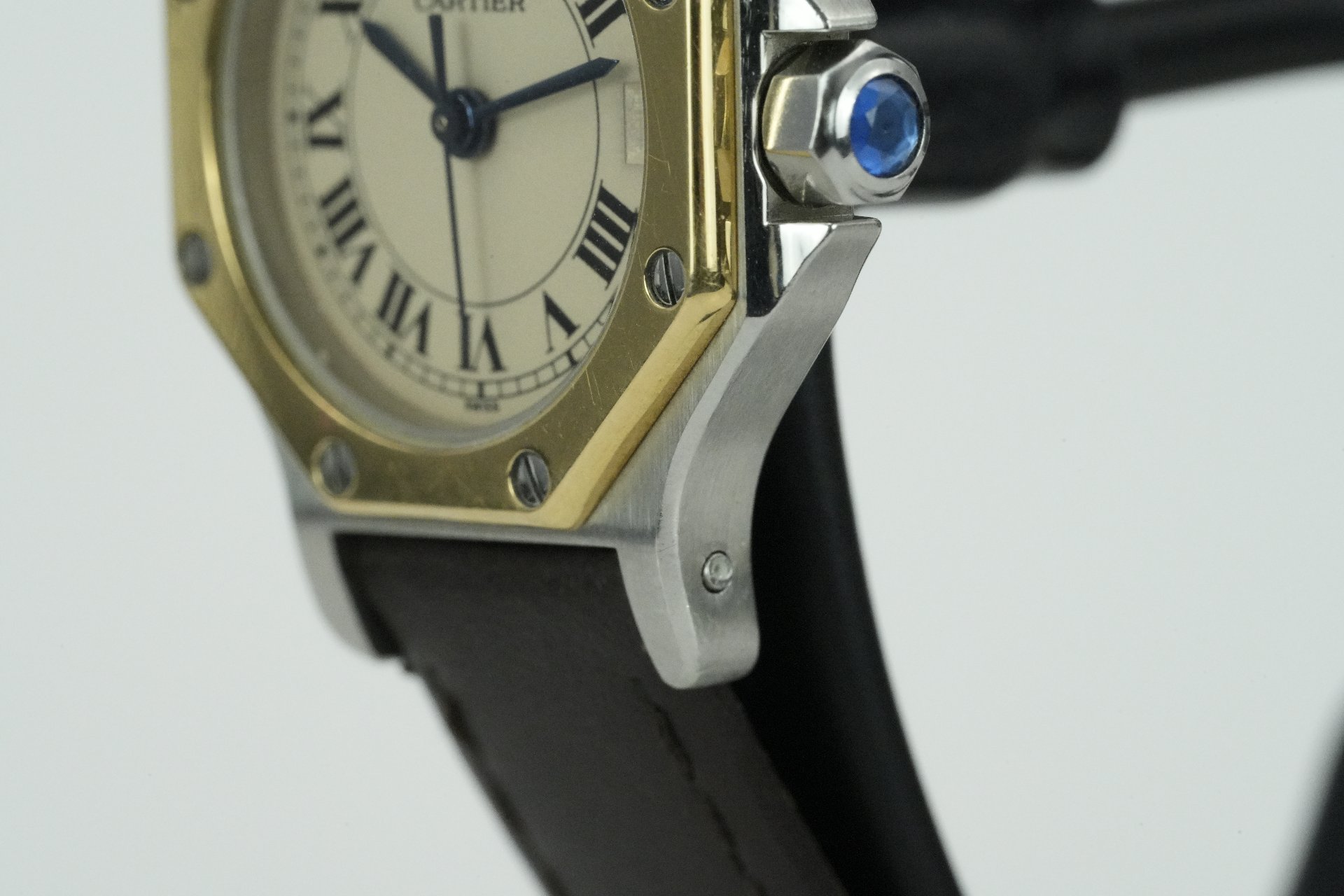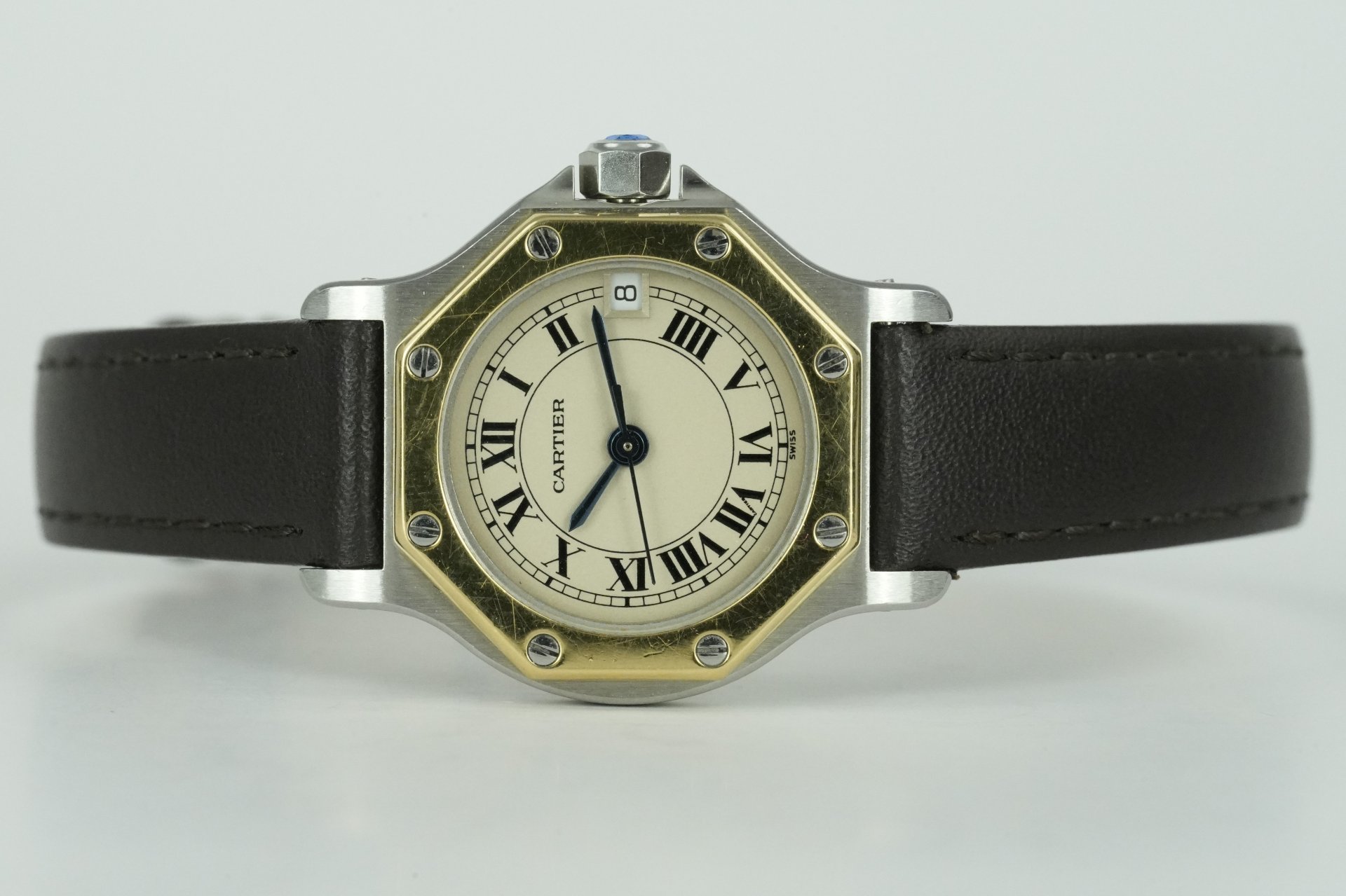 Découvrez la Cartier Santos Octogonale, référence commerciale 187903, une montre qui allie avec raffinement l’élégance classique et une esthétique distinctive. Conçue pour la femme exigeante, cette pièce iconique présente un boîtier octogonal de 25mm en or et acier, avec une fine épaisseur de 6.5mm, soulignant son profil délicat. Animée par un mouvement Quartz, elle assure une précision remarquable au quotidien. Le bracelet en cuir brun non-original, agrémenté d’une boucle ardillon non-originale, confère à cette montre un charme intemporel. Livrée seule, cette Cartier Santos Octogonale est proposée en bon état et bénéficie d’une garantie de 12 mois.