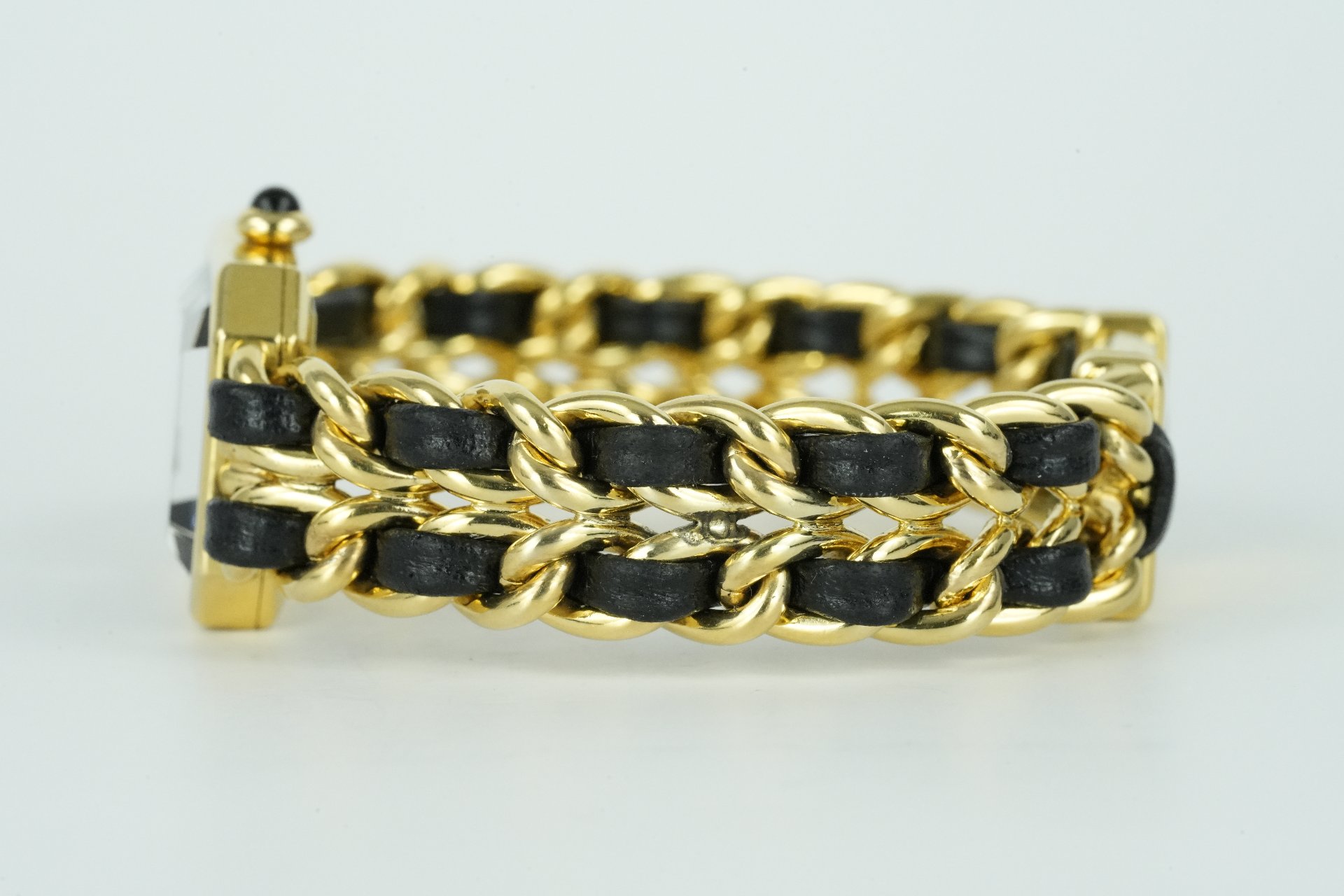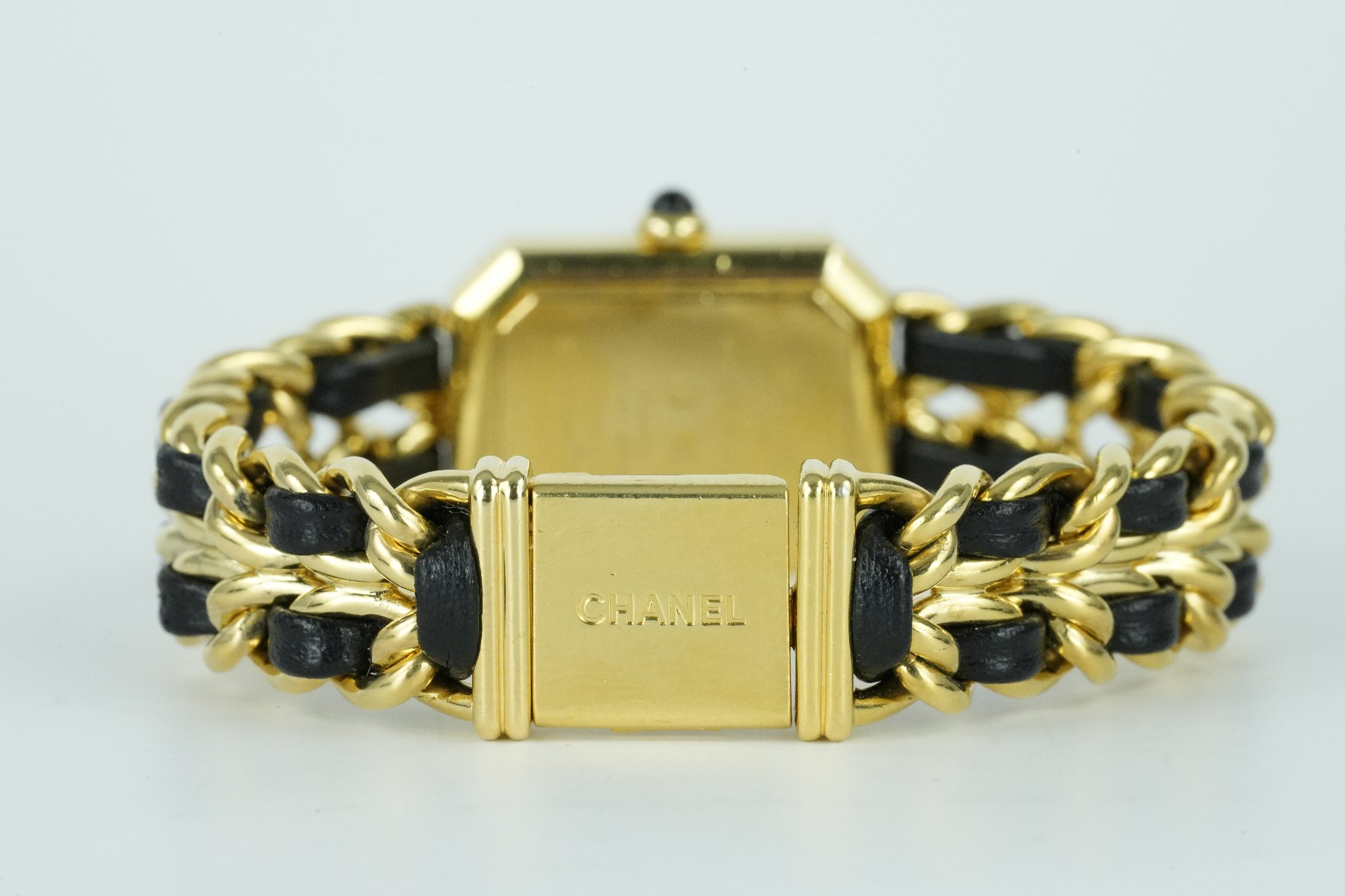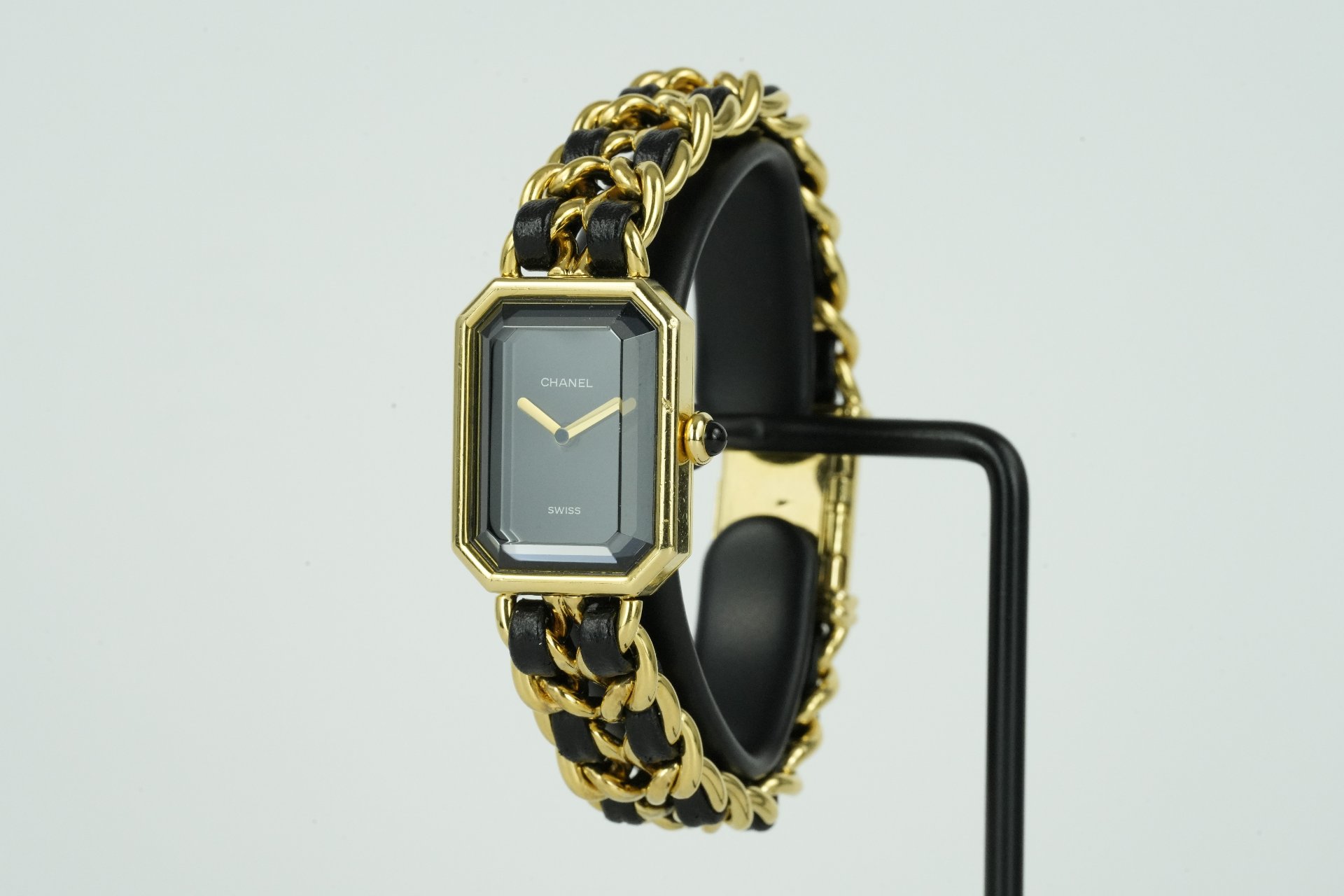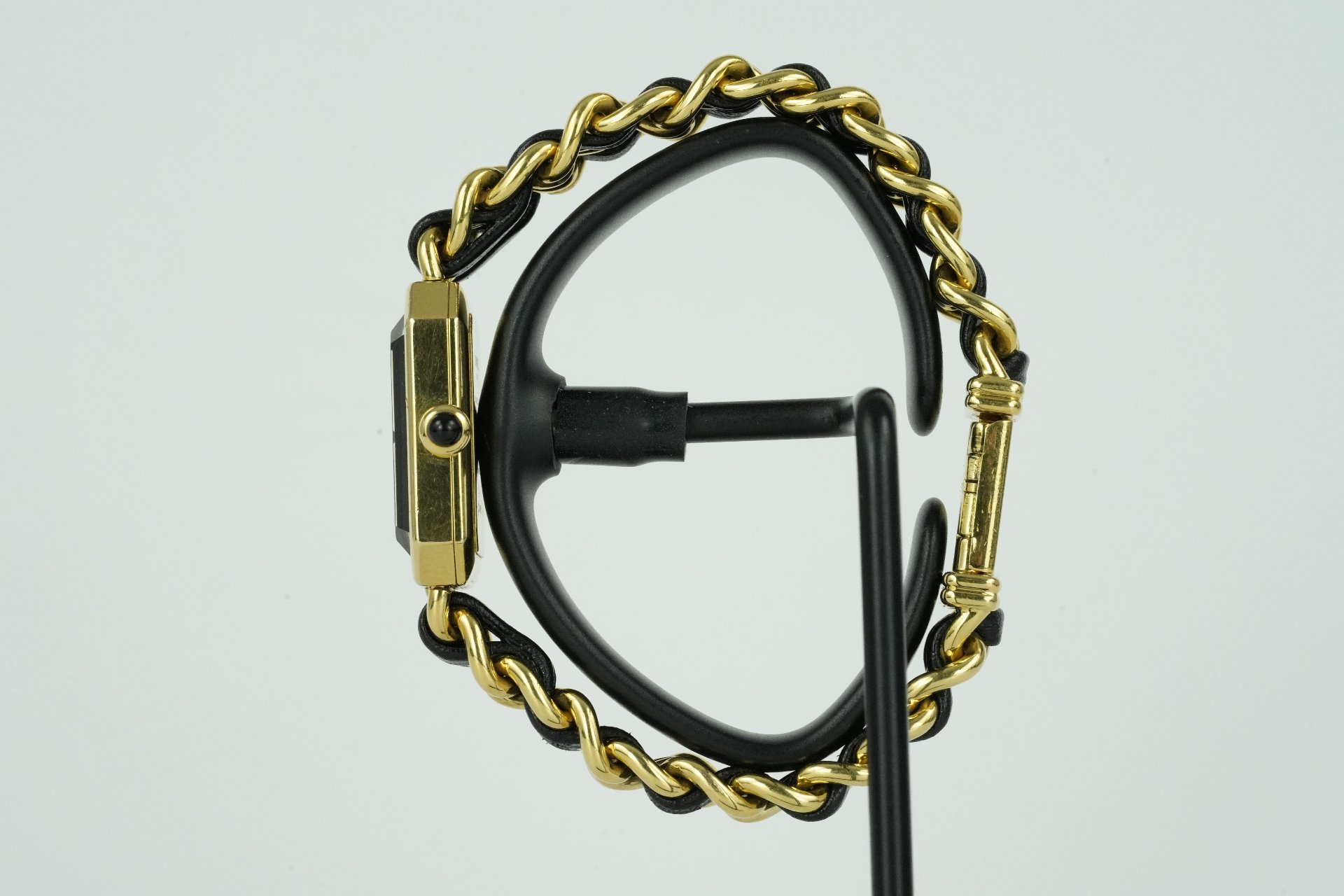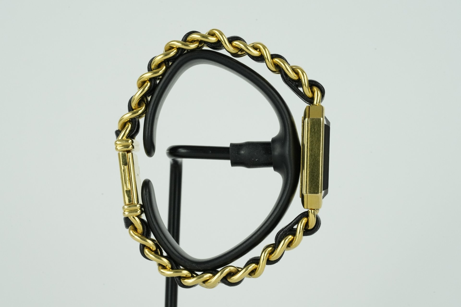 Découvrez l’élégance intemporelle avec cette montre Chanel Première, Référence H0001 (TOT-01671), une icône de raffinement conçue pour la femme moderne. Son boîtier plaqué or de 20 mm de diamètre et 7.1 mm d’épaisseur abrite un mouvement à Quartz précis. Le bracelet en acier doré, original, s’harmonise parfaitement avec le fermoir bijoux également authentique, assurant une allure sophistiquée. Bien que la montre soit livrée seule, son bon état témoigne de son intégrité. Ce garde-temps est accompagné d’une garantie de 12 mois, gage de votre tranquillité.