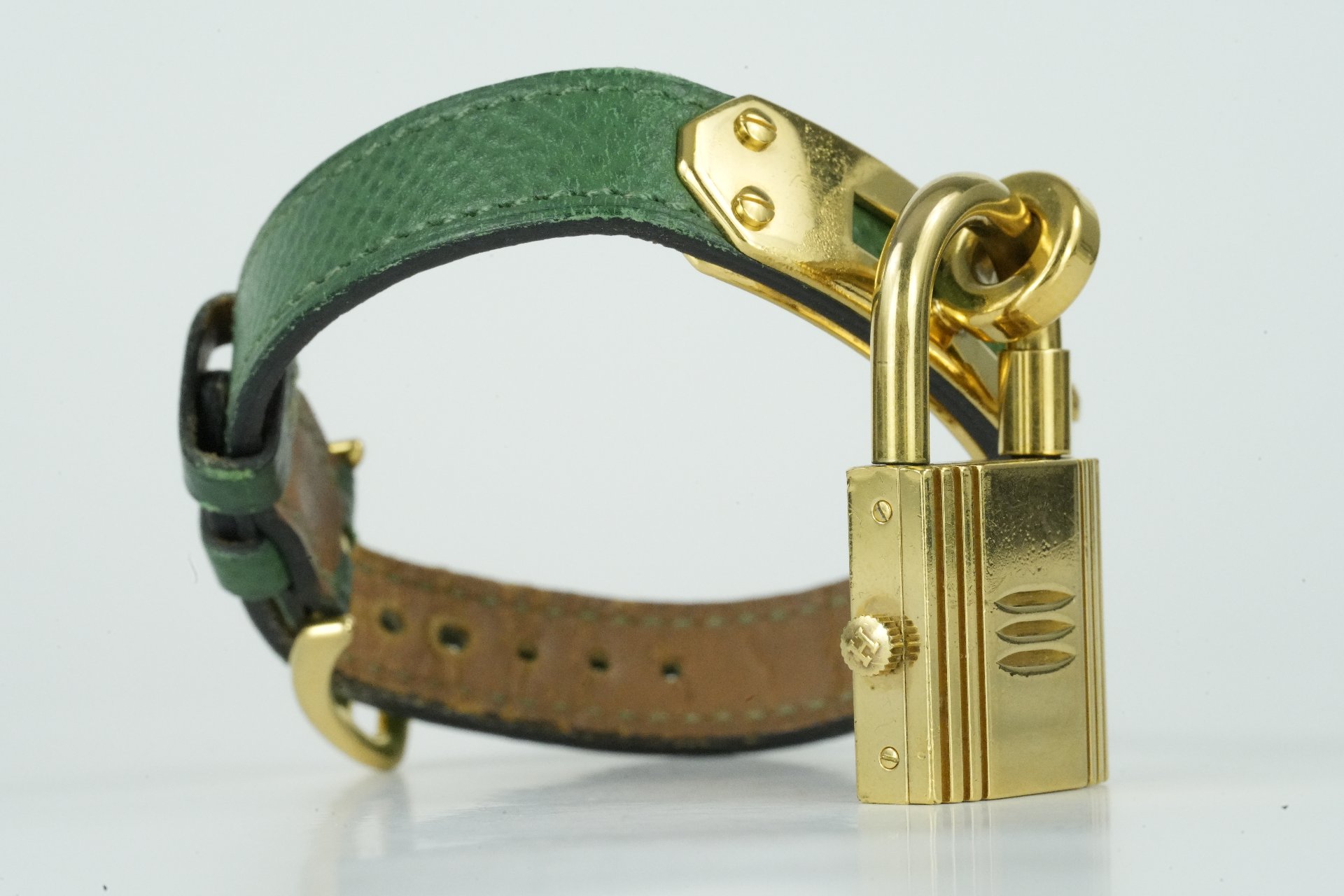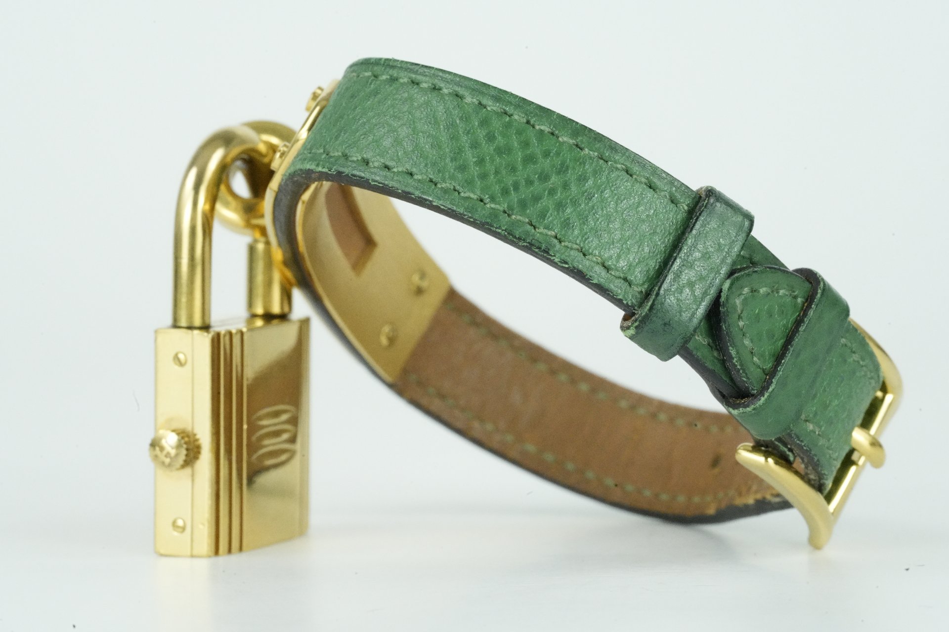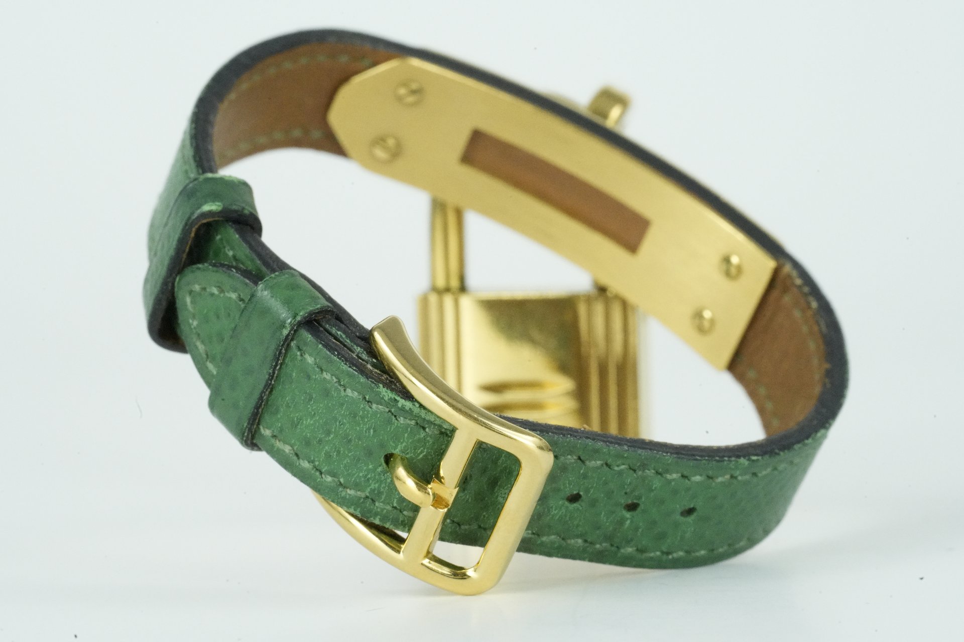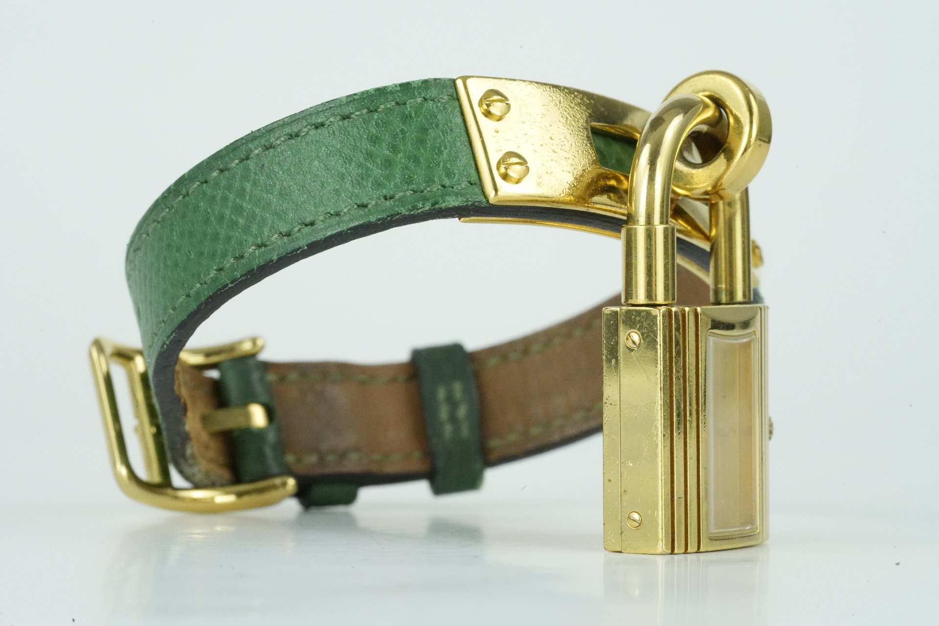Découvrez l’élégance intemporelle avec cette montre Hermès Kelly, référence commerciale KE1.210. Conçue pour la femme, elle incarne le raffinement emblématique de la maison Hermès. Son boîtier plaqué or de 20mm de diamètre et d’une épaisseur de 8.7mm abrite un mouvement à Quartz précis. Le bracelet en cuir vert, original et distinctif, est assorti d’une boucle ardillon également originale. Cette pièce est livrée seule et bénéficie d’une garantie de 12 mois.