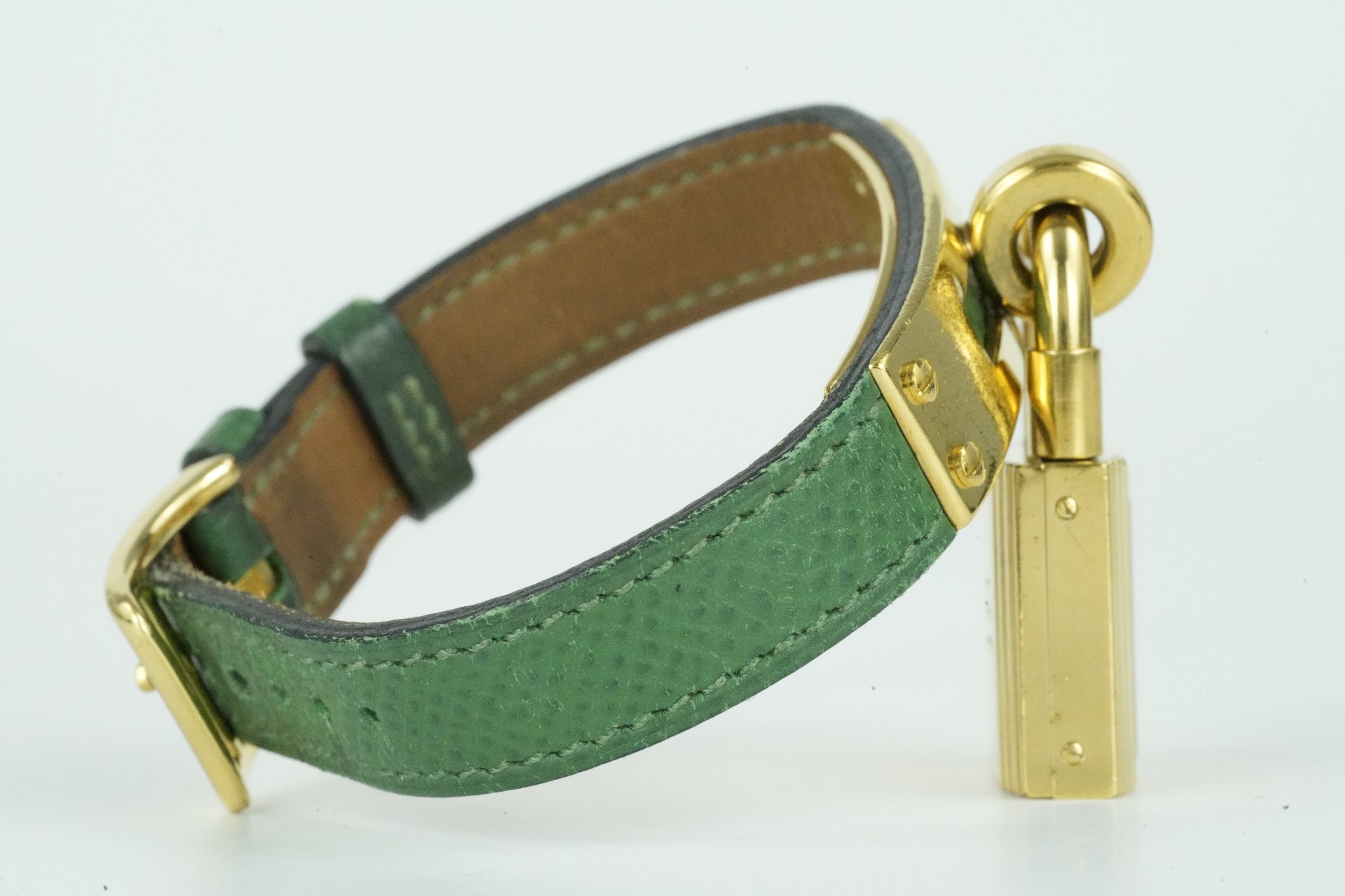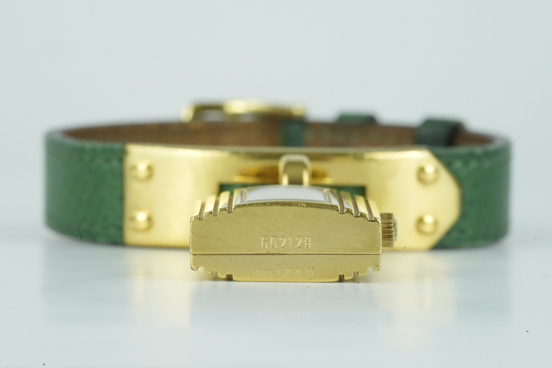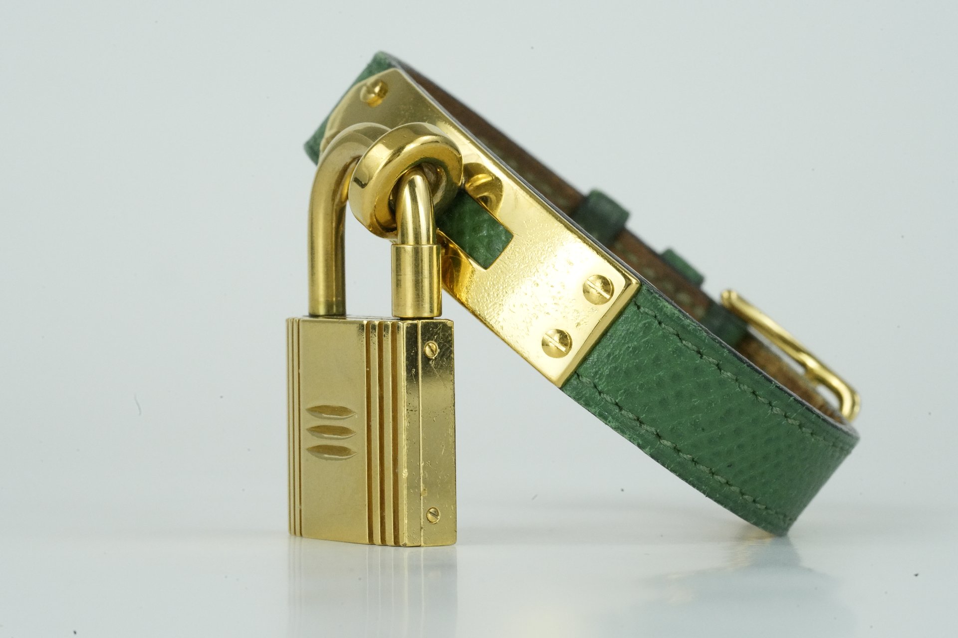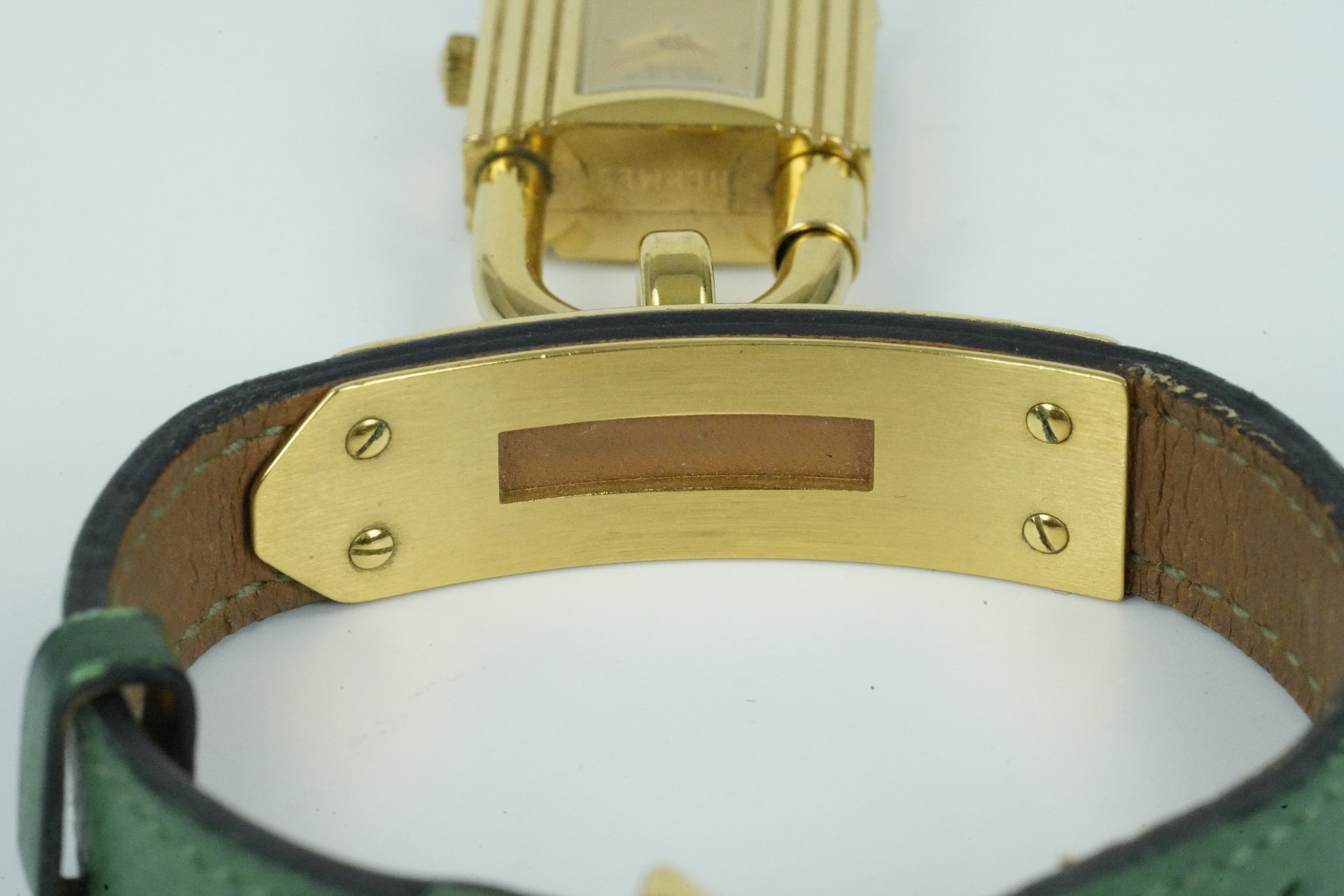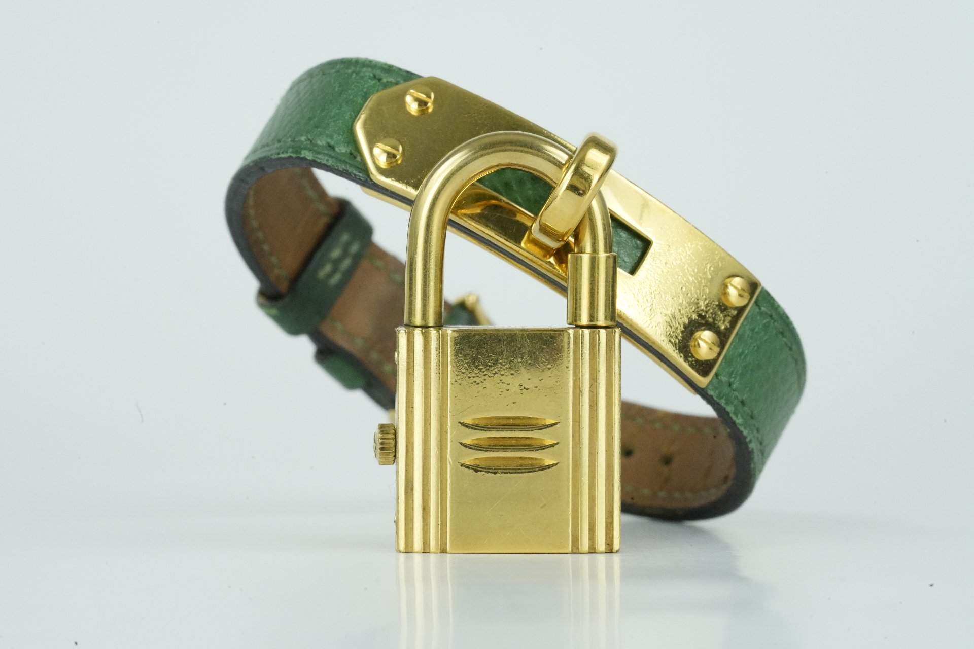 Découvrez l’élégance intemporelle avec cette montre Hermès Kelly, référence commerciale KE1.210. Conçue pour la femme, elle incarne le raffinement emblématique de la maison Hermès. Son boîtier plaqué or de 20mm de diamètre et d’une épaisseur de 8.7mm abrite un mouvement à Quartz précis. Le bracelet en cuir vert, original et distinctif, est assorti d’une boucle ardillon également originale. Cette pièce est livrée seule et bénéficie d’une garantie de 12 mois.