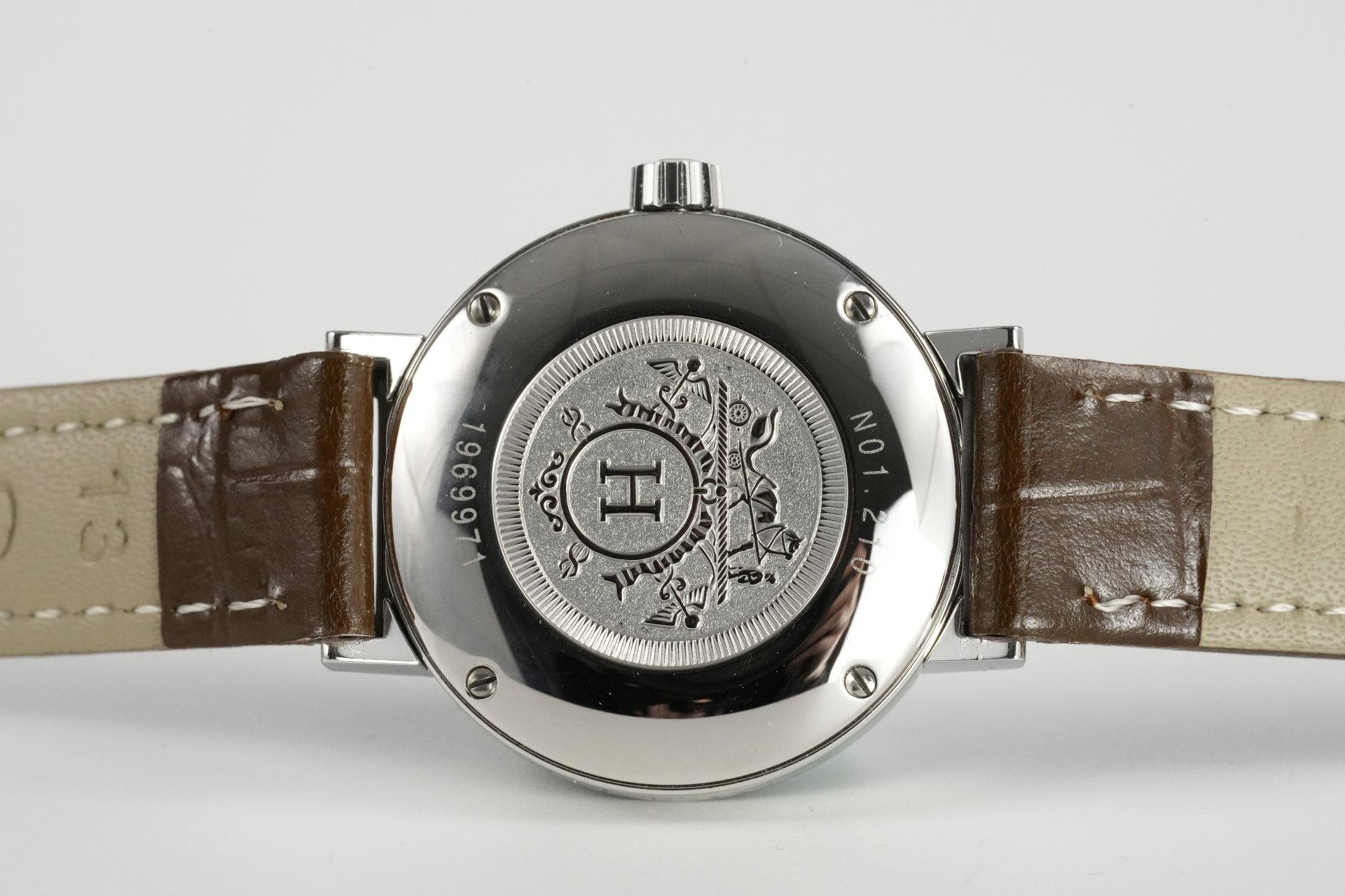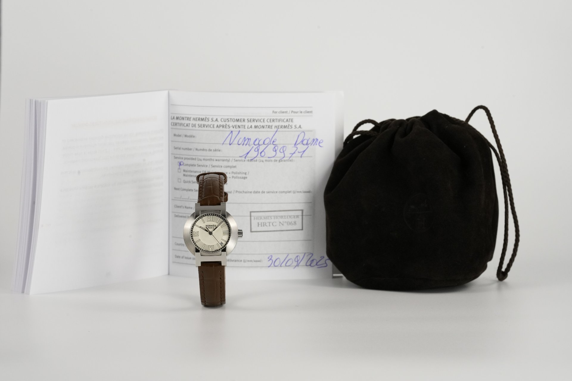 Découvrez l’élégance intemporelle de la montre Hermès Nomade, référence commerciale NO1.210, un garde-temps conçu pour la femme moderne. Son boîtier en acier de 27.5mm de diamètre et 8.5mm d’épaisseur abrite un mouvement à remontage automatique, gage de précision et de raffinement. Étanche jusqu’à 5 ATM, cette pièce allie fonctionnalité et style. Le bracelet en cuir brun non-original, agrémenté d’une boucle ardillon non-originale, confère à cette montre un charme distinctif. Livrée avec son coffret, cette Hermès Nomade, en bon état, a bénéficié d’une révision en septembre 2025 et est accompagnée d’une garantie de 24 mois, soulignant son excellente condition.