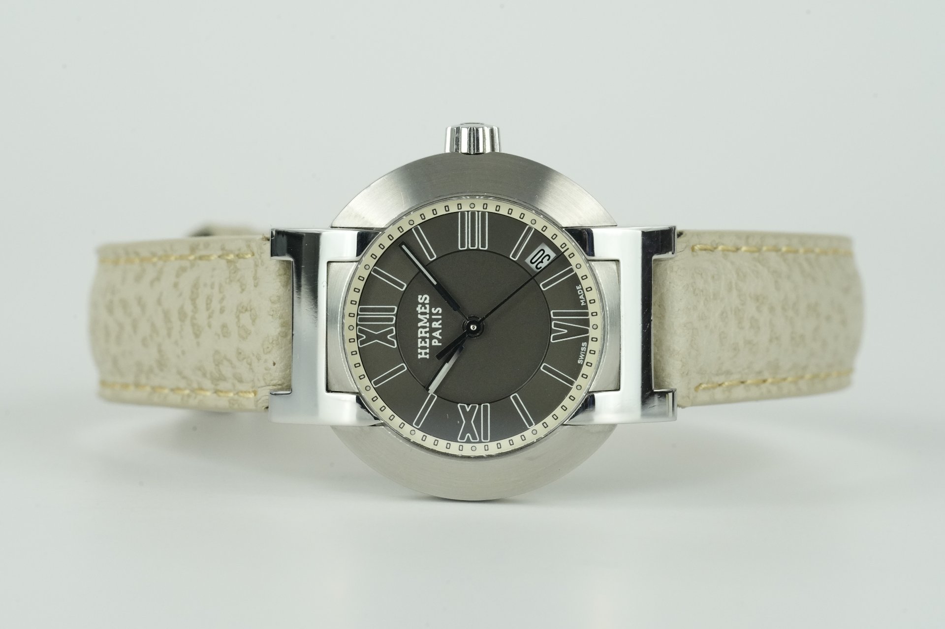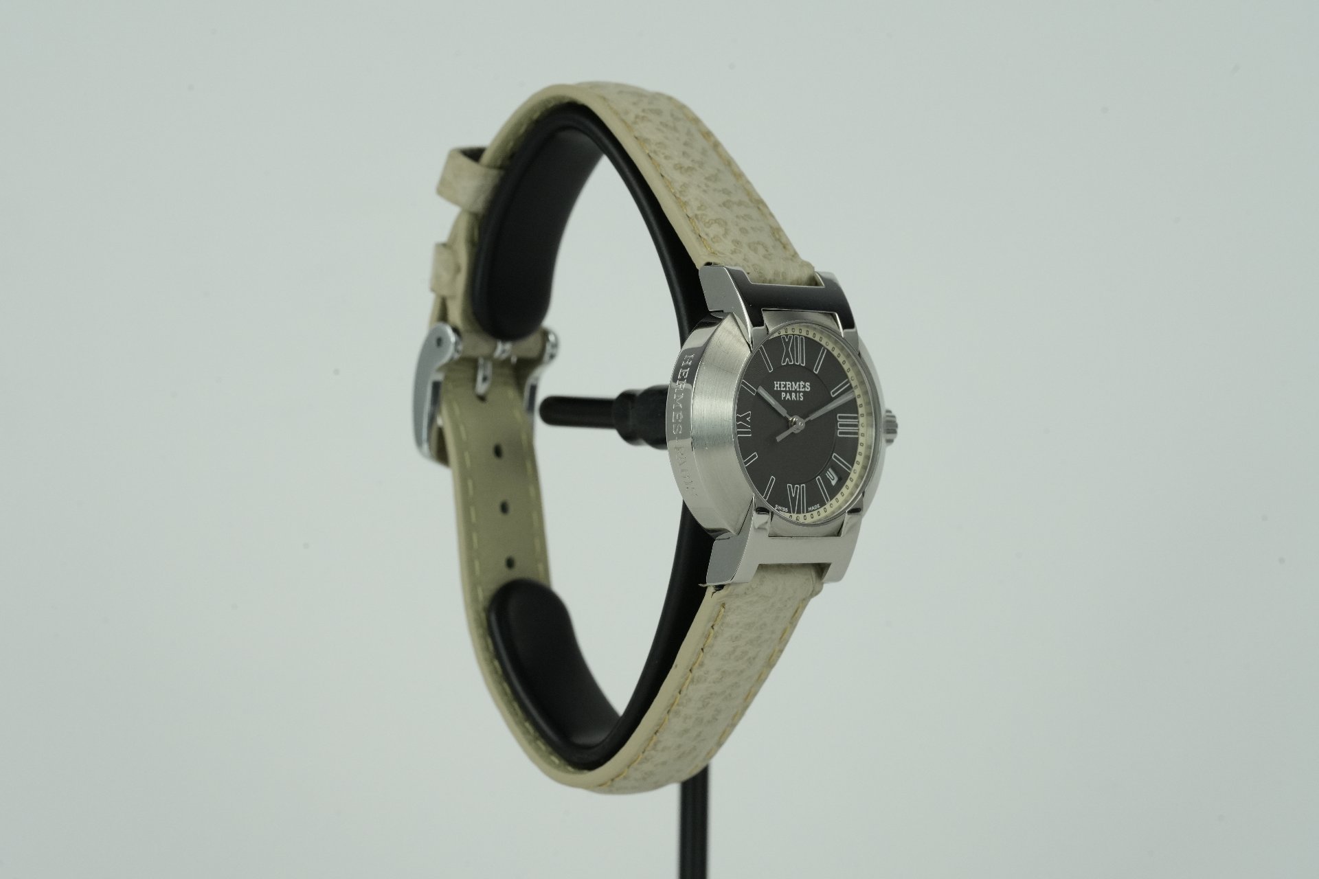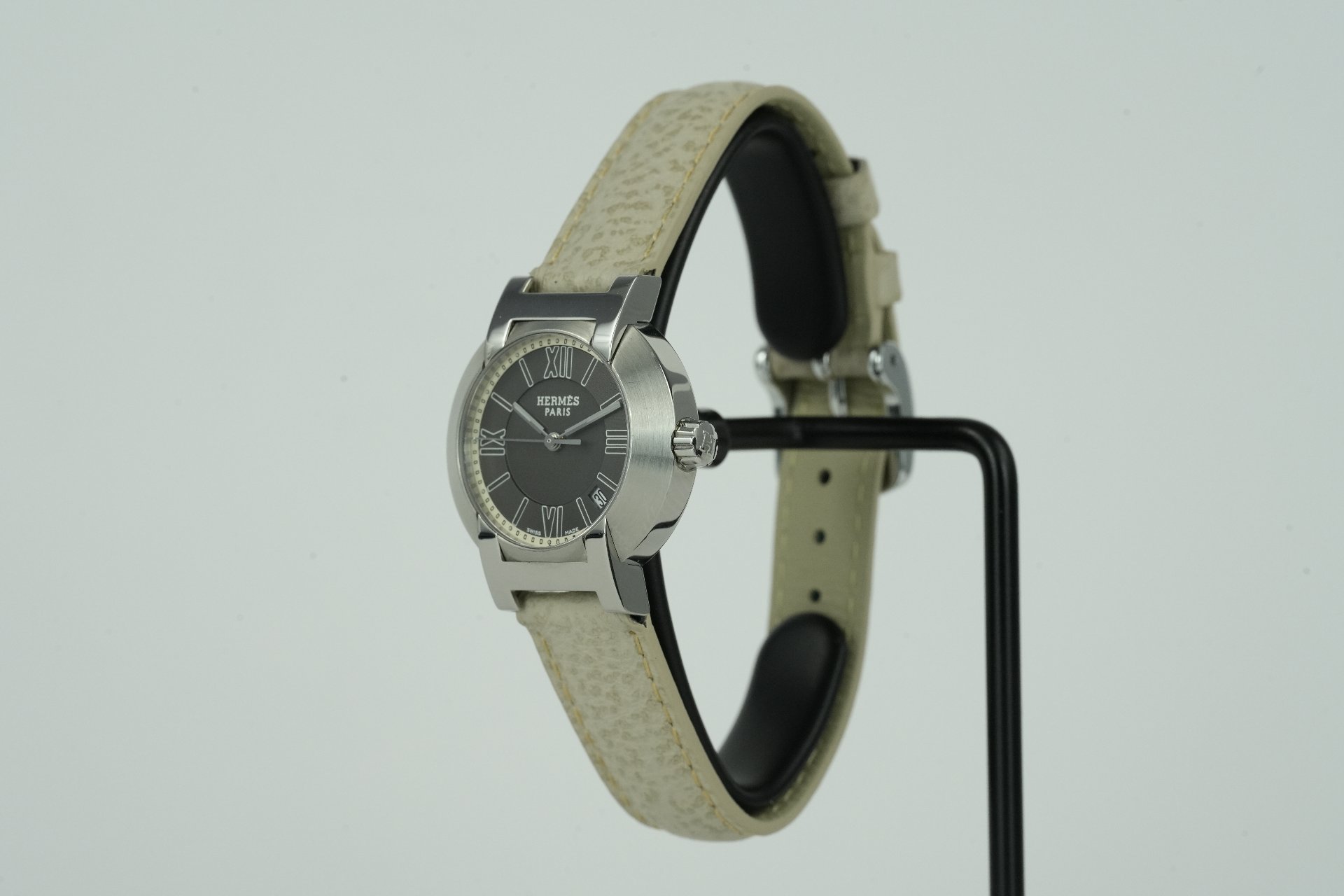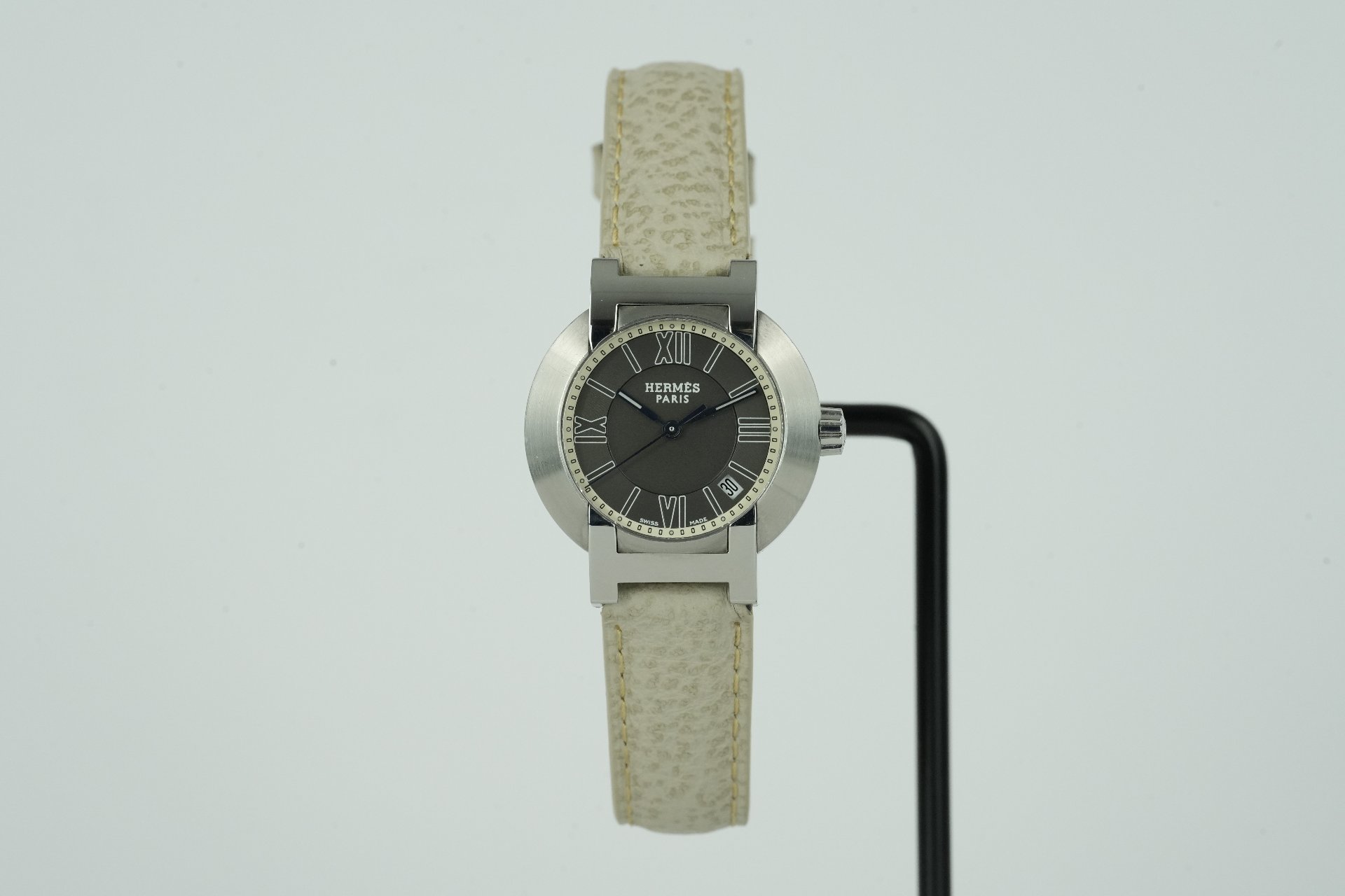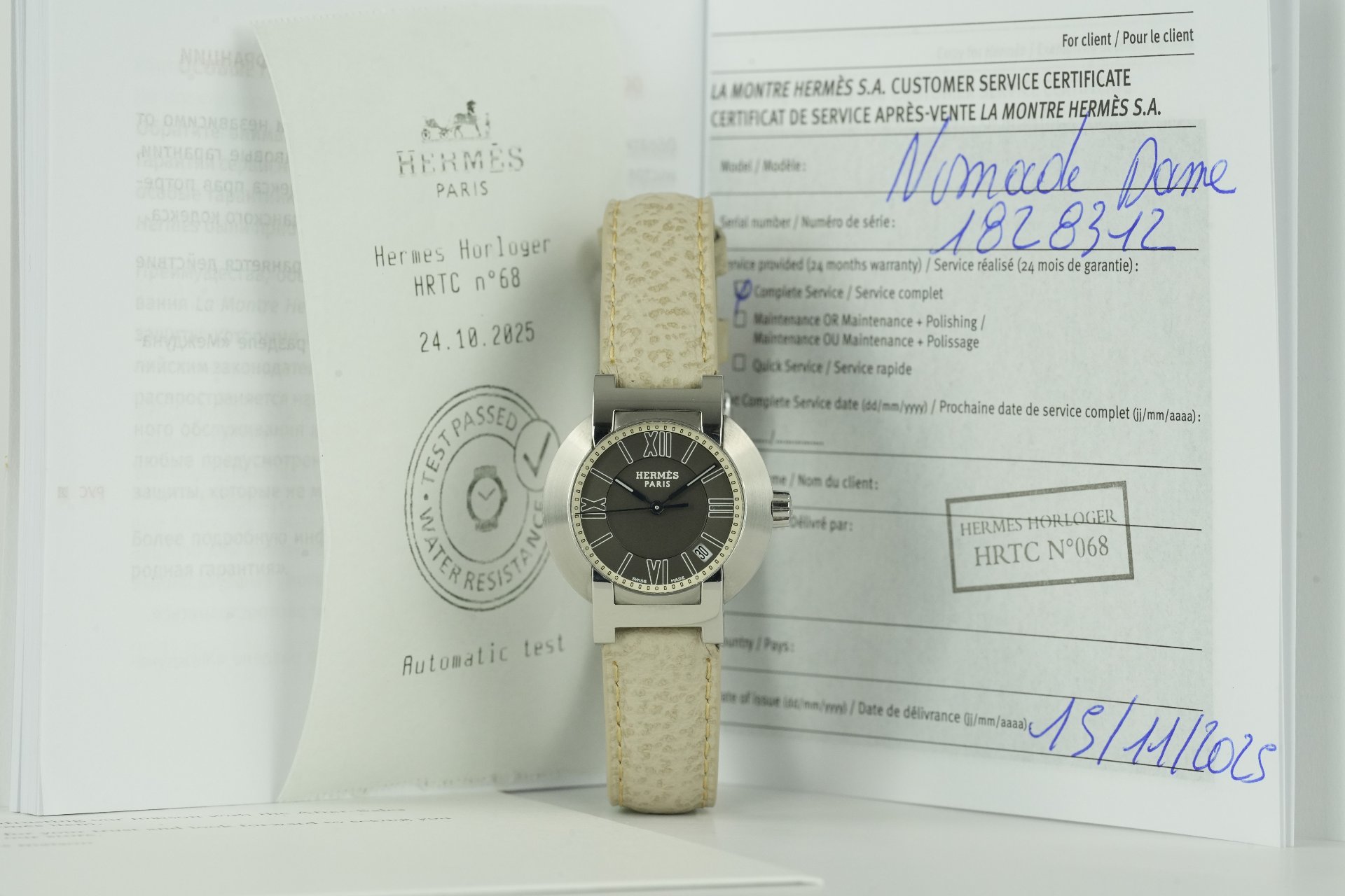 Découvrez l’élégance intemporelle avec cette montre Hermès Nomade, référence commerciale NO1.210 (TOT-01351). Conçue pour la femme moderne, elle incarne la discrétion et le raffinement. Animée par un mouvement à remontage automatique, elle offre une précision et une fiabilité irréprochables. Son boîtier en acier de 27.5mm de diamètre et 8.5mm d’épaisseur garantit un confort optimal au poignet. L’étanchéité de 5 ATM assure une résistance à l’eau pour un usage quotidien. Cette montre, en très bon état, est livrée seule. La révision et le polissage datant de novembre 2025, réalisé par Hermès, assure une garantie de 24 mois. Son bracelet en cuir blanc et sa boucle ardillon, bien que non originaux, complètent harmonieusement son design épuré.