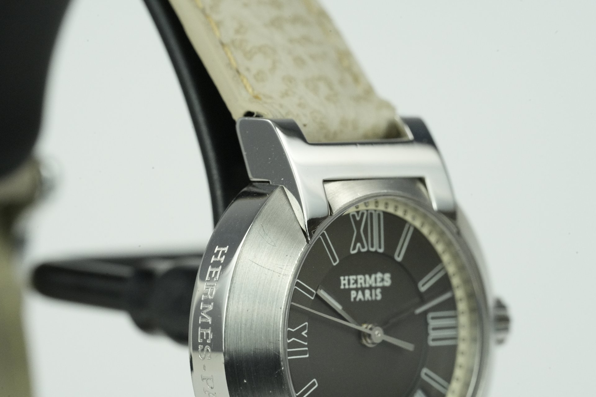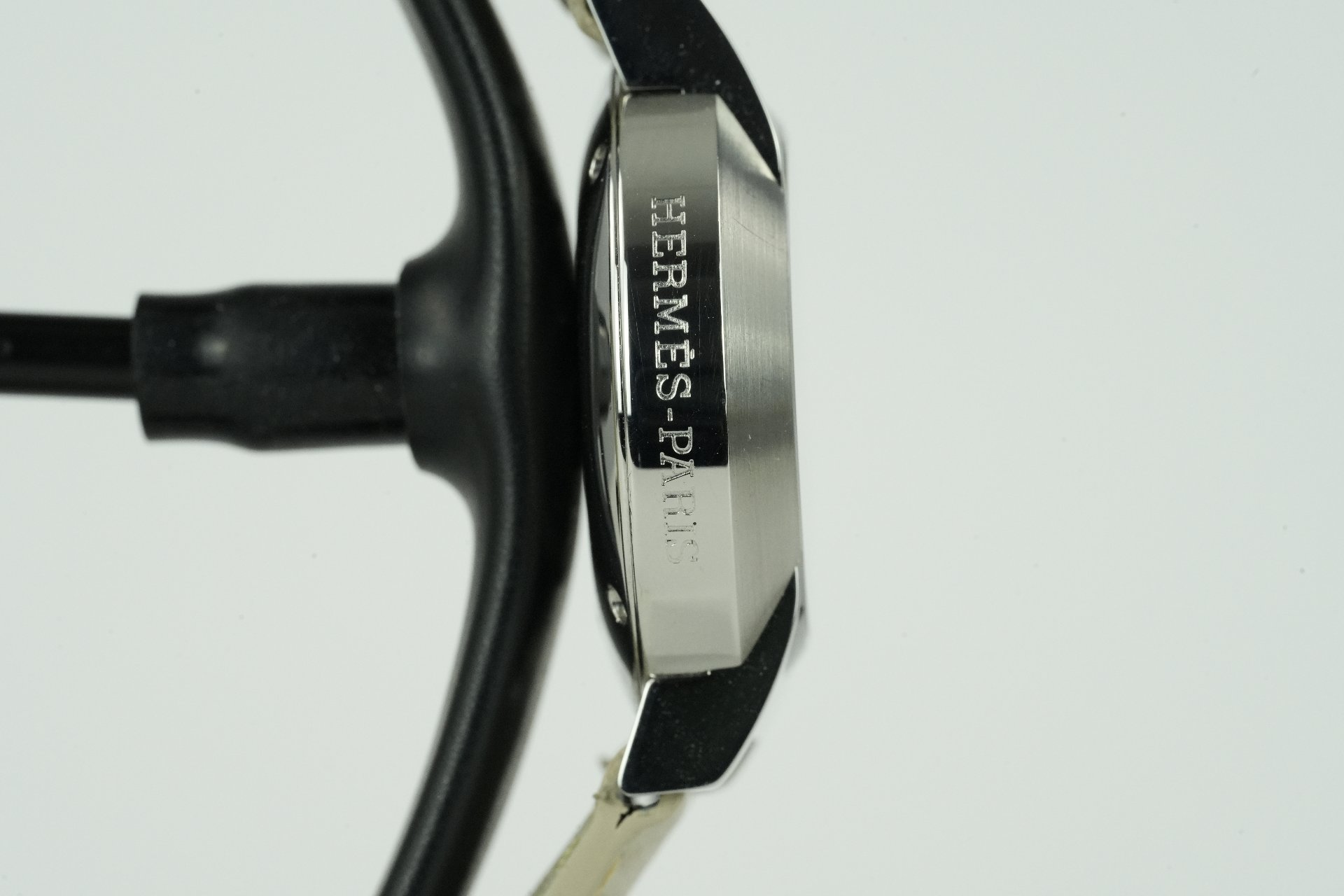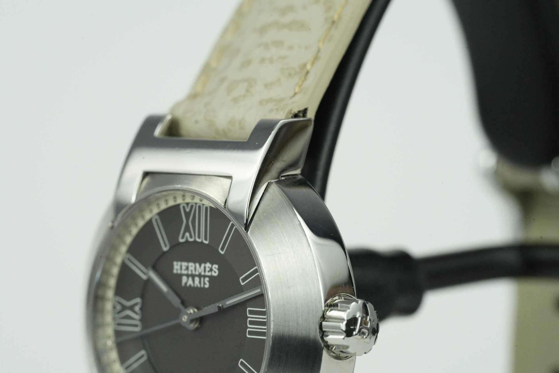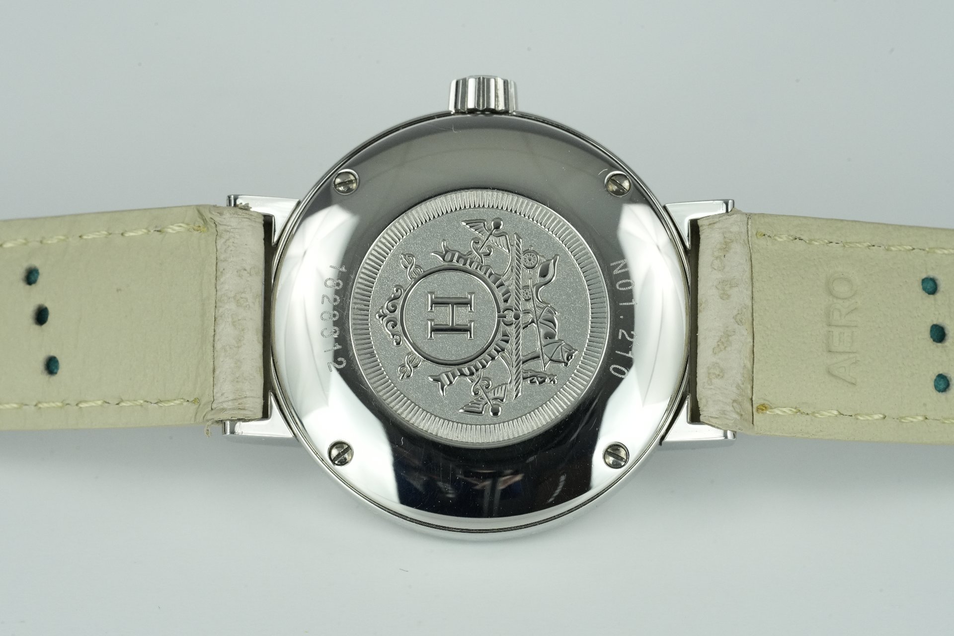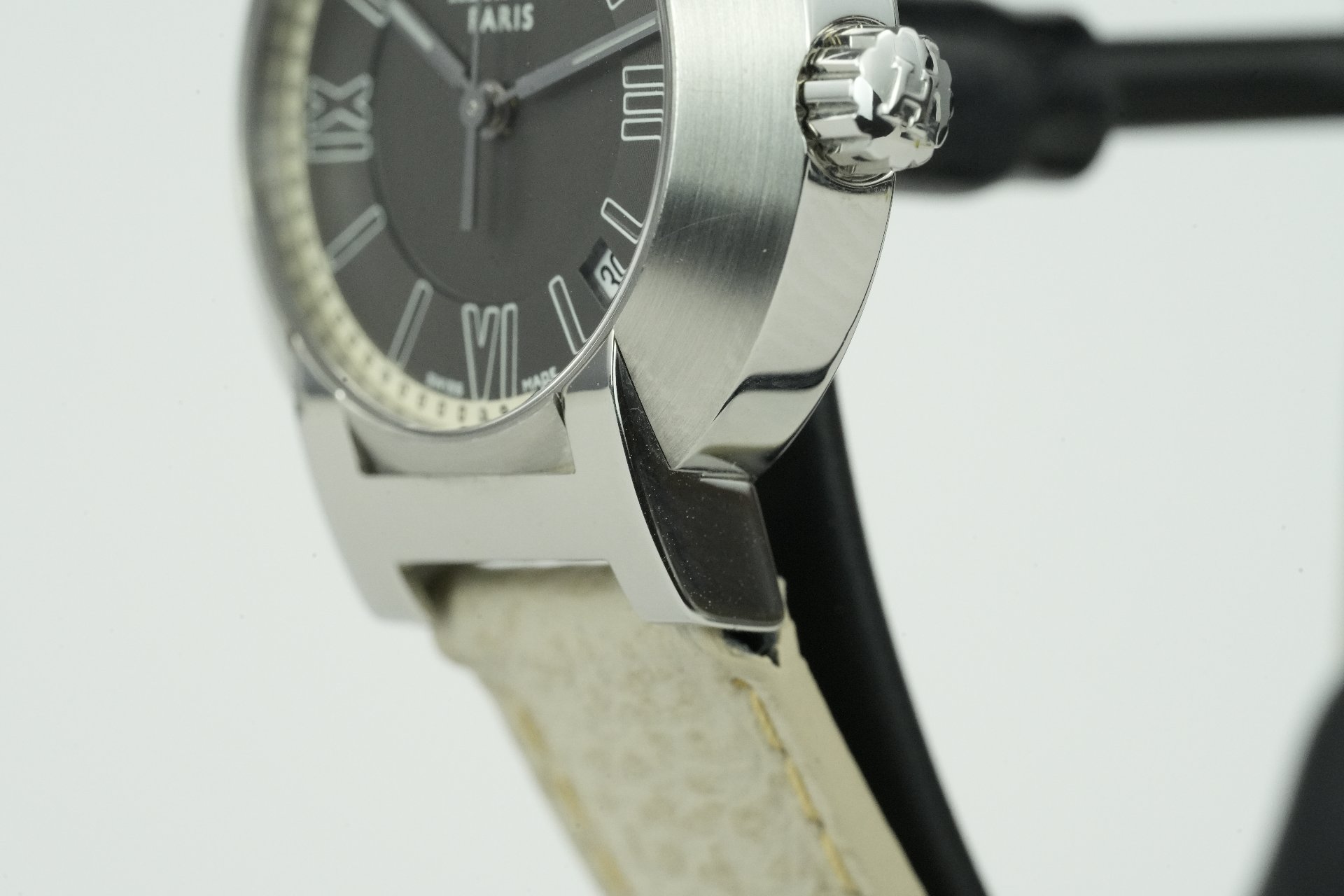 Découvrez l’élégance intemporelle avec cette montre Hermès Nomade, référence commerciale NO1.210 (TOT-01351). Conçue pour la femme moderne, elle incarne la discrétion et le raffinement. Animée par un mouvement à remontage automatique, elle offre une précision et une fiabilité irréprochables. Son boîtier en acier de 27.5mm de diamètre et 8.5mm d’épaisseur garantit un confort optimal au poignet. L’étanchéité de 5 ATM assure une résistance à l’eau pour un usage quotidien. Cette montre, en très bon état, est livrée seule. La révision et le polissage datant de novembre 2025, réalisé par Hermès, assure une garantie de 24 mois. Son bracelet en cuir blanc et sa boucle ardillon, bien que non originaux, complètent harmonieusement son design épuré.
