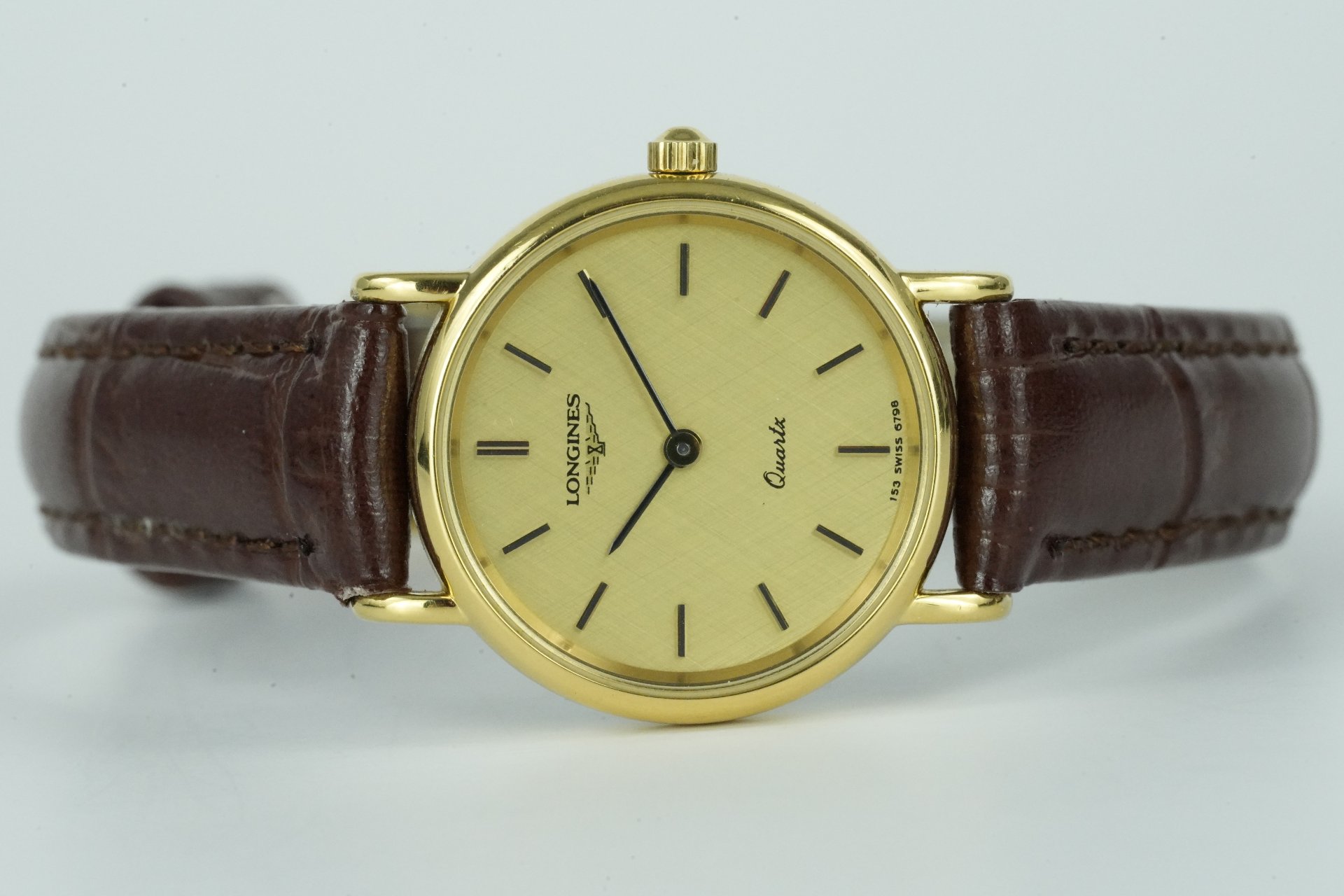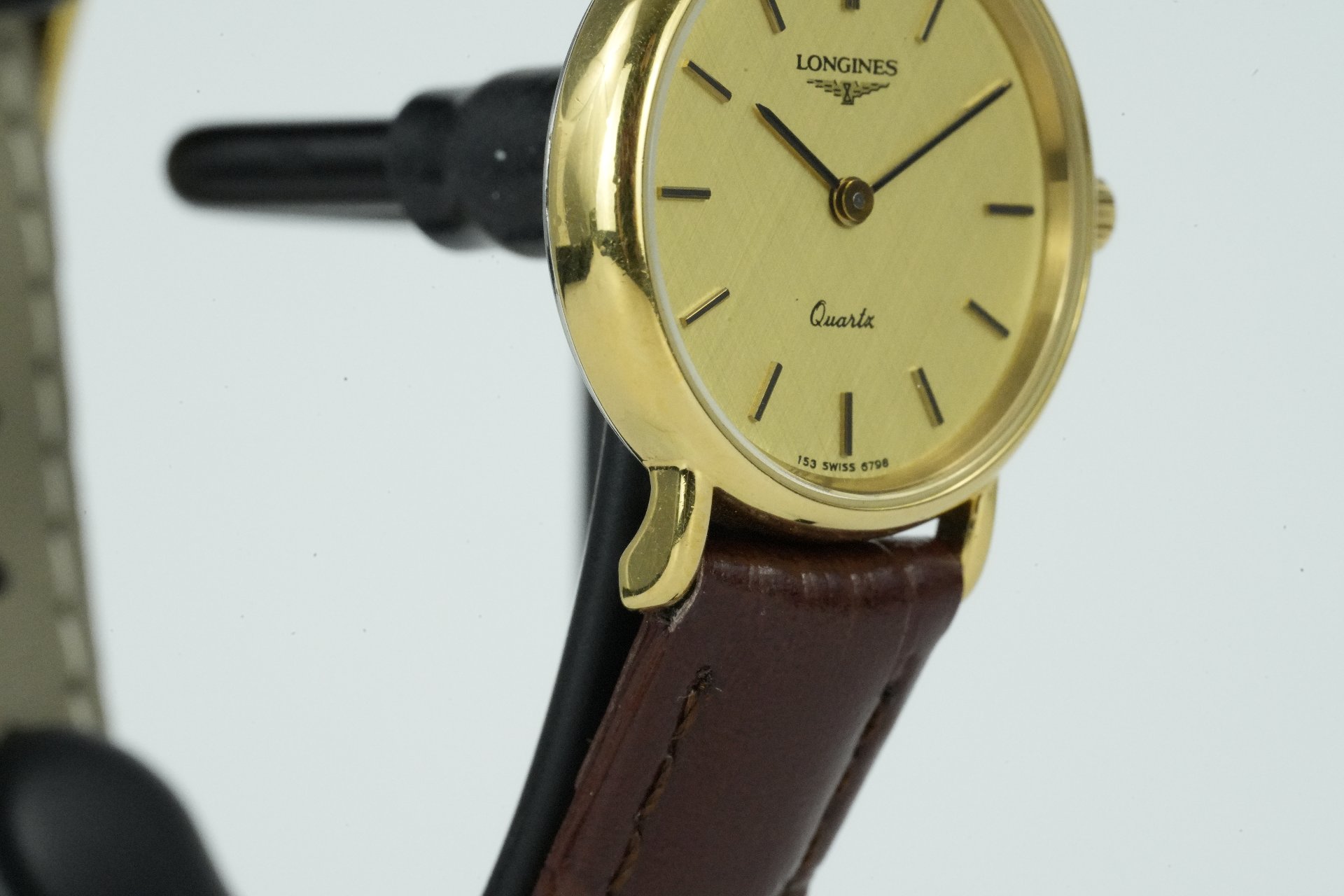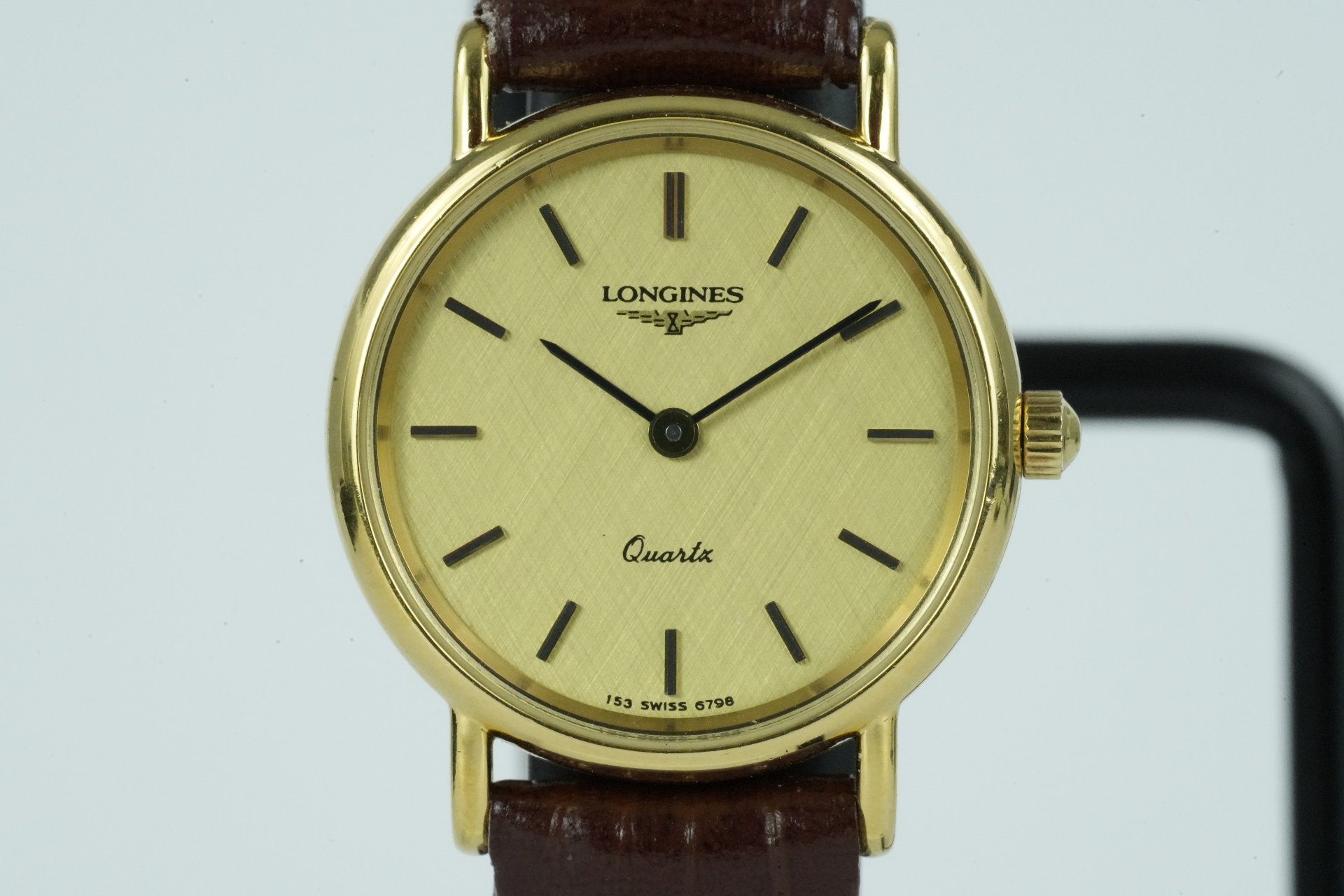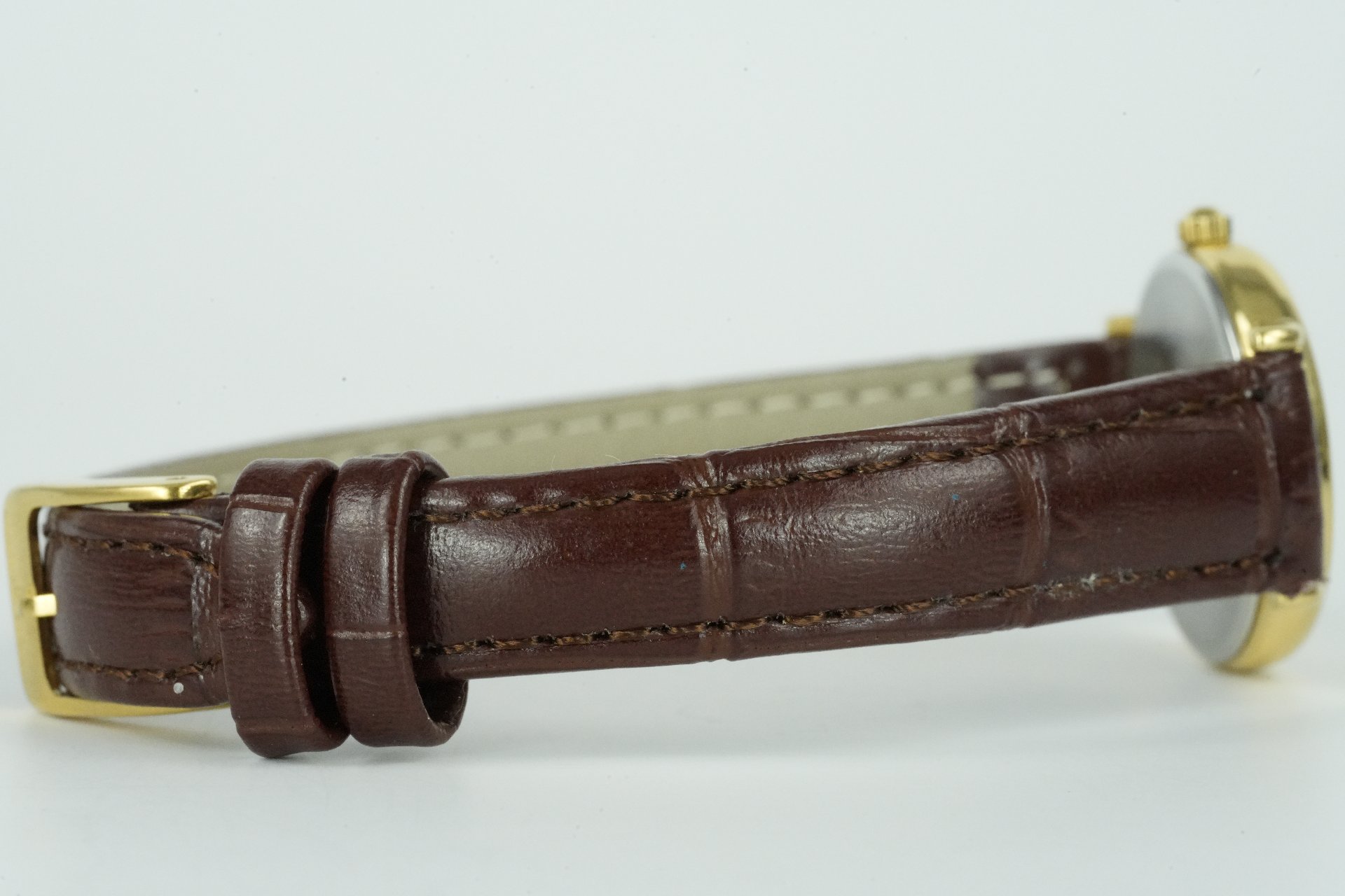 Découvrez cette élégante montre Longines Modèle Quartz, référence commerciale 153 6798 (TOT-01590), un témoignage raffiné de l’horlogerie féminine. Son boîtier plaqué or de 23,5mm de diamètre et 5mm d’épaisseur abrite un mouvement Quartz précis. Le cadran, discret et intemporel, est accompagné d’un bracelet en cuir brun non-original, contrastant avec sa boucle ardillon d’origine, signée Longines. Cette pièce, présentée en bon état, est livrée seule. Elle bénéficie d’une garantie de 12 mois.